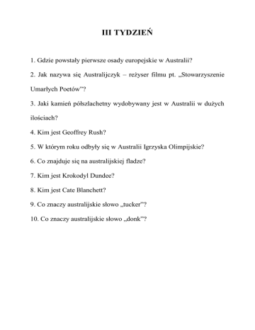 III TYDZIEŃ 1. Gdzie powstały pierwsze osady europejskie w Australii? 2. Jak nazywa się Australijczyk – reżyser filmu pt. „Stowarzyszenie Umarłych Poetów”? 3. Jaki kamień półszlachetny wydobywany jest w Australii w dużych ilościach? 4. Kim jest Geoffrey Rush? 5. W którym roku odbyły się w Australii Igrzyska Olimpijskie? 6. Co znajduje się na australijskiej fladze? 7. Kim jest Krokodyl Dundee? 8. Kim jest Cate Blanchett? 9. Co znaczy australijskie słowo „tucker”? 10. Co znaczy australijskie słowo „donk”?