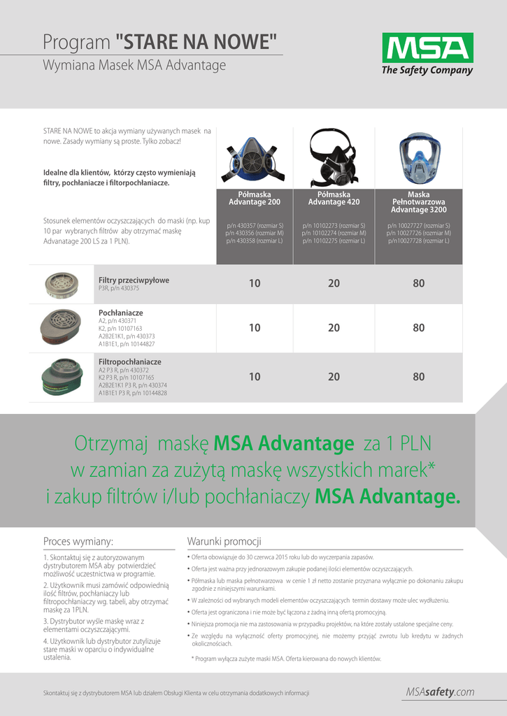 Program "STARE NA NOWE" Wymiana Masek MSA Advantage STARE NA NOWE to akcja wymiany używanych masek na nowe. Zasady wymiany są proste. Tylko zobacz! Idealne dla klientów, którzy często wymieniają filtry, pochłaniacze i filtorpochłaniacze. Stosunek elementów oczyszczających do maski (np. kup 10 par wybranych filtrów aby otrzymać maskę Advanatage 200 LS za 1 PLN). Półmaska Advantage 200 Półmaska Advantage 420 Maska Pełnotwarzowa Advantage 3200 p/n 430357 (rozmiar S) p/n 430356 (rozmiar M) p/n 430358 (rozmiar L) p/n 10102273 (rozmiar S) p/n 10102274 (rozmiar M) p/n 10102275 (rozmiar L) p/n 10027727 (rozmiar S) p/n 10027726 (rozmiar M) p/n10027728 (rozmiar L) 10 20 80 10 20 80 10 20 80 Filtry przeciwpyłowe P3R, p/n 430375 Pochłaniacze A2, p/n 430371 K2, p/n 10107163 A2B2E1K1, p/n 430373 A1B1E1, p/n 10144827 Filtropochłaniacze A2 P3 R, p/n 430372 K2 P3 R, p/n 10107165 A2B2E1K1 P3 R, p/n 430374 A1B1E1 P3 R, p/n 10144828 Otrzymaj maskę MSA Advantage za 1 PLN w zamian za zużytą maskę wszystkich marek* i zakup filtrów i/lub pochłaniaczy MSA Advantage. Proces wymiany: Warunki promocji 1. Skontaktuj się z autoryzowanym dystrybutorem MSA aby potwierdzieć możliwość uczestnictwa w programie. 2. Użytkownik musi zamówić odpowiednią ilość filtrów, pochłaniaczy lub filtropochłaniaczy wg. tabeli, aby otrzymać maskę za 1PLN. 3. Dystrybutor wyśle maskę wraz z elementami oczyszczającymi. 4. Użytkownik lub dystrybutor zutylizuje stare maski w oparciu o indywidualne ustalenia. • Oferta obowiązuje do 30 czerwca 2015 roku lub do wyczerpania zapasów. • Oferta jest ważna przy jednorazowym zakupie podanej ilości elementów oczyszczających. • Półmaska lub maska pełnotwarzowa w cenie 1 zł netto zostanie przyznana wyłącznie po dokonaniu zakupu zgodnie z niniejszymi warunkami. • W zależności od wybranych modeli elementów oczyszczających termin dostawy może ulec wydłużeniu. • Oferta jest ograniczona i nie może być łączona z żadną inną ofertą promocyjną. • Niniejsza promocja nie ma zastosowania w przypadku projektów, na które zostały ustalone specjalne ceny. • Ze względu na wyłączność oferty promocyjnej, nie możemy przyjąć zwrotu lub kredytu w żadnych okolicznościach. * Program wyłącza zużyte maski MSA. Oferta kierowana do nowych klientów. Skontaktuj się z dystrybutorem MSA lub działem Obsługi Klienta w celu otrzymania dodatkowych informacji MSAsafety.com
