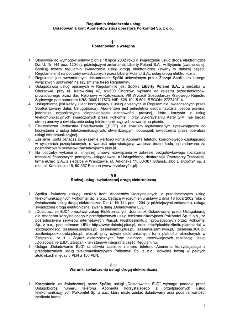 Regulamin świadczenia usług Doładowania kont Abonentów sieci operatora Polkomtel Sp. z o.o.. §I Postanowienia wstępne 1. Stosownie do wymogów ustawy z dnia 18 lipca 2002 roku o świadczeniu usług drogą elektroniczną Dz. U. Nr 144 poz. 1204 (z późniejszymi zmianami), Liberty Poland S.A., w Bytomiu (zwana dalej: Spółką) tworzy regulamin świadczenia usług drogą elektroniczną (zwany w dalszej części: Regulaminem) na potrzeby świadczonych przez Liberty Poland S.A., usług drogą elektroniczną. 2. Regulamin jest wewnętrznym dokumentem Spółki uchwalonym przez Zarząd Spółki, do którego wyłącznych uprawnień należy zmiana treści Regulaminu. 3. Usługodawcą usług opisanych w Regulaminie jest Spółka Liberty Poland S.A., z siedzibą w Chorzowie, przy ul. Katowickiej 47, 41-500 Chorzów, wpisana do rejestru przedsiębiorców, prowadzonego przez Sąd Rejonowy w Katowicach, VIII Wydział Gospodarczy Krajowego Rejestru Sądowego pod numerem KRS: 0000127573, NIP: 626-10-15-601, REGON: 272740714. 4. Usługobiorcą jest każdy klient korzystający z usług opisanych w Regulaminie, świadczonych przez Spółkę (zwany dalej: Usługobiorcą). Abonentem jest pełnoletnia osoba fizyczna, osoba prawna, jednostka organizacyjna nieposiadająca osobowości prawnej, która korzysta z usług telekomunikacyjnych świadczonych przez Polkomtel i przy wykorzystaniu Karty SIM, nie będąc stroną umowy o świadczenie usług telekomunikacyjnych zawartej na piśmie. 5. Elektroniczna Jednostka Doładowania („EJD”) jest znakiem legitymacyjnym uprawniającymi do korzystania z usług telekomunikacyjnych, stwierdzającymi obowiązek świadczenia przez operatora usługi telekomunikacyjnej. 6. Zasilenie Konta oznacza zwiększenie wartości konta Abonenta telefonu komórkowego działającego w systemach przedpłaconych, o wartość odpowiadającą wartości brutto kodu, sprzedawana za pośrednictwem serwisów transakcyjnych plus.pl. 7. Na potrzeby wykonania niniejszej umowy rozwiązania w zakresie bezgotówkowego rozliczania transakcji finansowych pomiędzy Usługodawcą, a Usługobiorcą, dostarczają Operatorzy Transakcji, firma eCard S.A., z siedzibą w Warszawie, ul. Arkońska 11, 80-387 Gdańsk, albo DialCom24 sp. z o.o., ul. Kanclerska 15, 60-357 Poznań (www.przelewy24.pl). § II Rodzaj usługi świadczonej drogą elektroniczną 1. Spółka świadczy usługę zasileń kont Abonentów korzystających z przedpłaconych usług telekomunikacyjnych Polkomtel Sp. z o.o., będącą w rozumieniu ustawy z dnia 18 lipca 2002 roku o świadczeniu usług drogą elektroniczną Dz. U. Nr 144 poz. 1204 (z późniejszymi zmianami), usługą świadczoną drogą elektroniczną, zwaną dalej „Doładowanie EJD”. 2. „Doładowanie EJD” umożliwia zakup Elektronicznych Jednostek Doładowania przez Usługobiorcę dla Abonenta korzystającego z przedpłaconych usług telekomunikacyjnych Polkomtel Sp. z o.o., za pośrednictwem serwisów internetowych Plus.pl, Plushbezlimitu.pl, prowadzonych przez Polkomtel Sp. z o.o., pod adresem URL: http://www.doladuj.plus.pl, oraz http://plushbezlimitu.pl/#doladuj w szczególności: zasilenia.simplus.pl, zasileniamix.plus.pl, zasilenia.samiswoi.pl, zasilenia.36i6.pl, zasileniapodkontrola.plus.pl, plus.pl, przy użyciu elektronicznych form płatności określonych w Załączniku nr 1 - Wykaz elektronicznych form płatności umożliwiających realizację usługi „Doładowanie EJD”. Załącznik ten stanowi integralną część Regulaminu. 3. Usługa „Doładowanie EJD” umożliwia zasilenie numeru telefonu Abonenta korzystającego z przedpłaconych usług telekomunikacyjnych Polkomtel Sp. z o.o., dowolną kwotą w pełnych złotówkach między 5 PLN a 150 PLN. § III Warunki świadczenia usługi drogą elektroniczną 1. Korzystanie ze świadczonej przez Spółkę usługi „Doładowanie EJD” wymaga podania przez Usługobiorcę numeru telefonu Abonenta korzystającego z przedpłaconych usług telekomunikacyjnych Polkomtel Sp. z o.o., który może zostać doładowany oraz podania wartości zasilenia konta. 1 2. W przypadku płatności kartą płatniczą zastosowanie mają postanowienia Załącznika nr 1 Szczegółowe zasady korzystania z usługi „Doładowanie EJD” przy płatnościach kartą płatniczą. Załącznik ten stanowi integralną część Regulaminu. Zmiany treści Załącznika nr 1 wchodzą w życie z chwilą umieszczenia nowej treści Załącznika nr 1 na stronach internetowych prowadzonych przez Polkomtel Sp. z o.o.. 3. W celu otrzymania informacji o stanie realizacji usługi, Usługobiorca może udostępnić Spółce swój adres e-mail. Usługobiorca wyraża zgodę na otrzymywanie informacji dotyczących usługi „Doładowanie EJD” drogą elektroniczną zgodnie z wymogami ustawy, o której mowa w § I ust.1. niniejszego regulaminu. 4. Zasilenie konta Abonenta korzystającego z przedpłaconych usług telekomunikacyjnych Polkomtel Sp. z o.o., rozpoczyna kolejny okres ważności uzależniony od kwoty zasilenia. Szczegóły dotyczące warunków świadczenia usług przez Polkomtel Sp. z o.o., są określone w aktualnych cennikach odpowiednich dla rodzaju „Doładowania EJD”, dostępnych na www.plus.pl. 5. W celu otrzymania faktury VAT za zakupione zasilenie w serwisach transakcyjnych wymienionych w § II ust. 2, Usługobiorca powinien wypełnić na stronie internetowej https://zasilenia.liberty.eu/faktura formularz z danymi odbiorcy niezbędnymi do wystawienia faktury, wraz z numerem zasilonego telefonu i adresem e-mail, na który ma zostać przesłana faktura. 6. Fakturę VAT Usługobiorca otrzyma za pośrednictwem poczty elektronicznej e-mail w ciągu 7 dni od otrzymania oświadczenia Usługobiorcy przez Spółkę. 7. Usługobiorca wyraża zgodę na umieszczenie i przetwarzanie swoich danych osobowych, o których mowa w Regulaminie, w bazie danych firmy Liberty Poland S.A. Dane są przetwarzane wyłącznie w celu realizacji transakcji dołado
