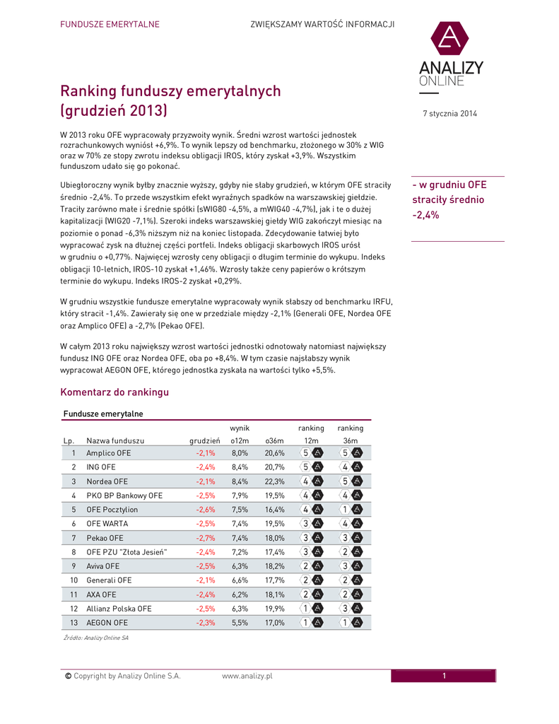 FUNDUSZE EMERYTALNE ZWIĘKSZAMY WARTOŚĆ INFORMACJI Ranking funduszy emerytalnych (grudzień 2013) 7 stycznia 2014 W 2013 roku OFE wypracowały przyzwoity wynik. Średni wzrost wartości jednostek rozrachunkowych wyniósł +6,9%. To wynik lepszy od benchmarku, złożonego w 30% z WIG oraz w 70% ze stopy zwrotu indeksu obligacji IROS, który zyskał +3,9%. Wszystkim funduszom udało się go pokonać. Ubiegłoroczny wynik byłby znacznie wyższy, gdyby nie słaby grudzień, w którym OFE straciły średnio -2,4%. To przede wszystkim efekt wyraźnych spadków na warszawskiej giełdzie. Traciły zarówno małe i średnie spółki (sWIG80 -4,5%, a mWIG40 -4,7%), jak i te o dużej kapitalizacji (WIG20 -7,1%). Szeroki indeks warszawskiej giełdy WIG zakończył miesiąc na poziomie o ponad -6,3% niższym niż na koniec listopada. Zdecydowanie łatwiej było wypracować zysk na dłużnej części portfeli. Indeks obligacji skarbowych IROS urósł w grudniu o +0,77%. Najwięcej wzrosły ceny obligacji o długim terminie do wykupu. Indeks obligacji 10-letnich, IROS-10 zyskał +1,46%. Wzrosły także ceny papierów o krótszym terminie do wykupu. Indeks IROS-2 zyskał +0,29%. - w grudniu OFE straciły średnio -2,4% W grudniu wszystkie fundusze emerytalne wypracowały wynik słabszy od benchmarku IRFU, który stracił -1,4%. Zawierały się one w przedziale między -2,1% (Generali OFE, Nordea OFE oraz Amplico OFE) a -2,7% (Pekao OFE). W całym 2013 roku największy wzrost wartości jednostki odnotowały natomiast największy fundusz ING OFE oraz Nordea OFE, oba po +8,4%. W tym czasie najsłabszy wynik wypracował AEGON OFE, którego jednostka zyskała na wartości tylko +5,5%. Komentarz do rankingu Fundusze emerytalne wynik Lp. grudzień o12m o36m 1 Nazwa funduszu Amplico OFE -2,1% 8,0% 20,6% 2 ING OFE -2,4% 8,4% 20,7% 3 Nordea OFE -2,1% 8,4% 22,3% 4 PKO BP Bankowy OFE -2,5% 7,9% 19,5% 5 OFE Pocztylion -2,6% 7,5% 16,4% 6 OFE WARTA -2,5% 7,4% 19,5% 7 Pekao OFE -2,7% 7,4% 18,0% 8 OFE PZU "Złota Jesień" -2,4% 7,2% 17,4% 9 Aviva OFE -2,5% 6,3% 18,2% 10 Generali OFE -2,1% 6,6% 17,7% 11 AXA OFE -2,4% 6,2% 18,1% 12 Allianz Polska OFE -2,5% 6,3% 19,9% 13 AEGON OFE -2,3% 5,5% 17,0% ranking ranking 12m 36m Źródło: Analizy Online SA © Copyright by Analizy Online S.A. www.analizy.pl 1 ZWIĘKSZAMY WARTOŚĆ INFORMACJI W grudniowym rankingu funduszy emerytalnych, bazującym na wskaźniku information ratio, liderem został Amplico OFE. Fundusz ten w ostatnich miesiącach wielokrotnie otrzymywał najwyższą ocenę 5a w zestawieniu krótkoterminowym i w grudniu również jego nota długoterminowa wzrosła do 5a. Fundusz wypracowuje bardzo dobre wyniki na tle konkurencji, poza tym charakteryzuje się stosunkowo niskim ryzykiem. Obecnie to jedyny fundusz , którego oceny zarówno w horyzoncie 12-miesięcznym, jak i 36-miesięcznym są na najwyższym poziomie. Drugą pozycję w rankingu zajął ING OFE, który w ciągu minionego roku poprawił ocenę 12miesięczną z 3a do 5a. 2013 rok był mniej udany dla drugiego pod względem wielkości funduszu - Aviva OFE, którego oceny z 4a obniżyły się do 2a (12-mies.) i 3a (36-mies.). W gorszej sytuacji jest jednak Allianz Polska OFE, który rok temu był najwyżej ocenionym funduszem z oceną 5a w obu zestawieniach. Rok 2013 kończy na przedostatniej pozycji z najniższą notą w horyzoncie 12-miesięcznym (1a), a w horyzoncie 36-mies. na neutralnym poziomie (3a). O pogorszeniu jego pozycji w rankingu zadecydowały słabsze wyniki. W minionym roku miesięczna stopa zwrotu funduszu ośmiokrotnie była słabsza od średniej. Rok 2013 nie był również udany dla AEGON OFE, który znalazł się na ostatnim miejscu rankingu z najniższą oceną 1a w obu zestawieniach. Zespół Analiz An aliz Online © Copyright by Analizy Online S.A. www.analizy.pl 2 ZWIĘKSZAMY WARTOŚĆ INFORMACJI Kontakt Jeżeli zainteresował Cię temat poruszony w raporcie i szukasz więcej informacji o nim - skontaktuj się z nami. Dział Analiz 22/431-82-94 [email protected] Dział Sprzedaży i Marketingu 22/431-82-96 [email protected] Dział Pozyskiwania i Przetwarzania Danych 22/431-82-98 [email protected] Spółka Analizy Online jest niezależną firmą analityczną zajmującą się monitoringiem rynku polskich i zagranicznych instytucji zbiorowego lokowania środków: funduszy inwestycyjnych, emerytalnych oraz ubezpieczeniowych funduszy kapitałowych). W zakres analiz rynku funduszy wchodzą między innymi rankingi funduszy, ocena efektywności działań zarządzających oraz analiza ich wpływu na polski rynek finansowy. Działalność firmy obejmuje również monitoring rynku produktów strukturyzowanych, zmian akcjonariatu polskich spółek publicznych oraz analizę rynku polskich papierów dłużnych. Niniejsze opracowanie zostało sporządzone wyłącznie w celu informacyjnym zgodnie z najlepszą wiedzą i starannością autorów. Dane wykorzystane przy tworzeniu opracowania pochodzą ze źródeł uważanych przez firmę Analizy Online SA za wiarygodne i dokładne, lecz nie istnieje gwarancja, iż są one kompletne i odzwierciedlają stan faktyczny. Opinie zawarte w niniejszym opracowaniu częściowo bazują na wartościach szacunkowych, wyznaczanych zgodnie z metodologią stosowaną przez Analizy Online SA, które mogą odbiegać od danych rzeczywistych. Spółka Analizy Online SA nie ponosi odpowiedzialności za ewentualne szkody spowodowane wykorzystaniem opinii i informacji zawartych w niniejszym opracowaniu. Niniejsze opracowanie jest przeznaczone do wyłącznego, własnego użytku Klientów spółki Analizy Online SA, którzy otrzymali je bezpośrednio od spółki Analizy Online SA. Publikowanie niniejszego opracowania w prasie, Internecie i innych środkach masowego przekazu w całości bądź w części, jak również przytaczanie zawartych w nim opinii wymaga pisemnej zgody spółki Analizy Online SA. © Copyright by Analizy Online S.A. www.analizy.pl 3