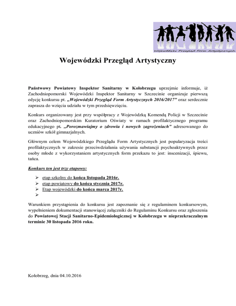 Wojewódzki Przegląd Artystyczny Państwowy Powiatowy Inspektor Sanitarny w Kołobrzegu uprzejmie informuje, iż Zachodniopomorski Wojewódzki Inspektor Sanitarny w Szczecinie organizuje pierwszą edycję konkursu pt. ,,Wojewódzki Przegląd Form Artystycznych 2016/2017” oraz serdecznie zaprasza do wzięcia udziału w tym przedsięwzięciu. Konkurs organizowany jest przy współpracy z Wojewódzką Komendą Policji w Szczecinie oraz Zachodniopomorskim Kuratorium Oświaty w ramach profilaktycznego programu edukacyjnego pt. ,,Porozmawiajmy o zdrowiu i nowych zagrożeniach” adresowanego do uczniów szkół gimnazjalnych. Głównym celem Wojewódzkiego Przeglądu Form Artystycznych jest popularyzacja treści profilaktycznych w zakresie przeciwdziałania używania substancji psychoaktywnych przez osoby młode z wykorzystaniem artystycznych form przekazu to jest: inscenizacji, śpiewu, tańca. Konkurs ten jest trzy etapowy: etap szkolny do końca listopada 2016r. etap powiatowy do końca stycznia 2017r. Etap wojewódzki do końca marca 2017r. Warunkiem przystąpienia do konkursu jest zapoznanie się z regulaminem konkursowym, wypełnieniem dokumentacji stanowiącej załączniki do Regulaminu Konkursu oraz zgłoszenia do Powiatowej Stacji Sanitarno-Epidemiologicznej w Kołobrzegu w nieprzekraczalnym terminie 30 listopada 2016 roku. Kołobrzeg, dnia 04.10.2016