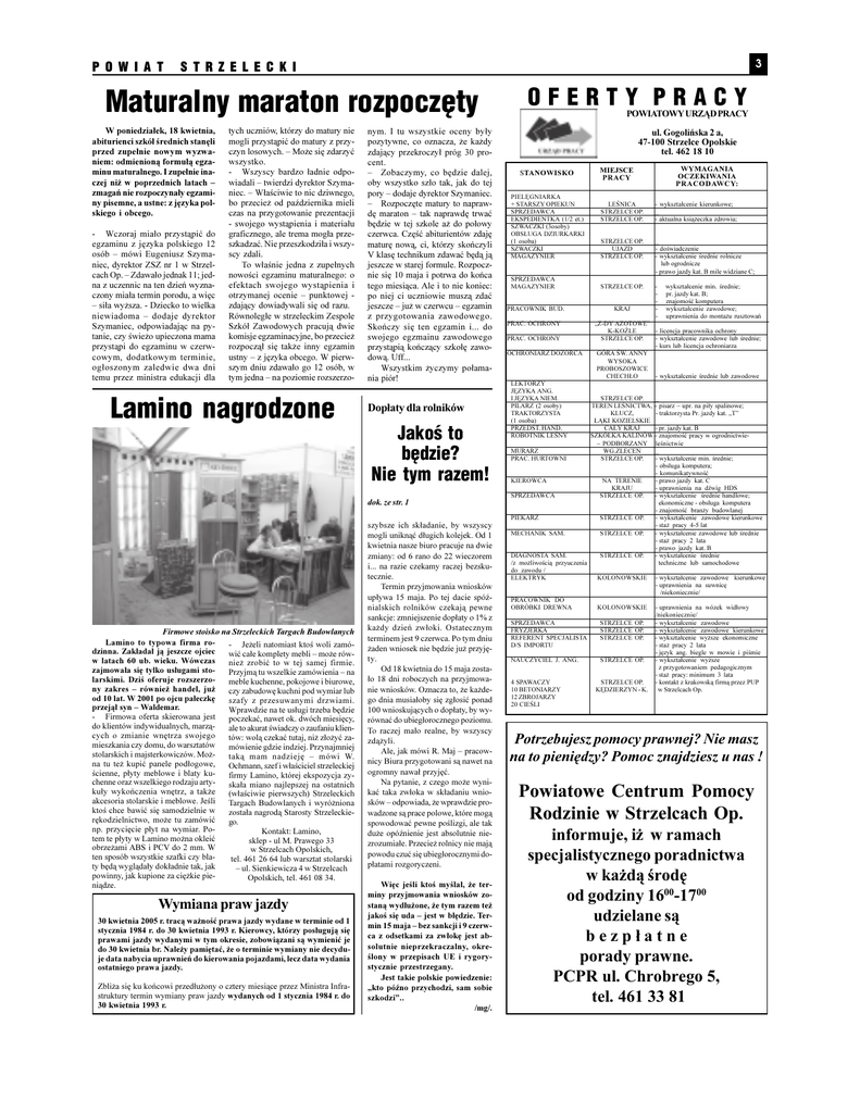 P O W I A T 3 S T R Z E L E C K I OFERTY PRACY Maturalny maraton rozpoczêty W poniedzia³ek, 18 kwietnia, tych uczniów, którzy do matury nie przed zupe³nie nowym wyzwa- czyn losowych. Mo¿e siê zdarzyæ abiturienci szkó³ rednich stanêli niem: odmienion¹ formu³¹ egza- minu maturalnego. I zupe³nie inaczej ni¿ w poprzednich latach zmagañ nie rozpoczyna³y egzaminy pisemne, a ustne: z jêzyka polskiego i obcego. mogli przyst¹piæ do matury z przywszystko. - Wszyscy bardzo ³adnie odpo- wiadali twierdzi dyrektor Szymaniec. W³aciwie to nic dziwnego, bo przecie¿ od padziernika mieli czas na przygotowanie prezentacji - swojego wyst¹pienia i materia³u Wczoraj mia³o przyst¹piæ do graficznego, ale trema mog³a prze- egzaminu z jêzyka polskiego 12 szkadzaæ. Nie przeszkodzi³a i wszy- osób mówi Eugeniusz Szyma- - scy zdali. niec, dyrektor ZSZ nr 1 w Strzel- To w³anie jedna z zupe³nych cach Op. Zdawa³o jednak 11; jed- nowoci egzaminu maturalnego: o na z uczennic na ten dzieñ wyzna- efektach swojego wyst¹pienia i czony mia³a termin porodu, a wiêc otrzymanej ocenie punktowej - si³a wy¿sza. - Dziecko to wielka zdaj¹cy dowiadywali siê od razu. niewiadoma dodaje dyrektor Równoleg³e w strzeleckim Zespole Szymaniec, odpowiadaj¹c na py- Szkó³ Zawodowych pracuj¹ dwie tanie, czy wie¿o upieczona mama komisje egzaminacyjne, bo przecie¿ przyst¹pi do egzaminu w czerw- rozpocz¹³ siê tak¿e inny egzamin cowym, dodatkowym terminie, ustny z jêzyka obcego. W pierw- og³oszonym zaledwie dwa dni szym dniu zdawa³o go 12 osób, w temu przez ministra edukacji dla tym jedna na poziomie rozszerzo- POWIATOWY URZ¥D PRACY nym. I tu wszystkie oceny by³y ul. Gogoliñska 2 a, 47-100 Strzelce Opolskie pozytywne, co oznacza, ¿e ka¿dy tel. 462 18 10 zdaj¹cy przekroczy³ próg 30 procent. Zobaczymy, co bêdzie dalej, STANOWISKO pory dodaje dyrektor Szymaniec. Rozpoczête matury to napraw- dê maraton tak naprawdê trwaæ bêdzie w tej szkole a¿ do po³owy czerwca. Czêæ abiturientów zdajê maturê now¹, ci, którzy skoñczyli V klasê technikum zdawaæ bêd¹ j¹ jeszcze w starej formule. Rozpocznie siê 10 maja i potrwa do koñca tego miesi¹ca. Ale i to nie koniec: z p r z y g o t o wa n i a z a wo d o we g o . Skoñczy siê ten egzamin i... do swojego egzmainu zawodowego przyst¹pi¹ koñcz¹cy szko³ê zawodow¹. Uff... + STARSZY OPIEKUN LENICA STRZELCE OP. EKSPEDIENTKA (1/2 et.) STRZELCE OP. OBS£UGA DZIURKARKI (1 osoba) STRZELCE OP. SZWACZKI UJAZD MAGAZYNIER STRZELCE OP. lub ogrodnicze MAGAZYNIER STRZELCE OP. PRACOWNIK BUD. KRAJ PRAC. OCHRONY Z-DY AZOTOWE PRAC. OCHRONY STRZELCE OP. K-KOLE OCHRONIARZ DOZORCA Jako to bêdzie? Nie tym razem! tecznie. nialskich rolników czekaj¹ pewne sankcje: zmniejszenie dop³aty o 1% z Firmowe stoisko na Strzeleckich Targach Budowlanych - Firmowa oferta skierowana jest do klientów indywidualnych, marz¹cych o zmianie wnêtrza swojego mieszkania czy domu, do warsztatów stolarskich i majsterkowiczów. Mo¿na tu te¿ kupiæ panele pod³ogowe, cienne, p³yty meblowe i blaty ku- chenne oraz wszelkiego rodzaju artyku³y wykoñczenia wnêtrz, a tak¿e akcesoria stolarskie i meblowe. Jeli kto chce bawiæ siê samodzielnie w rêkodzielnictwo, mo¿e tu zamówiæ np. przyciêcie p³yt na wymiar. Potem te p³yty w Lamino mo¿na okleiæ obrze¿ami ABS i PCV do 2 mm. W ten sposób wszystkie szafki czy bla- ty bêd¹ wygl¹da³y dok³adnie tak, jak powinny, jak kupione za ciê¿kie pieni¹dze. Je¿eli natomiast kto woli zamó- wiæ ca³e komplety mebli mo¿e rów- nie¿ zrobiæ to w tej samej firmie. Przyjm¹ tu wszelkie zamówienia na meble kuchenne, pokojowe i biurowe, t y. STRZELCE OP. KLUCZ, (1 osoba) CA£Y KRAJ ROBOTNIK LENY ³o 18 dni roboczych na przyjmowa- 100 wnioskuj¹cych o dop³aty, by wy- poczekaæ, nawet ok. dwóch miesiêcy, ale to akurat wiadczy o zaufaniu klien- tów: wol¹ czekaæ tutaj, ni¿ z³o¿yæ za- mówienie gdzie indziej. Przynajmniej nadziejê mówi - wykszta³cenie rednie lub zawodowe W. Ochmann, szef i w³aciciel strzeleckiej firmy Lamino, której ekspozycja zyska³a miano najlepszej na ostatnich (w³aciwie pierwszych) Strzeleckich go dnia musia³oby siê zg³osiæ ponad zd¹¿yli. Ale, jak mówi R. Maj pracownicy Biura przygotowani s¹ nawet na PODBORZANY WG.ZLECEÑ PRAC. HURTOWNI STRZELCE OP. Na pytanie, z czego mo¿e wynikaæ taka zw³oka w sk³adaniu wnio- go. spowodowaæ pewne polizgi, ale tak sklep - ul M. Prawego 33 w Strzelcach Opolskich, tel. 461 26 64 lub warsztat stolarski ul. Sienkiewicza 4 w Strzelcach Opolskich, tel. 461 08 34. 30 kwietnia 2005 r. trac¹ wa¿noæ prawa jazdy wydane w terminie od 1 stycznia 1984 r. do 30 kwietnia 1993 r. Kierowcy, którzy pos³uguj¹ siê prawami jazdy wydanymi w tym okresie, zobowi¹zani s¹ wymieniæ je do 30 kwietnia br. Nale¿y pamiêtaæ, ¿e o terminie wymiany nie decydu- je data nabycia uprawnieñ do kierowania pojazdami, lecz data wydania ostatniego prawa jazdy. Zbli¿a siê ku koñcowi przed³u¿ony o cztery miesi¹ce przez Ministra Infra- struktury termin wymiany praw jazdy wydanych od 1 stycznia 1984 r. do lenictwie _ - wykszta³cenie min. rednie; - obs³uga komputera; KIEROWCA NA TERENIE KRAJU - komunikatywnoæ - prawo jazdy kat. C - uprawnienia na dwig HDS SPRZEDAWCA STRZELCE OP. - wykszta³cenie rednie handlowe; PIEKARZ STRZELCE OP. - wykszta³cenie MECHANIK SAM. STRZELCE OP. - wykszta³cenie zawodowe lub rednie DIAGNOSTA SAM. STRZELCE OP. - wykszta³cenie rednie KOLONOWSKIE - wykszta³cenie zawodowe ekonomiczne - obs³uga - sta¿ pracy bran¿y komputera budowlanej zawodowe kierunkowe 4-5 lat - sta¿ pracy 2 lata - prawo jazdy kat. B /z do mo¿liwoci¹ przyuczenia techniczne lub samochodowe zawodu / - uprawnienia na kierunkowe suwnicê /niekoniecznie/ PRACOWNIK DO OBRÓBKI DREWNA KOLONOWSKIE - uprawnienia na wózek wid³owy /niekoniecznie/ SPRZEDAWCA STRZELCE OP. - wykszta³cenie - wykszta³cenie zawodowe REFERENT SPECJALISTA STRZELCE OP. - wykszta³cenie wy¿sz