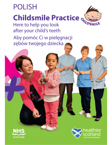 POLISH Childsmile Practice Here to help you look after your child’s teeth Aby pomóc Ci w pielęgnacji zębów twojego dziecka 1 Chętnie rozważymy możliwość tłumaczenia na inne języki lub formaty. Prosimy o kontakt pod numerem 0131 536 5500 lub mailowo [email protected] NHS Health Scotland pragnie wyrazić wdzięczność Scottish Dental dostosowanie tabeli porad dentystycznych Opublikowane przez NHS Health Scotland Biuro w Edynburgu Woodburn House Canaan Lane Edinburgh EH10 4SG Biuro w Glasgow Elphinstone House 65 West Regent Street Glasgow G2 2AF © NHS Health Scotland, 2010, 2011 Wszelkie prawa zastrzeżone. Materiał zawarty w niniejszej publikacji nie może być przetwarzany w całości lub częściowo bez uzyskania wcześniejszej zgody NHS Health Scotland (lub pozostałych właścicieli praw autorskich). Pomimo wszelkich podjętych starań w celu zapewnienia, że podane tu informacje są poprawne, nie ponosi się odpowiedzialności prawnej za jakiekolwiek błędy, pominięcia lub mylne stwierdzenia. 2 NHS Health Scotland jest organizacją współpracującą z WHO na rzecz promocji zdrowia oraz rozwoju zdrowia publicznego. Czym jest Childsmile? Childsmile jest programem o zasięgu krajowym mającym na celu poprawę zdrowia jamy ustnej dzieci w Szkocji. Zdrowe zęby twojego dziecka Możesz nie być jeszcze w stanie e zobaczyć zębów twojego dziecka, cka, ale one zaczęły już rosnąć. Działania, jakie podejmiesz teraz, pomogą zapewnić twojemu dziecku zdrowe uzębienie na całe życie. Z kim się spotkam? Do udzielenia Ci pomocy gotowy jest zespół osób. Spotkałeś/-aś już swoją: t Pielęgniarkę środowiskową/ znego. pielęgniarkę zdrowia publicznego. Inne osoby, z którymi możeszz się spotkać: t Pracownik ds. wspierania zdrowia rowia jamy ustnej, t t t Pomoc dentystyczna, Dentysta/higienista lub terapeuta, peuta, Recepcjonistka. 3 W jaki sposób mogę się zaangażować? Po raz pierwszy usłyszysz o Childsmile od swojej pielęgniarki środowiskowej/pielęgniarki zdrowia publicznego. Jeśli chcesz wziąć udział w programie, ona skontaktuje Cię z pracownikiem ds. wspierania zdrowia jamy ustnej lub pokieruje Cię do przychodni dentystycznej Childsmile. Twój pracownik ds. wspierania zdrowia jamy ustnej Z jego wsparciem i poradą u twojego dziecka wyrosną zdrowe zęby i pojawi się szeroki uśmiech. Uczyni on to poprzez: t objaśnienie zalet programu Childsmile dla Ciebie i twojego dziecka, t pomoc w odnalezieniu lokalnej przychodni dentystycznej Childsmile i w razie potrzeby wsparcie Cię podczas pierwszej wizyty w przychodni, t zapoznanie Cię z pomocą dentystyczną, t dostarczenie Ci aktualnych praktycznych porad na temat szczotkowania oraz zdrowej żywności i napojów, t 4 skierowanie Cię do innych lokalnych inicjatyw, np. grupy ds. karmienia piersią lub targi na temat odstawiania od piersi. Twoja pomoc dentystyczna Zazwyczaj podczas twojej pierwszej wizyty w przychodni dentystycznej spotkasz się z pomocą dentystyczną, a ona zapozna Cię z innymi członkami zespołu dentystycznego. Ona porozmawia z Tobą i odpowie na twoje wszelkie pytania dotyczące: t t t t ząbkowania, zdrowej żywności i napojów, szczotkowania zębów, przyszłych wizyt w przychodni dentystycznej. Sugerujemy, abyś zabrał/-a swoje dziecko do przychodni dentystycznej po raz pierwszy w około 6 miesiącu jego życia. 5 Twój dentysta W kolejnym etapie programu twoje dziecko zostanie przedstawione dentyście, który: t t t 6 obejrzy uzębienie twojego dziecka, wytłumaczy inne sposoby ochrony zębów twojego dziecka (np. poprzez nałożenie lakieru fluorowego począwszy od 2 roku życia), zapozna Cię z gabinetem dentystycznym i jego wyposażeniem w przyjacielski i wesoły sposób. Porada dentystyczna W domu pamiętaj o utrzymaniu higieny jamy ustnej twojego dziecka: tSzczotkuj zęby i dziąsła dwa razy dziennie pastą zawierającą tDzieci powinny być nadzorowane do 7 roku życia oraz należy je zachęcać, aby nie połykały pasty szczotkując zęby, t“wypluj pastę, nie płucz zębów” po szczotkowaniu – to umożliwia paście ochronę zębów, t Podawaj jedzenie i napoje zawierające cukier wyłącznie w trakcie posiłków, t Zwykłe mleko i woda z kranu są najbezpieczniejszymi napojami dla zębów, t Zarejestruj się u dentysty i zgłoś się na wizytę zgodnie z zaleceniami. Pamiętaj twoje dziecko jest jedyne w swoim rodzaju i jego zęby będą się rozwijać w różnym tempie. Jeśli masz obawy z tym związane, zapytaj specjalistę ds. higieny jamy ustnej lub swoją pielęgniarkę środowiskową/pielęgniarkę zdrowia publicznego. 7 Standardowa liczba zębów przed ukończeniem danego wieku Wiek Co zacznie się dziać? Około 6 miesiąca życia Zaczną pojawiać się przednie zęby 0–4 Około 1 roku życia Górne i dolne przednie zęby mogą być widoczne 4–8 Około 18 miesiąca życia Niektóre zęby trzonowe mogą już się przebić – pozostałe zaczną się wyrzynać 8–14 Około 2 roku życia Zaczną się pojawiać dalsze zęby trzonowe 12–16 Około 2 ½ roku życia Dziecko będzie już miało większość zębów mlecznych 16–20 Około 3 roku życia Dziecko powinno już mieć wszystkie zęby mleczne 20 8 Co powinieneś/powinnaś zrobić? t Zarejestruj sięJ[HPǴTJǗOBXJ[ZUǗXQS[ZDIPEOJEFOUZTUZD[OFK t ZasięgnijQPSBEZOBUFNBU[njCLPXBOJBT[D[PULPXBOJB[ǗCØX [ESPXFKȈZXOPǴDJJOBQPKØX t Korzystaj z pakietu dentystycznego Childsmile i kubka kapka t Umów sięOBXJ[ZUǗXQS[ZDIPEOJEFOUZTUZD[OFK t ZasięgnijQPSBEZOBUFNBUT[D[PULPXBOJB[ǗCØXOQLJFEZJKBL PSB[[ESPXFKȈZXOPǴDJJOBQPKØX t Umów sięOBLPOUSPMOnjXJ[ZUǗVEFOUZTUZ t Zasięgnij QPSBEZOBUFNBUT[D[PULPXBOJB[ǗCØXXUZN[ǗCZ US[POPXF PSB[[ESPXFKȈZXOPǴDJJOBQPKØX t Umów sięOBXJ[ZUǗXQS[ZDIPEOJEFOUZTUZD[OFK t Poproś PQJFSXT[njBQMJLBDKǗMBLJFSVøVPSPXFHP t ZasięgnijQPSBEZOBUFNBUT[D[PULPXBOJB[ǗCØXPSB[[ESPXFK ȈZXOPǴDJJOBQPKØX t Umów się OBXJ[ZUǗXQS[ZDIPEOJEFOUZTUZD[OFK t Poproś o kolejną ap