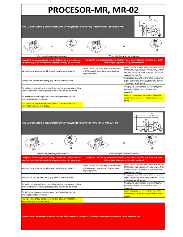 PROCESOR-MR, MR-02 Rys. 1. Podłączenie przewodem dwużyłowym (fotokomórka) - ustawienie fabryczne MR 5b 5а Wentylator jest w trybie czuwania. Uwaga! W celu oszczędzania energii elektrycznej wentylator nie uruchomi się, jeżeli światło było włączone krócej, niż 45 sekund. Wentylator uruchamia się 45 sekund po włączeniu światła. Wentylator jest w trybie czuwania. Uwaga! W celu oszczędzania energii elektrycznej wentylator nie uruchomi się, jeżeli światło było włączone krócej, niż 90 sekund. Jeżeli światło zostanie włączone na mniej niż 90 sekund, wentylator pozostanie w trybie czuwania. Wentylator kontynułuje pracę, gdy światło jest włączone. Jeżeli światło zostało włączone na więcej niż 90 sekund, tryb zostaje aktywowany, jednak wentylator nie uruchamia się do momentu wyłączenia światła. Po zgaszeniu światła wentylator uruchamia się na ustawiony przez użytkownika czas od 15 sekund do 45 minut. Po wyłączeniu światła wentylator kontynułuje pracę przez zadany przez użytkownika czas wynoszący od 15 sekund do 45 minut. Po upływie ustawionego czasu wentylator przestaje działać i przechodzi w stan czuwania. Po upływie ustawionego czasu wentylator przestaje działać i przechodzi w stan czuwania. Jeżeli podczas pracy wentylatora światło zostanie włączone, wentylator nie przerwie pracy. Jeżeli podczas pracy wentylatora światło zostanie włączone, wentylator nie przerwie pracy. Rys. 2. Podłączenie przewodem dwużyłowym (fotokomórka i włącznik) MR, MR-02 5а 5b Wentylator jest w trybie czuwania. Wentylator jest w trybie czuwania. Uwaga! W celu oszczędzania energii elektrycznej wentylator nie uruchomi się, jeżeli światło było włączone krócej, niż 45 sekund. Wentylator uruchamia się 45 sekund po włączeniu światła. Wentylator kontynułuje pracę, gdy światło jest włączone. Po wyłączeniu światła wentylator kontynułuje pracę przez zadany przez użytkownika czas wynoszący od 15 sekund do 45 minut. Po upływie ustawionego czasu wentylator przestaje działać i przechodzi w stan czuwania. Uwaga! W celu oszczędzania energii elektrycznej wentylator nie uruchomi się, jeżeli światło było włączone krócej, niż 90 sekund. Jeżeli światło zostanie włączone na mniej niż 90 sekung, wentylator pozostanie w trybie czuwania. Jeżeli światło zostało włączone na więcej niż 90 sekund, tryb zostaje aktywowany, jednak wentylator nie uruchamia się do momentu wyłączenia światła. Po zgaszeniu światła wentylator uruchamia się na ustawiony przez urzytkownika czas od 15 sekund do 45 minut. Po upływie ustawionego czasu wentylator przestaje działać i przechodzi w stan czuwania. Jeżeli podczas pracy wentylatora światło zostanie włączone, wentylator nie przerwie pracy. Jeżeli podczas pracy wentylatora światło zostanie włączone, wentylator nie przerwie pracy. Uwaga! Wentylatory wyposażone w przełącznik S2 pozwalają na włączenie/wyłączenie wentylatora zgodnie z wolą użytkownika. Rys. 3. Podłączenie przewodem dwużyłowym + włącznik - ustawienia fabryczne. MR, MR 02 5а Wentylator jest w trybie czuwania. Uwaga! W dowolnym momencie można przerwać pracę wentylarora dzięki przełącznikowi S2, po czym wentylator wróci w tryb czuwania. Po włączeniu wentylatora wentylator zacznie pracować przez zadany przez urzytkownika czas. Po upływie ustawionego czasu wentylator przestaje działać i przechodzi w stan czuwania. Rys. 4. Podłączenie przez kabel trzyżyłowy + włącznik - ustawienia fabryczne MR, MR 02 5а 5B Wentylator jest w trybie czuwania. Wentylator jest w trybie czuwania. Wentylator zostaje uruchomiony wraz z włączeniem światła. Uwaga! W celu oszczędzania energii elektrycznej wentylator nie uruchomi się, jeżeli światło było włączone krócej, niż 90 sekund. Wentylator kontunułuje pracę, gdy światło jest włączone. Po wyłączeniu światła wentylator kontynułuje pracę przez zadany przez użytkownika czas wynoszący od 15 sekund do 45 minut. Po upływie ustawionego czasu wentylator przestaje działać i przechodzi w tryb czuwania. Jeżeli światło zostało włączone na więcej niż Jeżeli światło zostanie włączone na mniej niż 90 sekund, tryb zostaje aktywowany, jednak 90 sekund, wentylator pozostanie w trybie wentylator nie uruchamia się do momentu czuwania. wyłączenia światła. Po zgaszeniu światła wentylator uruchamia się na ustawiony przez użytkownika czas od 15 sekund do 45 minut. Po upływie ustawionego czasu wentylator przestaje działać i przechodzi w stan czuwania. Wybór trybu Fotokomórka Kostka zaciskowa Lampka Regulator czasu