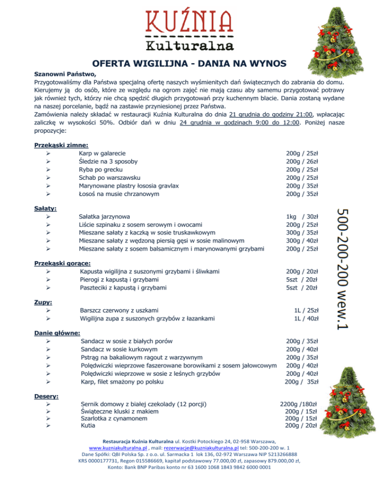 OFERTA WIGILIJNA - DANIA NA WYNOS Szanowni Państwo, Przygotowaliśmy dla Państwa specjalną ofertę naszych wyśmienitych dań świątecznych do zabrania do domu. Kierujemy ją do osób, które ze względu na ogrom zajęć nie mają czasu aby samemu przygotować potrawy jak również tych, którzy nie chcą spędzić długich przygotowań przy kuchennym blacie. Dania zostaną wydane na naszej porcelanie, bądź na zastawie przyniesionej przez Państwa. Zamówienia należy składać w restauracji Kuźnia Kulturalna do dnia 21 grudnia do godziny 21:00, wpłacając zaliczkę w wysokości 50%. Odbiór dań w dniu 24 grudnia w godzinach 9:00 do 12:00. Poniżej nasze propozycje: Przekąski zimne: Karp w galarecie Śledzie na 3 sposoby Ryba po grecku Schab po warszawsku Marynowane plastry łososia gravlax Łosoś na musie chrzanowym 200g 200g 200g 200g 200g 200g / / / / / / Sałaty: 1kg 200g 300g 300g 200g / 30zł / 25zł / 35zł / 40zł / 25zł Sałatka jarzynowa Liście szpinaku z sosem serowym i owocami Mieszane sałaty z kaczką w sosie truskawkowym Mieszane sałaty z wędzoną piersią gęsi w sosie malinowym Mieszane sałaty z sosem balsamicznym i marynowanymi grzybami Przekąski gorące: Kapusta wigilijna z suszonymi grzybami i śliwkami Pierogi z kapustą i grzybami Paszteciki z kapustą i grzybami Zupy: Barszcz czerwony z uszkami Wigilijna zupa z suszonych grzybów z łazankami Danie główne: Sandacz w sosie z białych porów Sandacz w sosie kurkowym Pstrąg na bakaliowym ragout z warzywnym Polędwiczki wieprzowe faszerowane borowikami z sosem jałowcowym Polędwiczki wieprzowe w sosie z leśnych grzybów Karp, filet smażony po polsku Desery: Sernik domowy z białej czekolady (12 porcji) Świąteczne kluski z makiem Szarlotka z cynamonem Kutia 25zł 26zł 25zł 25zł 35zł 35zł 200g / 20zł 5szt / 20zł 5szt / 20zł 1L / 25zł 1L / 40zł 200g / 200g / 200g / 200g / 200g / 200g / 35zł 40zł 35zł 40zł 40zł 35zł 2200g /180zł 200g / 15zł 200g / 15zł 200g / 20zł Restauracja Kuźnia Kulturalna ul. Kostki Potockiego 24, 02-958 Warszawa, www.kuzniakulturalna.pl , mail: [email protected] tel: 500-200-200 w. 1 Dane Spółki: QBI Polska Sp. z o.o. ul. Sarmacka 1 lok 136, 02-972 Warszawa NIP 5213266888 KRS 0000177731, Regon 015586669, kapitał podstawowy 77.000,00 zł, zapasowy 879.000,00 zł, Konto: Bank BNP Paribas konto nr 63 1600 1068 1843 9842 6000 0001