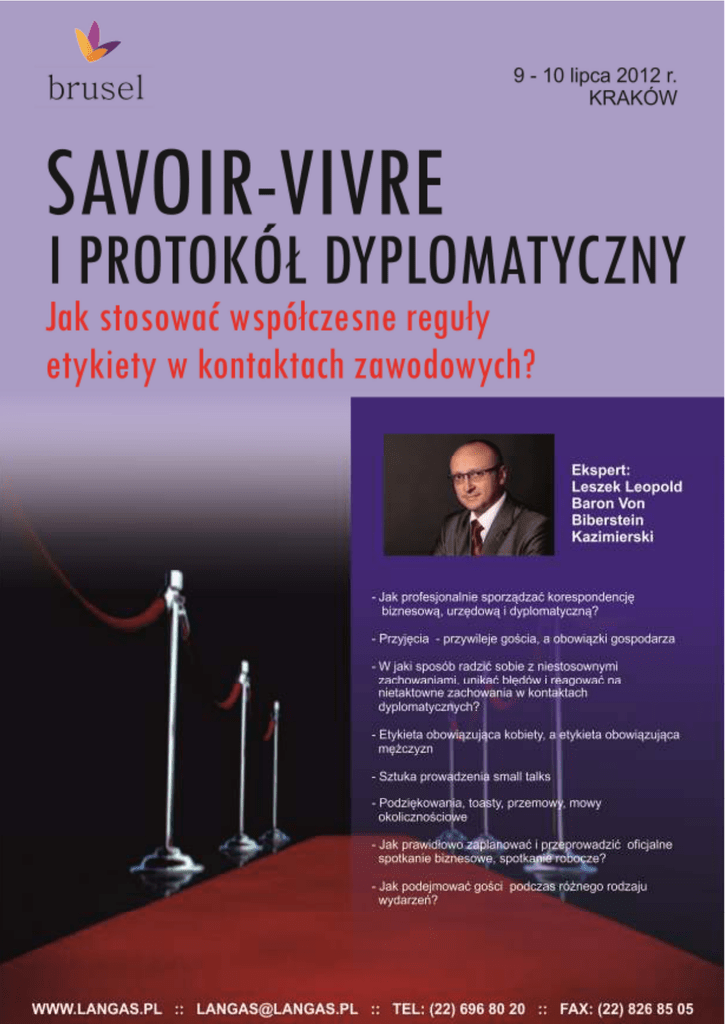 brusel SAVOIR-VIVRE I PROTOKÓŁ DYPLOMATYCZNY jak stosować współczesne reguły etykiety w kontaktach zawodowych? Różnorodność i intensywność możliwych form kontaktowania się w środowisku zawodowym, przyspieszenie procesów, intensywność zmian, wpłynęły na obyczajowość, moderując tym samym reguły savoir-vivre. W jaki sposób odnaleźć prawidłowe i stosowne schematy funkcjonowania w środowisku zawodowym, zarówno na gruncie nieformalnym, a co istotne w sytuacjach oficjalnych? O czym należy pamiętać i jak radzić sobie z sytuacjami wzbudzającymi wątpliwości, lub z zachowaniami innych, które nas zaskakują? Zapraszamy do udziału w szkoleniu poświęconemu współczesnemu savoir vivre i protokołowi dyplomatycznemu. Program szkolenia został przygotowany z myślą o tych wszystkich osobach, które czują potrzebę zweryfikowania swoich norm zachowania się w relacjach zawodowych. Podczas szkolenia dowiedzą się Państwo: − W jaki sposób na co dzień wykorzystać reguł savoir-vivre wyznaczające wysoki poziom kultury osobistej? − W jaki sposób modyfikować swoje zachowania, ubiór i wypowiedzi, aby podnosić jakość relacji zawodowych? − Jak profesjonalnie sporządzać korespondencję zarówno tą biznesową, urzędową, jak i dyplomatyczną? EKSPERT: LESZEK LEOPOLD BARON BIBERSTEIN KAZIMIERSKI VON Uznany specjalista od dobrych manier oraz ekspert ds. protokołu dyplomatycznego, od 15 lat prowadzący kursy, warsztaty oraz szkolenia w kraju i za granicą. Jest częstym gościem programów telewizyjnych, gdzie doradza widzom, jak z klasą przejść przez życie; Tłumacz przysięgły i poliglota (włada 8 językami), Organizator oraz uczestnik wielu imprez i spotkań na najwyższym szczeblu, krajowych i zagranicznych, z udziałem najwyższych władz (prezydenci państw, ministrowie, marszałkowie parlamentów, ambasadorowie), animator międzynarodowej wymiany członków organizacji zrzeszających liderów (Polska, Niemcy, Francja, Rosja, Ukraina, Litwa). Dyrektor Polskiego Ośrodka Informacji Turystycznej w Kijowie. Przewodniczył polskiej delegacji na światowej konferencji w Moskwie pt. „Młodzi liderzy nowego tysiąclecia”. Autor fachowych publikacji w gazetach i czasopismach branżowych oraz ekspert zapraszany do udziału w programach radiowych i telewizyjnych (TVP-2, TVN, TVN Style). − Jakie formy wypowiedzi stosować, aby wyznaczać wysoki poziom kurtuazji? − W jaki sposób radzić sobie z niestosownymi zachowaniami, unikać błędów i reagować na nietaktowne zachowania? − Jak prawidłowo zaplanować i przeprowadzić oficjalne spotkanie biznesowe, spotkanie robocze? − Jak organizować przyjęcia i podejmować gości podczas różnego rodzaju przyjęć i wydarzeń? SZKOLENIE SKIEROWANE DO: − Menedżerów, którzy uczestniczą w spotkaniach biznesowych − Pracowników jednostek administracji publicznej i samorządów; − Wszystkich osób, które chciałyby posiadać niezbędną wiedzę z savoir vivre, etykiety i protokołu dyplomatycznego. METODOLOGIA: W przypadku jakichkolwiek pytań Proszę o kontakt telefoniczny z zespołem Langas Group pod numerem telefonu (22) 696 80 20, lub za pomocą poczty elektronicznej: [email protected] Barbara Zielińska Kierownik Projektu Proponowane szkolenie przyjmie formę warsztatów, w których zastosowane zostaną metody aktywizujące grupę. Uczestnicy w trakcie zajęć wysłuchają mini-wykładów, wezmą udział w ćwiczeniach, dyskusjach, które będą sprzyjać szybszemu zdobywaniu i integrowaniu wiedzy, a zarazem testowaniu wszystkiego na sali szkoleniowej. Langas Group ul. Krakowskie Przedmieście 79, 00-079 Warszawa www.langas.pl | [email protected] Tel: (22) 696 80 20 | Fax: (22) 826 85 05 SAVOIR-VIVRE I PROTOKÓŁ DYPLOMATYCZNY Jak stosować współczesne reguły etykiety w kontaktach zawodowych? ETYKIETA W CODZIENNYCH SYTUACJACH ZAWODOWYCH − Współczesne reguły życia zawodowego i etykiety w kontaktach służbowych − Uprzejmość, punktualność, takt, a gafy − Metody radzenia sobie w kłopotliwych sytuacjach − Przyjmowanie gości, klientów, „spotkania w interesach” − Wiek, płeć, status społeczny, a hierarchia służbowa − Reguły przedstawiania siebie oraz innych - zapoznawanie − Powitanie – uściski dłoni − Wymiana wizytówek AUTOPREZENTACJA ZAWODOWA − Etykieta obowiązująca kobiety, a etykieta obowiązująca mężczyzn − Dobór stroju do okoliczności zawodowych i stosowanie dodatków − Pierwsze wrażenie – zachowanie, wygląd, wypowiedzi − Jak unikać błędów? PROWADZENIE KONWERSACJI WEDŁUG REGUŁ SAVOIR-VIVRE − Kultura wypowiedzi − Język oficjalny a mowa potoczna – kiedy i w jakich okolicznościach można się stosować? − Jak radzić sobie z osobami łamiącymi reguły dobrych manier? − Elegancja komunikacji niewerbalnej i kontakt wzrokowy − Techniki tzw. aktywnego słuchania – w jaki sposób wyrażać zainteresowanie i uwagę rozmówcy? − Dystans – indywidualne predyspozycje, a okoliczności oficjalne ETYKIETA ROZMÓW TELEFONICZNYCH − Przygotowanie, a treść rozmowy − Reguły prowadzenia rozmów − Ustalenia wynikające z rozmowy − Eleganckie korzystanie z telefonu komórkowego KORESPONDENCJA PISEMNA I NETYKIETA; KORESPONDENCJA DYPLOMATYCZNA − Korespondencja biznesowa − Korespondencja okolicznościowa − Korespondencja urzędowa – rodzaje i sposoby sporządzania − Etykieta elektroniczna – dobre obyczaje, treści i stosowane formy − Zaproszenia ORGANIZACJA I OBSŁUGA WIZYT OFICJALNYCH I ROBOCZYCH − Jak się przygotować do uroczystości o charakterze oficjalnym? − W jaki sposób przygotować się do wizyty? − Reguły i przebieg spotkań w zależności od charakteru − Zaproszenia, odebranie zaproszeń, potwierdzenia, informacje o miejscu spotkania, ustawienie stołów i miejsc spotkań ustawienia stołów) − Jak przygotować agendę spotkania? − W jaki sposób podejmować oficjalną del