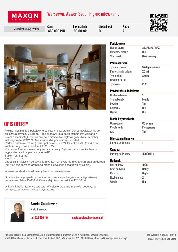 Warszawa, Wawer, Sadul, Piękne mieszkanie Mieszkanie - Sprzedaż Cena 460 000 PLN Powierzchnia 90.00 m2 Liczba Pokoi 3 Piętro 2 Podstawowe Numer oferty 35378/MS/MAX Rynek Pierwotny Nie Stan lokalu Bardzo dobry Pomieszczenia Typ mieszkania Wielopoziomowe Powierzchnia salonu 20 m2 Typ kuchni Aneks Liczba łazienek 1 Typ okien PCV Powierzchnia dodatkowa Liczba balkonów 1 Typ balkonów Loggia Piwnica Tak Komórka Nie Ogród Nie Media i wyposażenie OPIS OFERTY Piękne mieszkanie 3 pokojowe o całkowitej powierzchni 90m2 (powierzchnia do obliczania czynszu 72,19 m2 - bez skosów i taka powierzchnia jest wpisana w księdze wieczystej) usytuowane na 2 piętrze dwupiętrowego budynku w cichej i zielonej części WAWRA. Mieszkanie dwupoziomowe - rozkład: Parter – salon (ok. 20 m2), przedpokój (ok. 5,2 m2), łazienka z WC (ok. 4,7 m2), kuchnia połączona z jadalnią (ok. 25 m2). Kuchnia w formie aneksu połączona z jadalnią. Dębowa zabudowa kuchenna wyposażona w kompletny sprzęt AGD. Balkon (ok. 8,2 m2) Pietro I - rozkład: antresola z miejscem do czytania (ok. 8,2 m2), sypialnia (ok. 20 m2) oraz garderoba (ok. 11,5 m2 dowolna aranżacja może służyć jako dodatkowa sypialnia). Wysoki standard, mieszkanie gotowe do zamieszkania. Do mieszkania przynależy piwnica oraz miejsce parkingowe w hali garażowej dodatkowo płatne 15 000 zł. Cena całej nieruchomości to 475 000 zł. W kuchni, hallu i łazience terakota. W salonie oraz jadalni parkiet dębowy. W pomieszczeniach na piętrze – wykładzina. Ogrzewanie CO własne Ciepła woda Piec gazowy Gaz Tak Miejsca parkingowe Parking podziemny 1 Cena za Parking podziemny 15 000 PLN Budynek Rok budowy 1998 Stan budynku Dobry Materiał Cegła Liczba pięter 2 Winda Nie Aneta Smolewska Aneta Smolewska tel. 525 230 110 [email protected] Niniejsze warunki mają charakter wyłącznie informacyjny i nie stanowią oferty w rozumieniu Kodeksu Cywilnego. MAXON Nieruchomości Sp. z o o. ul. Powązkowska 44C, 01-797 Warszawa Tel: (22) 530 60 00 e-mail: [email protected] www.maxon.pl Data wydruku: 2017-03-04 09:40 Numer oferty: 35378/MS/MAX
