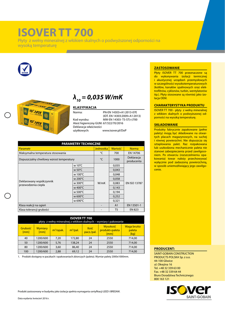ISOVER TT 700 Płyty z wełny mineralnej z włókien skalnych o podwyższonej odporności na wysoką temperaturę ZASTOSOWANIE Płyty ISOVER TT 700 przeznaczone są do wykonywania izolacji termicznej i akustycznej urządzeń przemysłowych w szczególności wysokotemperaturowych (kotłów, kanałów spalinowych oraz elektrofiltrów, cyklonów, turbin, wentylatorów itp.). Płyty stosowane są również jako izolacja OEM. λ10 = 0,035 W/mK CHARAKTERYSTYKA PRODUKTU KLASYFIKACJA Norma: PN-EN 14303+A1:2013-07E (IDT. EN 14303:2009+A1:2013) Kod wyrobu: MW-EN 14303- T5-ST(+)700 Atest higieniczny GUM:67/322/70/2016 Deklaracja właściwości użytkowych: www.isover.pl/DoP PARAMETRY TECHNICZNE Parametr Maksymalna temperatura stosowania Jednostka °C Wartość 700 °C 1000 Dopuszczalny chwilowy wzrost temperatury w 10°C w 50°C w 100°C w 200°C w 300°C w 400°C w 500°C w 600°C w 690°C Deklarowany współczynnik przewodzenia ciepła W/mK Klasa reakcji na ogień Klasa tolerancji grubości - 0,035 0,043 0,048 0,058 0,083 0,143 0,194 0,252 0,321 A1 T5 Norma EN 14706 Deklaracja producenta ISOVER TT 700 - płyty z wełny mineralnej z włókien skalnych o podwyższonej odporności na wysoką temperaturę. SKŁADOWANIE Produkty fabrycznie zapakowane (pełne palety) mogą być składowane na otwartych placach magazynowych, na suchej i równej powierzchni. Nie dopuszcza się sztaplowania palet. Raz rozpakowana lub uszkodzona mechanicznie paleta nie stanowi zabezpieczenia przed zawilgoceniem. Po otwarciu (rozszczelnieniu opakowania) towar należy przechowywać wyłącznie pod zadaszoną powierzchnią, w sposób uniemożliwiający jego zawilgocenie. EN ISO 13787 EN 13501-1 EN 823 ISOVER TT 700 płyty z wełny mineralnej z włókien skalnych – wymiary i pakowanie Grubość [mm] Wymiary [mm] m2/opak. m2/pal. Ilość pacz./pal. 40 50 80 100 1200/600 1200/600 1200/600 1200/600 7,20 5,76 3,60 2,88 172,80 138,24 86,40 69,12 24 24 24 24 Wysokość produkt+paleta [mm] 2550 2550 2550 2550 Waga brutto paleta [kg] 714,00 714,00 714,00 714,00 1. Produkt dostępny w paczkach i opakowaniach zbiorczych (paleta). Wymiar palety 2000x1000mm. Produkt zastosowany w budynku jako izolacja spełnia wymagania certyfikacji LEED i BREEAM. Data wydania: kwiecień 2016 r. PRODUCENT: SAINT-GOBAIN CONSTRUCTION PRODUCTS POLSKA Sp. z o.o. 44-100 Gliwice ul. Okrężna 16 Tel. +48 32 339 63 00 Fax. +48 32 339 64 44 Biuro Doradztwa Technicznego: 800 163 121