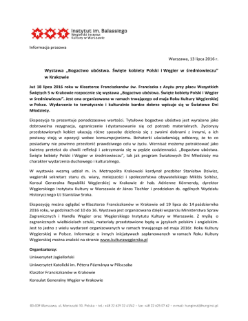 Informacja prasowa Warszawa, 13 lipca 2016 r. Wystawa „Bogactwo ubóstwa. Święte kobiety Polski i Węgier w średniowieczu” w Krakowie Już 18 lipca 2016 roku w Klasztorze Franciszkanów św. Franciszka z Asyżu przy placu Wszystkich Świętych 5 w Krakowie rozpocznie się wystawa „Bogactwo ubóstwa. Święte kobiety Polski i Węgier w średniowieczu”. Jest ona organizowana w ramach trwającego od maja Roku Kultury Węgierskiej w Polsce. Wydarzenie to tematycznie i kulturalnie bardzo dobrze wpisuje się w Światowe Dni Młodzieży. Ekspozycja ta prezentuje ponadczasowe wartości. Tytułowe bogactwo ubóstwa jest wyrażone jako dobrowolna rezygnacja, ograniczenie i dystansowanie się od potrzeb materialnych. Życiorysy przedstawionych kobiet ukazują różne sposoby dzielenia się z swoimi dobrami z innymi, a ich postawy stoją w opozycji wobec konsumpcjonizmu. Bohaterki uświadamiają odbiorcy, że to co posiadamy nie powinno przesłonić prawdziwego celu w życiu. Wernisaż możemy potraktować jako świetny pretekst do chwili refleksji i zatrzymania się w pędzie codzienności. „Bogactwo ubóstwa. Święte kobiety Polski i Węgier w średniowieczu”, tak jak program Światowych Dni Młodzieży ma charakter wydarzenia duchowego i kulturalnego. W wystawie wezmą udział m. in. Metropolita Krakowski kardynał prezbiter Stanisław Dziwisz, węgierski sekretarz stanu ds. wiary, mniejszości i społeczeństwa obywatelskiego Miklós Soltész, Konsul Generalna Republiki Węgierskiej w Krakowie dr hab. Adrienne Körmendy, dyrektor Węgierskiego Instytutu Kultury w Warszawie dr János Tischler i prodziekan ds. ogólnych Wydziału Historycznego UJ Stanisław Sroka. Ekspozycję można oglądać w Klasztorze Franciszkanów w Krakowie od 19 lipca do 14 października 2016 roku, w godzinach od 10 do 16. Wystawa jest organizowana dzięki wsparciu Ministerstwa Spraw Zagranicznych i Handlu Węgier oraz Węgierskiego Instytutu Kultury w Warszawie. Z myślą o zagranicznych wielbicielach sztuki, materiały przedstawione będą w językach polskim i angielskim. Jest to jedno z wielu wydarzeń organizowanych w ramach trwającego od maja 2016r. Roku Kultury Węgierskiej w Polsce. Informacje o innych inicjatywach zaplanowanych w ramach Roku Kultury Węgierskiej można znaleźć na stronie www.kulturawęgierska.pl Organizatorzy: Uniwersytet Jagielloński Uniwersytet Katolicki im. Pétera Pázmánya w Piliscsaba Klasztor Franciszkanów w Krakowie Konsulat Generalny Węgier w Krakowie Partnerzy: Węgierski Instytut Kultury Patroni medialni: TVP, TVP Kultura, Polskie Radio *** Kontakt dla mediów: Monika Błaszczak Węgierski Instytut Kultury e–mail: [email protected] tel: +48 22 629 32 44 mob: +48 606 46 90 35 Justyna Owczarek Synertime e–mail: [email protected] tel.: +48 22 544 05 15