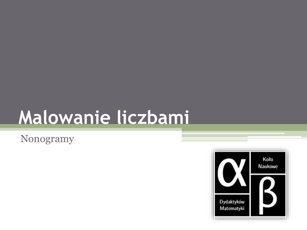 Malowanie liczbami Nonogramy Malowanie liczbami Logiczna łamigłówka o prostych zasadach, ale rozwiązaniu wymagającym odpowiedniej strategii. Łamigłówka polega na zaznaczeniu właściwych pól diagramu, za którym kryje się obrazek. Zasady Podczas rozwiązywania obrazków logicznych trzeba decydować, która komórka ma być zamalowana, a która ma pozostać pusta. Ważną sprawą jest, aby nigdy nie zgadywać. Zgadywanie zazwyczaj kończy się błędem i będziemy zmuszeni zacząć od początku. Co chcemy uzyskać ? Przykłady Po co te cyfry ? Każda cyfra wskazuje ilość czarnych pól w danym rzędzie/kolumnie. Jedna liczba oznacza pojedynczy ciąg czarnych kwadratów. . . . . . . . . . . Co jest niedozwolone ? 22 62 . . . . . . Jak powinno być (przykład) ? 22 62 . . . . . . Kolejność ma znaczenie ! 23 32 . . . . . . . . Jak można zacząć ? Przykład: 3 . 3 . 3 . . . . 6 6 Tylko jedna możliwość ! 2 4 Dziękujemy za uwagę Powodzenia z zadaniami !