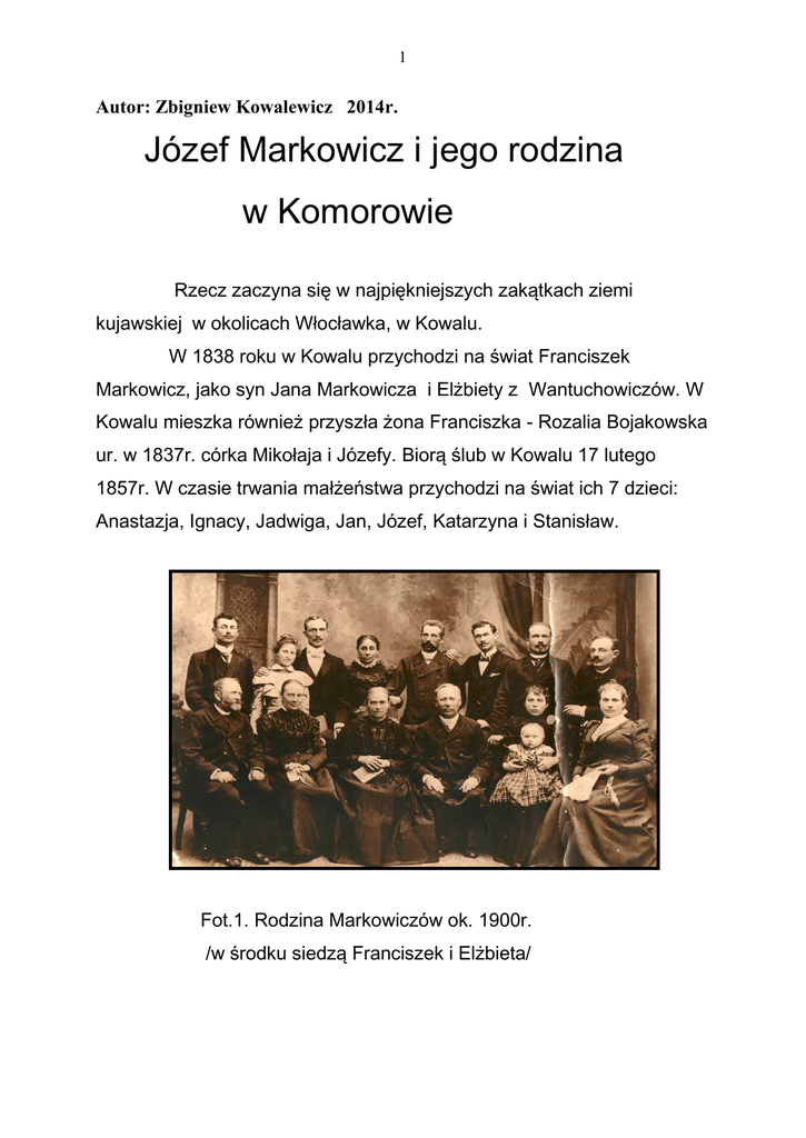 1 Autor: Zbigniew Kowalewicz 2014r. Józef Markowicz i jego rodzina w Komorowie Rzecz zaczyna się w najpiękniejszych zakątkach ziemi kujawskiej w okolicach Włocławka, w Kowalu. W 1838 roku w Kowalu przychodzi na świat Franciszek Markowicz, jako syn Jana Markowicza i Elżbiety z Wantuchowiczów. W Kowalu mieszka również przyszła żona Franciszka - Rozalia Bojakowska ur. w 1837r. córka Mikołaja i Józefy. Biorą ślub w Kowalu 17 lutego 1857r. W czasie trwania małżeństwa przychodzi na świat ich 7 dzieci: Anastazja, Ignacy, Jadwiga, Jan, Józef, Katarzyna i Stanisław. Fot.1. Rodzina Markowiczów ok. 1900r. /w środku siedzą Franciszek i Elżbieta/ 2 Do dnia dzisiejszego na cmentarzu w Kowalu są ślady tej ziemiańskiej, szanowanej i znanej szeroko rodziny w postaci rodzinnego grobowca. Fot.2. Grobowiec rodzinny w Kowalu Fot.3. Tablica na grobie Józef Markowicz ur. dnia 10 stycznia 1877r. o godz, 19-tej w Kowalu /zm. 30.10.1939 w Warszawie, ul. Emilii Plater 18 o godz. 15.10/, rodzice chrzestni: Jan Markowicz i Aniela Bojakowska – akt urodzenia z 1877r. pod nr. 14. 3 Po ukończeniu studiów rolniczych i dzięki ciężkiej pracy oraz szczęściu w interesach już w pierwszych latach XX wieku staje się ziemianinem. W 1901 r. żeni się Marią Gałęzowską ur. 1879 r. w Garwolinie /zm.26.09.1939 w Warszawie/, która staje się wierną towarzyszką życia i udziela mu wsparcia w trudnych chwilach. Fot.4. Maria Markowiczowa Fot.5. Józef Markowicz 4 Do spółki z rodziną Kapuścińskich: Danutą i Marią oraz Józefem i Jerzym kupuje majątek blisko miasta Błonie „Dobra Łuszczewo Wielkie” w 1904 r. Jednak nie wszystko układa się po jego myśli i korzystając z pomocy swej starszej siostry Anastazji Kapuścińskiej ur. 11.04.1863 r. w Kowalu /zm. 6.10.1943/ wydzierżawia w 1908r. majątek w Komorowie noszący nazwę „Dobra Komorów i Sokołów” od p. Józefowicza, który oprócz tego majątku posiadał w Warszawie „Hotel Saski” /obecnie pl.Bankowy/. Fot.6. Anastazja Kapuścińska Fot. 6a Grób Anastazji w Pęcicach 5 Anastazja poślubiła Stanisława Kapuścińskiego ur. w 1864r. /zm. 1908/ pochodzącego z Lubienia k.Kowala i miała z nim pięcioro dzieci, z których Bolesław Kapuściński ur.12.12. 1897 r. mieszkał aż do swojej śmierci w r. 1977 w Komorowie. Jako dziecko Bolesław Kapuściński uczęszczał do trzyklasowej szkoły w Pęcicach gdzie nauczycielem był prof. Sierajewski. O okresie tym mówił Bolesław, że najbardziej dało mu się we znaki chodzenie piechotą do dość odległych Pęcic w czasie wiosennych roztopów i deszczy jesiennych po kolana w błocie. O wielkości majątku tak mówi sam Józef Markowicz: składał się z 380 morgów ziemi ornej, 20 morgów ogrodu, 6 morgów stawów, 60 morgów lasu sosnowo-brzozowo-świerkowego, 60 morgów łąk dwukośnych i obory zarodowej składającej się ze 100 sztuk dojnych krów. Fot.7. mapa Komorowa z ok. 1900r. /ze zbioru T.Terleckiego/ Dzięki swojej ciężkiej pracy, unowocześnieniu gospodarstwa, co sprzyjało większym zyskom oraz pożyczce wziętej z Banku Rolnego w dniu 22 lutego 1912 roku Józef Markowicz nabywa majątek na własne nazwisko spłacając całkowicie swoją siostrę Anastazję. 6 Aby nie być zdanym na koniunkturalne wahania cen produktów rolnych, Markowicz od samego początku podpisuje wieloletnie umowy z dużymi odbiorcami. I tak np. odbiór buraków cukrowych zapewniała Fabryka cukru i rafinady w Józefowie k.Błonia, odbiór maku firma J.Marczewski i J.Kirchmayer, pszenicy – gorzelnia w Płochocinie, warzywa z ogrodu oraz mleko i jego przetwory dostarczane były do Warszawy do sklepu braci Pakulskich itp. Ponieważ do majątku i z niego transportowano ogromne masy towarów Józef Markowicz zadbał, aby to uprościć budując konną kolejkę idącą od majątku. Podłączono ją do istniejącej sieci tramwaju konnego w Pruszkowie. Dzięki temu w prosty sposób dostarczano towar na dworzec kolejowy w Pruszkowie a stamtąd przywożono np. nawozy sztuczne niezbędne przy nowoczesnej uprawie roli. Kolejka ta zapewniała również łatwy przewóz dla coraz liczniej wypoczywających w okresie letnim warszawiaków. Kolejka istniała i bardzo dobrze prosperowała aż do uruchomienia Elektrycznej Kolei Dojazdowej /EKD/ w 1927 roku. Bardzo intensywna była hodowla karpi w stawie leżący w parku przy Pałacu. Aby zapewnić przepływ świeżej wody przez stawy wykorzystano pobliską rzekę Utratę robiąc na niej tamę i kanały wodne. 7 Fot.8. Widok stawów w parku na obrazie K.Lipskiego z 1933r. Stawy te służyły również jako źródło lodu na letnie miesiące. Lód magazynowany był w ogromnej lodowni położonej koło pałacu przy wjeździe na podwórze. Pałac od początków rządów Józefa Markowicza według jego założeń miał przynosić dochód i w tym celu był wynajmowany. Od 1908 r. mieszkały w nim zakonnice ze szpitala Dzieciątka Jezus w Warszawie. Fot.9. Widok pałacu w majątku Fot. 9a Widok pałacu od strony ogrodu 8 Potem ok. 1910r. prowadzony był prywatny pensjonat wypoczynkowy pani Muszyńskiej. W 1912r. a więc w momencie kupna majątku pałac został wydzierżawiony po dokonaniu odpowiednich przeróbek i adaptacji na zakład przyrodo-leczniczy prowadzony przez dwu lekarzy ze szpitala w Tworkach dr. Knopfa i dr. Kopczyńskiego. Pałac i otoczenie: park, stawy i ogród zostały dostosowane do tych potrzeb. W pałacu zmieniono wyposażenie pokoi, zainstalowano urządzenia zabiegowe jak: hydroterapia, fizykoterapia, naświetlania oraz kąpielisko słoneczne. W parku wybudowano kort tenisowy. Nad stawami wygrabiono alejki spacerowe obsadzone peoniami. Po stawach majestatycznie pływały białe łabędzie a alejkami spacerowały mieniące się tęczą kolorów pawie rozkładające swe ogony. W ogrodzie uprawiano warzywa na potrzeby własne, pacjentów i na sprzedaż. Od strony pałacu było nieprzebrane mnóstwo kwiatów zasadzonych na rabatach. Po