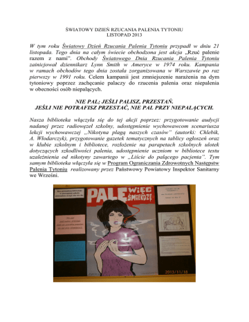 ŚWIATOWY DZIEŃ RZUCANIA PALENIA TYTONIU LISTOPAD 2013 W tym roku Światowy Dzień Rzucania Palenia Tytoniu przypadł w dniu 21 listopada. Tego dnia na całym świecie obchodzona jest akcja „Rzuć palenie razem z nami”. Obchody Światowego Dnia Rzucania Palenia Tytoniu zainicjował dziennikarz Lynn Smith w Ameryce w 1974 roku. Kampania w ramach obchodów tego dnia została zorganizowana w Warszawie po raz pierwszy w 1991 roku. Celem kampanii jest zmniejszenie narażenia na dym tytoniowy poprzez zachęcanie palaczy do rzucenia palenia oraz niepalenia w obecności osób niepalących. NIE PAL; JEŚLI PALISZ, PRZESTAŃ. JEŚLI NIE POTRAFISZ PRZESTAĆ, NIE PAL PRZY NIEPALĄCYCH. Nasza biblioteka włączyła się do tej akcji poprzez: przygotowanie audycji nadanej przez radiowęzeł szkolny, udostępnienie wychowawcom scenariusza lekcji wychowawczej „Nikotyna plagą naszych czasów” (autorki: Chlebik, A. Włodarczyk), przygotowanie gazetek tematycznych na tablicy ogłoszeń oraz w klubie szkolnym i bibliotece, rozłożenie na parapetach szkolnych ulotek dotyczących szkodliwości palenia, udostępnienie uczniom w bibliotece testu uzależnienia od nikotyny zawartego w „Liście do palącego pacjenta”. Tym samym biblioteka włączyła się w Program Ograniczania Zdrowotnych Następstw Palenia Tytoniu realizowany przez Państwowy Powiatowy Inspektor Sanitarny we Wrześni.