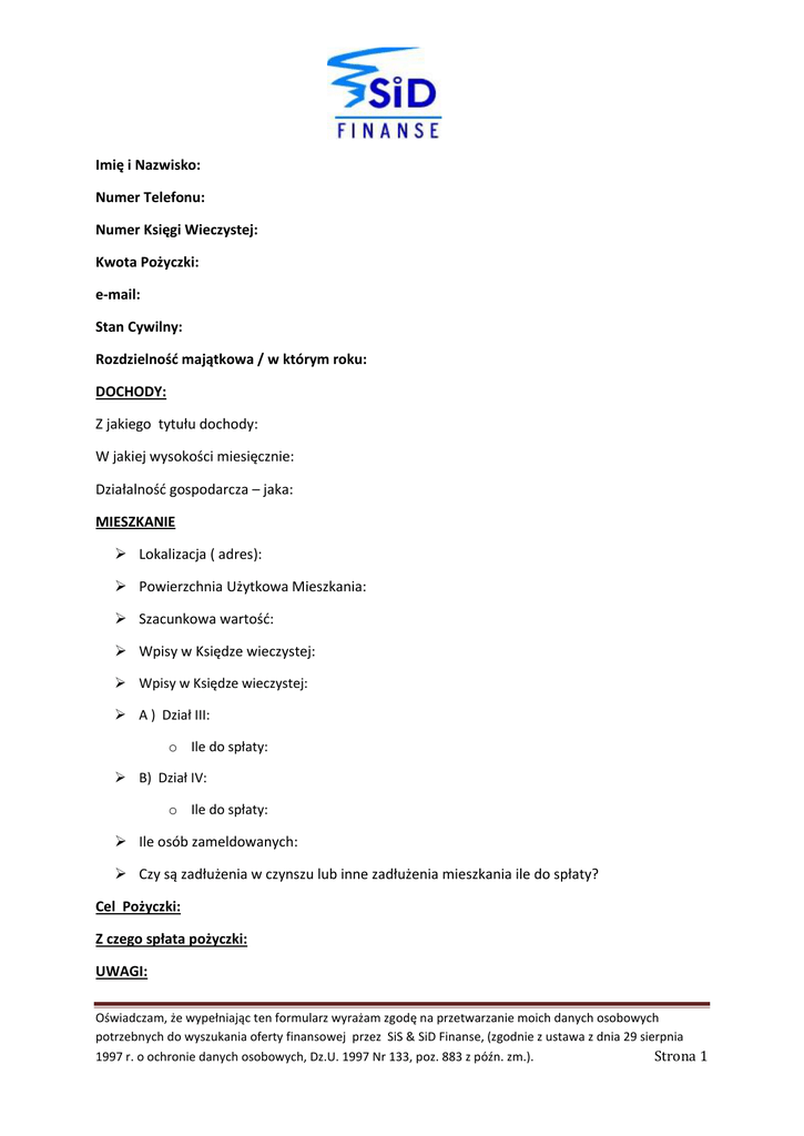Imię i Nazwisko: Numer Telefonu: Numer Księgi Wieczystej: Kwota Pożyczki: e-mail: Stan Cywilny: Rozdzielność majątkowa / w którym roku: DOCHODY: Z jakiego tytułu dochody: W jakiej wysokości miesięcznie: Działalność gospodarcza – jaka: MIESZKANIE Lokalizacja ( adres): Powierzchnia Użytkowa Mieszkania: Szacunkowa wartość: Wpisy w Księdze wieczystej: Wpisy w Księdze wieczystej: A ) Dział III: o Ile do spłaty: B) Dział IV: o Ile do spłaty: Ile osób zameldowanych: Czy są zadłużenia w czynszu lub inne zadłużenia mieszkania ile do spłaty? Cel Pożyczki: Z czego spłata pożyczki: UWAGI: Oświadczam, że wypełniając ten formularz wyrażam zgodę na przetwarzanie moich danych osobowych potrzebnych do wyszukania oferty finansowej przez SiS & SiD Finanse, (zgodnie z ustawa z dnia 29 sierpnia 1997 r. o ochronie danych osobowych, Dz.U. 1997 Nr 133, poz. 883 z późn. zm.). Strona 1