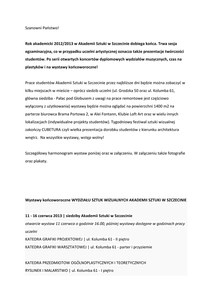 Szanowni Państwo! Rok akademicki 2012/2013 w Akademii Sztuki w Szczecinie dobiega końca. Trwa sesja egzaminacyjna, co w przypadku uczelni artystycznej oznacza także prezentacje twórczości studentów. Po serii otwartych koncertów dyplomowych wydziałów muzycznych, czas na plastyków i na wystawy końcoworoczne! Prace studentów Akademii Sztuki w Szczecinie przez najbliższe dni będzie można zobaczyć w kilku miejscach w mieście – oprócz siedzib uczelni (ul. Grodzka 50 oraz ul. Kolumba 61, główna siedziba -‐ Pałac pod Globusem z uwagi na prace remontowe jest częściowo wyłączony z użytkowania) wystawy będzie można oglądać na powierzchni 1400 m2 na parterze biurowca Brama Portowa 2, w Alei Fontann, Klubie Loft Art oraz w wielu innych lokalizacjach (indywidualne projekty studentów). Tygodniowy festiwal sztuki wizualnej zakończy CUBETURA czyli wielka prezentacja dorobku studentów z kierunku architektura wnętrz. Na wszystkie wystawy, wstęp wolny! Szczegółowy harmonogram wystaw poniżej oraz w załączeniu. W załączeniu także fotografie oraz plakaty. Wystawy końcoworoczne WYDZIAŁU SZTUK WIZUALNYCH AKADEMII SZTUKI W SZCZECINIE 11 -‐ 16 czerwca 2013 | siedziby Akademii Sztuki w Szczecinie otwarcie wystaw 11 czerwca o godzinie 16.00, później wystawy dostępne w godzinach pracy uczelni KATEDRA GRAFIKI PROJEKTOWEJ | ul. Kolumba 61 -‐ II piętro KATEDRA GRAFIKI WARSZTATOWEJ | ul. Kolumba 61 -‐ parter i przyziemie KATEDRA PRZEDMIOTOW OGÓLNOPLASTYCZNYCH I TEORETYCZNYCH RYSUNEK I MALARSTWO | ul. Kolumba 61 -‐ I piętro RZEŹBA | ul. Grodzka 50 11 czerwca -‐ 15 lipca 2013 | Galeria w Alei Fontann PRACOWNIA PROJEKTOWANIA GRAFICZNEGO POD KIERUNKIEM PROF. LEXA DREWINSKIEGO część ekspozycji w witrynach pawilonów gastronomicznych czynna 24h, ekspozycja we wnętrzach dostępna w godzinach otwarcia lokali 15 – 22 czerwca 2013 | biurowiec Brama Portowa I otwarcie Triennale i wystawy końcoworocznej -‐ 15 czerwca 2013 o godzinie 18.00 KATEDRA ARCHITEKTURY WNĘTRZ wystawa podczas Studenckiego Triennale Architektury Wnętrz CUBETURA Na wszystkie wystawy wstęp wolny! HISTORIA WYDZIAŁU SZTUK WIZUALNYCH Wydział Sztuk Wizualnych powstał w oparciu o strukturę, studentów i kadrę naukowo-‐ dydaktyczną Wyższej Szkoły Sztuki Użytkowej w Szczecinie, która powstała 15 lipca 1995 roku z inicjatywy prof. Marii Radomskiej-‐Tomczuk oraz artystów plastyków i naukowców głównie Pomorza Zachodniego. W pierwszej kolejności uruchomiono kierunek grafika, a następnie architekturę wnętrz. Pracownicy i absolwenci zdobyli liczne nagrody i wyróżnienia na krajowych i międzynarodowych konkursach i wystawach. Podstawową bazę lokalową Wydziału Sztuk Wizualnych stanowią sale dydaktyczne, pracownie specjalistyczne i sale ćwiczeniowe w budynkach: przy pl. Orła Białego 2 oraz ul. Kolumba 61. Wydział Sztuk Wizualnych posiada najnowsze specjalistyczne zaplecze w zakresie sprzętu komputerowego, warsztatowego oraz oprogramowania. Wystawa końcoworoczna Wydziału Malarstwa i Nowych Mediów Akademii Sztuki w Szczecinie 9-‐11 czerwca 2013 | biurowiec Brama Portowa II otwarcie wystawy 9 czerwca o godzinie 18.00 Wydział Malarstwa i Nowych Mediów kształci studentów na studiach I i II stopnia na kierunku grafika specjalność multimedia oraz na studiach I stopnia na kierunku malarstwo. To pierwsza tak duża (1400 m2 powierzchni wystawienniczej) publiczna prezentacja wszystkich pracowni pokazana w jednej przestrzeni. Wystawa końcoworoczna jest podsumowaniem dorocznego dorobku wszystkich pracowni wydziałowych: animacji; działań audiowizualnych, interaktywnych, intermedialnych, multimedialnych, performatywnych; fotografii kreacyjnej i reklamowej; komunikacji wizualnej; malarstwa; projektowania dźwięku i sonologii; rysunku; rzeźby i działań przestrzennych; sztuki w przestrzeni publicznej oraz struktur wizualnych Studenci korzystają z nowocześnie wyposażonych studiów fotograficznych, filmowych, komputerowych oraz studia nagrań. Do dyspozycji studentów jest wypożyczalnia sprzętu komputerowego, fotograficznego, filmowego i nagraniowego. Wśród wykładowców Wydziału MiNM, są uznani artyści i pedagodzy, m.in. Danuta Dąbrowska, Robert Knuth, Piotr C. Kowalski, Kamil Kuskowski, Artur Malewski, Agata Michowska, Krzysztof Olszewski, Małgorzata Szymankiewicz, Waldemar Wojciechowski, Bartłomiej Otocki, Zbigniew Romańczuk, Aleksandra Ska, Łukasz Skąpski, Katarzyna Szeszycka, Zbigniew Taszycki, Andrzej Wasilewski, Tomasz Wendland, Zorka Wollny, Agata Zbylut. Studenckie Triennale Architektury Wnętrz CUBETURA 15-‐22 czerwca 2013 | biurowiec Brama Portowa I CUBETURA to największa wystawa projektów studentów oraz absolwentów architektury wnętrz od początku istnienia Akademii Sztuki. Przez tydzień w samym centrum Szczecina można będzie zobaczyć najlepsze prace powstałe m.in w Pracowniach Projektowania Mebla, Architektury Wnętrz, Wystaw. Ekspozycjom towarzyszyć będą takie wydarzenia jak: projekcje filmowe, wykłady, prelekcje czy warsztaty architektoniczne we współpracy z producentem foteli i krzeseł SITAG Formy Siedzenia, z udziałem projektantki, laureatki Red Dot Design Award 2012 -‐ Anny Vonhausen. Codziennie w ramach triennale funkcjonować będzie InfoBOX gdzie każdy z uczestników skorzysta z darmowych porad młodych architektów wnętrz -‐ studentów Akademii Sztuki. Myślą przewodnią organizatorów jest promocja i integracja młodego pokolenia projektantów, zaprezentowanie oraz uświadomienie mieszkańcom miasta szerokiego spektrum działalności Akademii Sztuki, pojawiając się (jako najmłodsza uczelnia w Polsce) na dizajnerskiej mapie. organizacja: Koło Naukowe Trójkąt / Akademia Sztuki w Szczecinie CUBETUROWE działy: WARSZTATY Aktywna forma spędzenia czasu w twórczej, kreatywnej atmosferze – warsztaty dedykowane dla profesjonalistów, studentów a także najmłodszych uczestników festiwalu. WYKŁADY Cz
