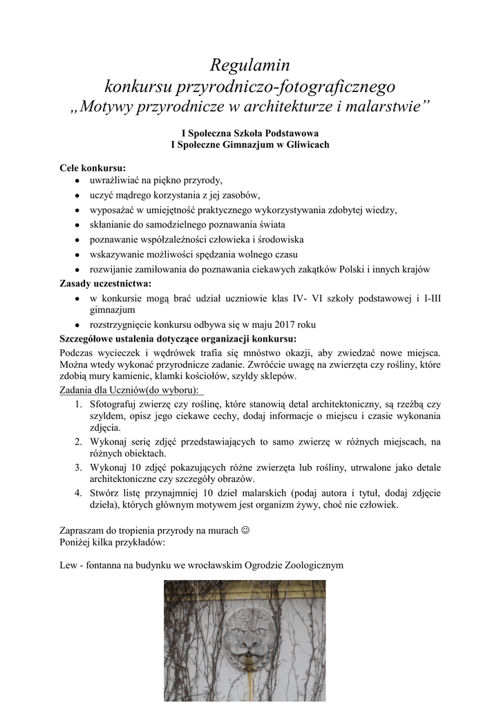Regulamin konkursu przyrodniczo-fotograficznego „Motywy przyrodnicze w architekturze i malarstwie” I Społeczna Szkoła Podstawowa I Społeczne Gimnazjum w Gliwicach Cele konkursu: uwrażliwiać na piękno przyrody, uczyć mądrego korzystania z jej zasobów, wyposażać w umiejętność praktycznego wykorzystywania zdobytej wiedzy, skłanianie do samodzielnego poznawania świata poznawanie współzależności człowieka i środowiska wskazywanie możliwości spędzania wolnego czasu rozwijanie zamiłowania do poznawania ciekawych zakątków Polski i innych krajów Zasady uczestnictwa: w konkursie mogą brać udział uczniowie klas IV- VI szkoły podstawowej i I-III gimnazjum rozstrzygnięcie konkursu odbywa się w maju 2017 roku Szczegółowe ustalenia dotyczące organizacji konkursu: Podczas wycieczek i wędrówek trafia się mnóstwo okazji, aby zwiedzać nowe miejsca. Można wtedy wykonać przyrodnicze zadanie. Zwróćcie uwagę na zwierzęta czy rośliny, które zdobią mury kamienic, klamki kościołów, szyldy sklepów. Zadania dla Uczniów(do wyboru): 1. Sfotografuj zwierzę czy roślinę, które stanowią detal architektoniczny, są rzeźbą czy szyldem, opisz jego ciekawe cechy, dodaj informacje o miejscu i czasie wykonania zdjęcia. 2. Wykonaj serię zdjęć przedstawiających to samo zwierzę w różnych miejscach, na różnych obiektach. 3. Wykonaj 10 zdjęć pokazujących różne zwierzęta lub rośliny, utrwalone jako detale architektoniczne czy szczegóły obrazów. 4. Stwórz listę przynajmniej 10 dzieł malarskich (podaj autora i tytuł, dodaj zdjęcie dzieła), których głównym motywem jest organizm żywy, choć nie człowiek. Zapraszam do tropienia przyrody na murach Poniżej kilka przykładów: Lew - fontanna na budynku we wrocławskim Ogrodzie Zoologicznym Hipopotam we wrocławskim Zoo: Lew - klamka w drzwiach kościoła w Praszce (woj. opolskie) Koordynator konkursu: mgr Cecylia Rojek