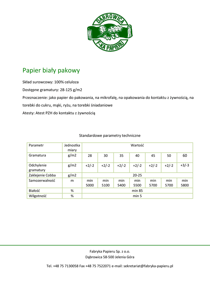 Papier biały pakowy Skład surowcowy: 100% celuloza Dostępne gramatury: 28-125 g/m2 Przeznaczenie: jako papier do pakowania, na mikrofalę, na opakowania do kontaktu z żywnością, na torebki do cukru, mąki, ryżu, na torebki śniadaniowe Atesty: Atest PZH do kontaktu z żywnością Standardowe parametry techniczne Parametr Gramatura Odchylenie gramatury Zaklejenie Cobba Samozerwalność Białość Wilgotność Jednostka miary g/m2 28 30 35 40 45 50 60 g/m2 +2/-2 +2/-2 +2/-2 +2/-2 +2/-2 +2/-2 +3/-3 min 5000 min 5100 min 5400 min 5700 min 5700 min 5800 g/m2 m % % Wartość 20-25 min 5500 min 85 min 5 Fabryka Papieru Sp. z o.o. Dąbrowica 58-500 Jelenia Góra Tel. +48 75 7130058 Fax +48 75 7522071 e-mail: [email protected] Standardowe informacje techniczne Zwoje Szerokość min 13 max 200 cm (dla gramatury pow. 40 g/m2 max 207 cm) Standardowa średnica zewn. 90-120 cm Odstopniowanie 5 mm Tolerancja cięcia +/-1 mm Tolerancja wagowa +/-2 % Bobiny Standardowa szerokość min 7 cm Standardowa średnica zewn. 90-120 cm Tolerancja cięcia +/-1 mm Tolerancja wagowa +/-2 % Arkusze Szerokość min 50 cm max 200 cm Długość min 60 cm max 160 cm Tolerancja cięcia szerokość +/-2 mm długość +/- 5 mm Tolerancja wagowa +/-2 % Dodatkowe operacje (wymagające osobnego uzgodnienia) – sortowanie papieru, cięcie na gilotynie (umożliwa uzyskanie arkuszy o mniejszym i bardziej dokładnym wymiarze), ważenie, ryzowanie. Standardowe opakowanie Papier ułożony na paletach jednorazowych (zwoje w pozycji pionowej), ofoliowany, etykieta producenta. Standardowa wysokość palety 160-180 cm (zwoje do 220 cm) Fabryka Papieru Sp. z o.o. Dąbrowica 58-500 Jelenia Góra Tel. +48 75 7130058 Fax +48 75 7522071 e-mail: [email protected]
