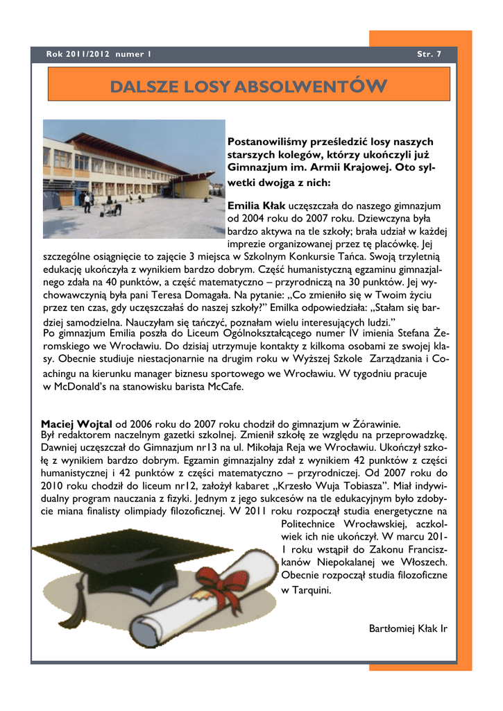 Rok 2011/2012 numer 1 Str. 7 DALSZE LOSY ABSOLWENTÓW Postanowiliśmy prześledzić losy naszych starszych kolegów, którzy ukończyli już Gimnazjum im. Armii Krajowej. Oto sylwetki dwojga z nich: Emilia Kłak uczęszczała do naszego gimnazjum od 2004 roku do 2007 roku. Dziewczyna była bardzo aktywa na tle szkoły; brała udział w każdej imprezie organizowanej przez tę placówkę. Jej szczególne osiągnięcie to zajęcie 3 miejsca w Szkolnym Konkursie Tańca. Swoją trzyletnią edukację ukończyła z wynikiem bardzo dobrym. Część humanistyczną egzaminu gimnazjalnego zdała na 40 punktów, a część matematyczno – przyrodniczą na 30 punktów. Jej wychowawczynią była pani Teresa Domagała. Na pytanie: „Co zmieniło się w Twoim życiu przez ten czas, gdy uczęszczałaś do naszej szkoły?” Emilka odpowiedziała: „Stałam się bardziej samodzielna. Nauczyłam się tańczyć, poznałam wielu interesujących ludzi.” Po gimnazjum Emilia poszła do Liceum Ogólnokształcącego numer IV imienia Stefana Żeromskiego we Wrocławiu. Do dzisiaj utrzymuje kontakty z kilkoma osobami ze swojej klasy. Obecnie studiuje niestacjonarnie na drugim roku w Wyższej Szkole Zarządzania i Coachingu na kierunku manager biznesu sportowego we Wrocławiu. W tygodniu pracuje w McDonald’s na stanowisku barista McCafe. Maciej Wojtal od 2006 roku do 2007 roku chodził do gimnazjum w Żórawinie. Był redaktorem naczelnym gazetki szkolnej. Zmienił szkołę ze względu na przeprowadzkę. Dawniej uczęszczał do Gimnazjum nr13 na ul. Mikołaja Reja we Wrocławiu. Ukończył szkołę z wynikiem bardzo dobrym. Egzamin gimnazjalny zdał z wynikiem 42 punktów z części humanistycznej i 42 punktów z części matematyczno – przyrodniczej. Od 2007 roku do 2010 roku chodził do liceum nr12, założył kabaret „Krzesło Wuja Tobiasza”. Miał indywidualny program nauczania z fizyki. Jednym z jego sukcesów na tle edukacyjnym było zdobycie miana finalisty olimpiady filozoficznej. W 2011 roku rozpoczął studia energetyczne na Politechnice Wrocławskiej, aczkolwiek ich nie ukończył. W marcu 2011 roku wstąpił do Zakonu Franciszkanów Niepokalanej we Włoszech. Obecnie rozpoczął studia filozoficzne w Tarquini. Bartłomiej Kłak Ir
