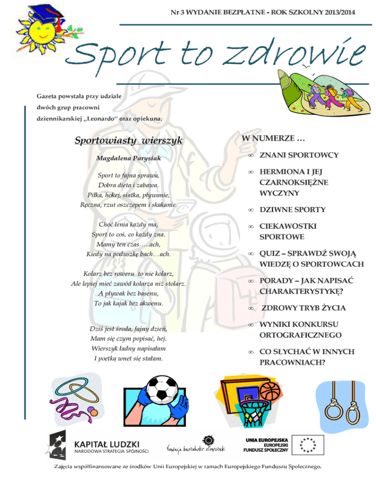Sport to zdrowie ! "#$%!& "'( )*+, *$6-. /')" "'-#$0+ *+ 00+1'%1+ 2 334 #0'*#55 #' #"+ 1)07 89:;9<=>9 ?9@ABC9D EFGHI IG JKLMK NFHKOKP • • QGRHK STUIK T VKRKOKW XTYZKP [GZULP NTKIZKP FY\OKMTUP ]^_VMKP HV`I GNV_VUFUa T NZKZKMTUW b[Gc dUMTK ZKeS\ aKP • • EFGHI IG _GfP _G ZKeS\ VMKW gKa\ IUM _VKNhWWK_[P iTUS\ MK FGS`NVZ^ RK_[hK_[W iGdKHV RUV HGOUH` IG MTU ZGdKHVP jdU dUFTUL aTUc VKOkS ZGdKHVK MTe NIGdKHVW • • j FY\OKZ RUV RKNUM`P lG LKZ ZKLKZ RUV KZOUM`W QVTf LUNI fHGSKP JKLM\ SVTUmP • • gKa NT^ _V\a FGFTNKcP [ULW nTUHNV\Z YKSM\ MKFTNKYKa o FGUIZp OMUI NT^ NIKYKaW • Pracownia dziennikarska Opiekun: p. Izabela Gu niczak Młodzi dziennikarze: Grupa I Grupa II Szymon Cie lak Edyta Lorent Wiktoria Grenda Malwina Siwi ska Martyna Heinrich Oliwia Sagan Seweryn Hnat Kaja Botwina Natalia Janowicka Wiktoria Mazurek Kacper Nadzieja Mieszko Goł b Nikodem Lech Agata Zygmunt Paweł Nakonieczny Oliwia Banasik Magdalena Parysiak Kinga Kostrzanowska Wiktoria Podle Nikola Dorsz Marcin Rudzi ski Julia Bakalarczyk Aleksandra Witkowska Kacper Krawczyk Zuzanna Witkowska Kacper Drapikowski Justyna Stolarczyk Kacper Synowiec Andrzej Doroszko Szkoła Podstawowa w Dobrej, ul. Mieszcza ska 2, 72-210 Dobra Sport to zdrowie… co w numerze ? Porady, czyli jak napisać charakterystykę?………………………………………..…………...4 Znani sportowcy………………………………………..…………………………………..……...4 Jak zdrowo się odżywiać?………………………………………..……………………………….6 Młody sportowiec i jego zdrowy tryb życia………………………………………..……………6 Ciekawostki o sporcie………………………………………..……………………………............7 Dziwne dyscypliny sportowe………………………………………..…………………….………7 Hermiona i Czarnoksi ne Sporty………………………………………..……………….……….8 Quiz………………………………………..………………………………………………………..8 Co słychać w naszych pracowniach?………………………………………..…………….……..9 Wyniki konkursu ortograficznego KULINARIA……………………………………………….11 Poćwicz swoją ortografię………………………………………..………………………………..12 Zawody w unihokeju………………………………………..………………………………….…12 PORADY, czyli jak napisać charakterystykę? Charakterystyka jest to rozszerzony opis postaci. Pamiętaj, że musi ona posiadać kilka stałych elementów: 1. Wst p, w którym powinny znale si informacje o jego/jej yciu np. ile miał lat, jak miał na imi , gdzie mieszkał i co robił. 2. Informacje o wygl dzie zewn trznym (sylwetka, kolor oczu i włosów, znaki szczególne, ubiór itp.). 3. Opis cech charakteru i zachowania poparty przykładami. 4. Zako czenie, które powinno zawiera Twoj ocen postaci. Napisz, co uwa asz o bohaterze, oce go, czy wzbudza Twoj sympati , czy te nie. Pami taj, e ka da cz charakterystyki powinna by rozpocz ta od akapitu! Magdalena Parysiak ZNANI SPORTOWCY Robert Lewandowski urodził si dnia 21 sierpnia 1988 roku w Warszawie. Polak ten jest jednym z najbardziej rozpoznawalnych piłkarzy na wiecie. Obecnie gra w niemieckim klubie Borussia Dortmund oraz w reprezentacji Polski. Ten przystojny piłkarz ma niebieskie oczy, czarne włosy, mierzy 183 cm i wa y 76 kilogramów. Robert jest bardzo skromny, nie lubi o sobie za du o mówi , jednak w którym z wywiadów opowiadał, e wiara w Boga jest dla niego bardzo wa na. Od dziecka charakteryzowała go ch uprawiania sportów, poniewa jego rodzina tak e miała wiele wspólnego ze sportem. Jego ojciec uprawiał judo oraz grał w piłk no n , natomiast matka była siatkark . Na dzie dzisiejszy klub, w którym gra wycenił naszego piłkarza na 160 mln zł. W przyszło ci chciałbym by taki jak Robert. Uwa am, e jest najlepszym piłkarzem, który posiada niezwykły talent. ródło: http://www.euro-2012.net.pl/wpcontent/uploads/2012/02/Robert-Lewandowski.jpg Marcin Rudzi ski Adam Henryk Małysz przyszedł na wiat dnia 3 grudnia 1977 w Wi le. Jest to najbardziej utytułowany polski skoczek narciarski, medalista olimpijski, a aktualnie kierowca rajdowy. Chłopi ca budowa ciała, w sy, niebieskie oczy, kolczyk w uchu to cechy charakterystyczne naszego skoczka. Jako osoba Adam jest niezwykle nie miały, ródło:http://regiomoto.pl/portal/rajdy/adam-malysz-w-rajdzie-dakarceluje-w-pierwsza-dwudziestke wra liwy, ale zarazem odwa ny i ambitny. To dzi ki niemu w Polsce zacz to interesowa si skokami narciarskimi. Zjawisko małyszomanii doprowadziło nawet do tego, e cała Polska nosiła w sy. Razem ze swoj on Izabel stworzyli fundacj , która pomaga niepełnosprawnym sportowcom. Małysz to bez w tpienia bohater narodowy. Jest moim ulubionym sportowcem. Jak dorosn , chc by dokładnie taki jak on. Kacper Krawczyk ródło:http://www.plotkowanie.eu/wpcontent/uploads/2012/02/adam-malysz.jpg Cristiano Ronaldo dos Santos Aveiro urodził si 5 lutego 1985 roku w Funchal w Portugalii. Jest to portugalski piłkarz nosz cy przydomek "CR7". Profesjonaln karier rozpocz ł w klubie Sporting Lizbona. Ze Sportingu trafił do Manchesteru United i to wła nie z Manchesterem zdobył Puchar Ligi Mistrzów oraz 2 puchary Anglii. W 2009 roku CR7 został ci gni ty przez Real Madryt za 96 mln euro. Od 2004 roku wyst puje równie w reprezentacji Portugalii. Portugalczyk, który ma 28 lat jest dobrze zbudowanym m czyzn o czarnych włosach i br zowych oczach. Na boisku wyst puje w butach firmy Nike, z któr podpisał kontrakt. Na co dzie ubiera si stylowo i ma nawet własn mark ubra . Naszym zdaniem Cristiano Ronaldo jest wzorem do na ladowania i chcieliby my w przyszło ci gra tak jak on. Nikodem Lech, Kacper Nadzieja ródło:http://pl.