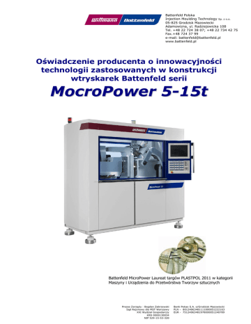 Battenfeld Polska Injection Moulding Technology Sp. z o.o. 05-825 Grodzisk Mazowiecki Adamowizna, ul. Radziejowicka 108 Tel. +48 22 724 38 07; +48 22 734 42 75 Fax.+48 724 37 99 e-mail: [email protected] www.battenfeld.pl Oświadczenie producenta o innowacyjności technologii zastosowanych w konstrukcji wtryskarek Battenfeld serii MocroPower 5-15t Battenfeld MicroPower Laureat targów PLASTPOL 2011 w kategorii Maszyny i Urządzenia do Przetwórstwa Tworzyw sztucznych Prezes Zarządu : Bogdan Zabrzewski Sąd Rejonowy dla MST Warszawy XXI Wydział Gospodarczy KRS 0000130034 NIP 529-15-53-320 Bank Pekao S.A. o/Grodzisk Mazowiecki PLN – 80124063481111000051222163 EUR - 75124063481978000051240789 Battenfeld Polska Injection Moulding Technology Sp. z o.o. 05-825 Grodzisk Mazowiecki Adamowizna, ul. Radziejowicka 108 Tel. +48 22 724 38 07; +48 22 734 42 75 Fax.+48 724 37 99 e-mail: [email protected] www.battenfeld.pl Szanowni Państwo! Reprezentowana przez naszą firmę, firma Wittmann Battenfeld GmbH jest jednym z najstarszych i największych na świecie producentów wtryskarek i urządzeń do przetwórstwa tworzyw sztucznych. Nazwa Battenfeld od bardzo dawna kojarzona jest z nowatorskimi rozwiązaniami konstrukcyjnymi maszyn i nowymi technologiami wtrysku. Firma nasza była pionierem wtrysku wielokolorowego, wtrysku wspomaganego gazem i wielu innych, stosowanych dziś powszechnie, technologii. Konstrukcje naszych wtryskarek bazowały zawsze na najnowocześniejszych rozwiązaniach technicznych. Battenfeld GmbH zapisał się wielokrotnie na kartach historii przemysłu przetwórstwa tworzyw sztucznych 1949 Werner Battenfeld konstruuje i buduje pierwszą wtryskarkę. 1969 budujemy pierwszą wtryskarkę sterowaną elektronicznie. 1975 na targach K'75 prezentujemy pierwszą wtryskarkę do wtrysku wielokomponentowego. 1979 na targach K'79 prezentujemy pierwszą wtryskarkę ze sterowaniem CNC. 1987 wprowadzamy technologię wtrysku z gazem AIRMOULD. 1998 na targach K’98 przedstawiamy pierwszą wtryskarkę do mikro detali MICROSYSTEM. Na największych na świecie targach w naszej branży, targach K’2011 w Duesseldorf, pokazaliśmy po raz pierwszy naszą najnowszą konstrukcję dla wtrysku mikro wyprasek MicroPower. Nowa konstrukcja obejmuje mini serię dwóch maszyn o siłach zamykania 5 i 15t i dwóch jednostkach wtryskowych o objętości wtrysku 1,2 lub 3,0 cm3. Jako Producent i dostawca wtryskarki MicroPower 5-15t możemy oświadczyć, ze zastosowane w tej konstrukcji innowacyjne rozwiązania są znane i stosowane na Świecie od roku 2010 . O innowacyjnym charakterze konstrukcji MicroPower może świadczyć fakt nagrodzenia tej maszyny na targach PLASTPOL 2011 w kategorii „Maszyny i Urządzenia do Przetwórstwa Tworzyw Sztucznych”. W wtryskarce MicroPower ślimak o średnicy 14mm służy jedynie do plastyfikacji tworzywa. Wtrysk realizowany jest tłokiem o średnicy 5 mm (1,2 cm3), lub 8 mm (3 cm3). Rozdzielenie funkcji plastyfikacji i dozowania oraz wtrysku pozwala na optymalną kontrolę procesu. Opatentowana konstrukcja jednostki wtryskowej MicroPower pozwala na uzyskanie bardzo krótkich dróg płynięcia i powtarzalną homogenizację tworzywa. Dzięki konstrukcji układu wtryskowego możliwym jest utrzymanie stabilnej poduszki tworzywa przy jednoczesnej redukcji jej wielkości, co pozwala na redukcję układu wtryskowego. Wtrysk realizowany może być z bardzo dużymi szybkościami wynoszącymi aż do 750 mm/s, przy ciśnieniu specyficznym wtrysku 3.000 bar. Parametry jednostki plastyfikująco-wtryskowej pozwalają na powtarzalną i kontrolowana produkcję. Wtryskarka MicroPower posiada napęd elektryczny. Każdy z ruchów wykonywany jest przez napęd servo elektryczny. Wysoce dynamiczny napęd silnikiem serwo elektrycznym zapewnia symetryczne rozłożenie siły wywieranej przez 5-cio punktowy, kolanowy układ zamykania. Układ zapewnia także wysoce precyzyjne prowadzenie płyty ruchomej. We wtryskarce MicroPower zastosowano opatentowane rozwiązanie jednostki zamykającej bazujące na konstrukcji ramowej. W zależności od potrzeb układ zamykania maszyny MicroPower może być wyposażony w stół obrotowy. Konstrukcja ta umożliwia zastosowanie systemu Prezes Zarządu : Bogdan Zabrzewski Sąd Rejonowy dla MST Warszawy XXI Wydział Gospodarczy KRS 0000130034 NIP 529-15-53-320 Bank Pekao S.A. o/Grodzisk Mazowiecki PLN – 80124063481111000051222163 EUR - 75124063481978000051240789 Battenfeld Polska Injection Moulding Technology Sp. z o.o. 05-825 Grodzisk Mazowiecki Adamowizna, ul. Radziejowicka 108 Tel. +48 22 724 38 07; +48 22 734 42 75 Fax.+48 724 37 99 e-mail: [email protected] www.battenfeld.pl automatyzacji i robota odbierającego wypraski. Dla Potrzeb maszyny MicroPower firma Wittmann skonstruowała specjalnego robota W8VS2. Przy zastosowaniu modułu stołu obrotowego możliwym jest równoległe usuwanie wyprasek z fazą wtrysku. Taki przebieg procesu zapewnia skrócenie czasu cyklu. MikroPower oferuje dużo przestrzeni dla doposażenia jej w dodatkowe standardowe moduły: np. system kontroli optycznej lub system filtrów pozwalających na zachowanie warunków Czystości w klasie ISO 6 lub 5. Nowatorski charakter wtryskarek serii MicroPower można odnieść do : Poziom hałasu Dla wtryskarek serii TM poziom hałasu odpowiada wymaganiom normy DIN EN-ISO 3744-46 i wynosi 68 dB Poziom hałasu jest poziomem uśrednionym z całego cyklu. Obniżenie poziomu hałasu pozwala na poprawę warunków pracy obsługującego maszynę. Powiązanie pracy każdego z pracowników z jakością produkcji Układ sterowania pozwala na tworzenie indywidualnych stron użytkownika. Stwarza więc możliwość zabezpieczenia parametrów procesu a jednocześnie pozwala na tworzenie stron układu sterowania ściśle dopasowanych do potrzeb i zadań operatora maszyny. Zabezpieczenie poprzez system haseł dostępu zapobiega obsłudze maszyny przez osoby przypadkowe. Każdy pracownik ma indywidualne hasło dost