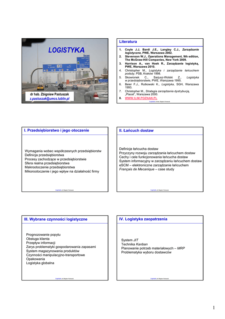 Literatura LOGISTYKA 1. 2. 3. 4. 5. 6. dr hab. Zbigniew Pastuszak [email protected] 7. 8. Coyle J.J, Bardi J.E., Langley C.J., Zarządzanie logistyczne, PWE, Warszawa 2002. Stevenson W.J., Operations Management, 9th edition, The McGraw-Hill Companies, New York 2009. Harrison A., van Hoek R., Zarządzanie logistyką, PWE, Warszawa 2010. Christopher M., Logistyka i zarządzanie łańcuchem podaży, PSB, Kraków 1998. Skowronek C., Sarjusz-Wolski Z., Logistyka w przedsiębiorstwie, PWE, Warszawa 1995. Beier F.J., Rutkowski K., Logistyka, SGH, Warszawa 1993. Christopher M., Strategia zarządzania dystrybucją, „Placet”, Warszawa 2000. 2 WWW.ILIM.POZNAN.PL Logistyka, dr hab. Zbigniew Pastuszak I. Przedsiębiorstwo i jego otoczenie Wymagania wobec współczesnych przedsiębiorstw Definicja przedsiębiorstwa Procesy zachodzące w przedsiębiorstwie Sfera realna przedsiębiorstwa Makrootoczenie przedsiębiorstwa Mikorootoczenie i jego wpływ na działalność firmy Logistyka, dr Zbigniew Pastuszak III. Wybrane czynności logistyczne Prognozowanie popytu Obsługa klienta Przepływ informacji Zarys problematyki gospodarowania zapasami System magazynowania produktów Czynności manipulacyjno-transportowe Opakowania Logistyka globalna Logistyka, dr Zbigniew Pastuszak II. Łańcuch dostaw Definicje łańcucha dostaw Przyczyny rozwoju zarządzania łańcuchem dostaw Cechy i cele funkcjonowania łańcucha dostaw System informacyjny w zarządzaniu łańcuchem dostaw eSCM – elektroniczne zarządzanie łańcuchem Français de Mecanique – case study Logistyka, dr Zbigniew Pastuszak IV. Logistyka zaopatrzenia System JIT Technika Kanban Planowanie potrzeb materiałowych – MRP Problematyka wyboru dostawców Logistyka, dr Zbigniew Pastuszak 1 V. Logistyka produkcji Ustalanie wielkości programu produkcji Organizacja procesów wytwarzania – rozmieszczanie stanowisk roboczych Technologia OPT VI. Logistyka dystrybucji Zakres logistyki dystrybucji Kanały dystrybucji Centra dystrybucji – przykład GK SA Problematyka DRP Przykłady organizacji logistycznej procesów dystrybucji – IKEA Logistyka, dr Zbigniew Pastuszak Pochodzenie słowa logistyka Logistyka, dr Zbigniew Pastuszak Prekursorzy logistyki 9 Cesarz bizantyjski Leontos VI (X w. n. e.): Sumaryczne wyłożenie sztuki wojennej (nauki): - strategia, - taktyka, - logistyka (przemarsze wojsk). 9 Baron A.M. de Jomini (1837, Paryż): O logistyce, czyli sztuce wprawiania w ruch oddziałów: - lokalizacja i zaopatrywanie magazynów, - planowanie i realizacja przemarszów, - przygotowywanie środków transportowych, - urządzanie dróg komunikacyjnych, - zaopatrywanie oddziałów. ¾ greckie słowa logos, logikos, logistikon - prawidłowo myślący, rozsądny, siła rozumu, ¾ francuskie loger, logis - kwaterowanie, mieszkanie, kwatera. 9 10 Logistyka, dr hab. Zbigniew Pastuszak Prekursorzy logistyki 9 9 G.C. Thorpe (1875-1936): "Logistyka czysta: Nauka o przygotowaniu wojny" (Pure logistics: The Science of War Preparation, 1917),wyróżnienie pojęć: • logistyka czysta jako wprowadzenie do teorii logistyki, • logistyka stosowana jako zaspokajanie materiałowe potrzeb wojsk w czasie przygotowania i prowadzenia wojny Logistyka, dr hab. Zbigniew Pastuszak Definicje logistyki ¾ Council of Logistics Management: Logistyka jest terminem opisującym proces planowania, realizowania i kontrolowania sprawnego i efektywnego ekonomicznie przepływu surowców, materiałów do produkcji, wyrobów gotowych oraz odpowiedniej informacji z punktu pochodzenia do punktu konsumpcji w celu zaspokojenia wymagań klienta. Departament Obrony USA w czasie II w. światowej: interdyscyplinarne zespoły budujące modele matematyczne planowania i rozwiązywania problemów logistycznych armii - rozwój badań operacyjnych. 11 12 Logistyka, dr hab. Zbigniew Pastuszak Logistyka, dr hab. Zbigniew Pastuszak 2 Przyczyny rozwoju logistyki ¾ ¾ ¾ Przyczyny rozwoju logistyki Utrudnienia w podwyższaniu efektywności - utrudnione osiąganie niższych kosztów (niskie rezerwy w sferze techniki i technologii), Poszerzenie palety oferowanych wyrobów - efekt marketingowego zaoferowania klientowi tego, co sobie życzy (przykład pieluch w Japonii, IKEA, zarządzanie międzykulturowe), Zmiana w nastawieniu do zapasów produkcyjnych z 50:50 na 10:90 (stan zapasów u detalistów oraz hurtowników i producentów), ¾ ¾ ¾ ¾ 13 Niepokojący wzrost kosztów transportu (krachy paliwowe w latach 70. – cena baryłki ropy [159 l = 42 galony] wzrosła 385%!, 80., 90.), Pojawienie się nowych technologii komputerowych lokalizacja klientów, zamówienia, koszty transportu, dostępność przewoźników, lokalizacja dostawców, poziom zapasów, GPS, Wzrost wykorzystania komputerów przez przedsiębiorstwa zaopatrujące i klientów – systemy justin-time, Globalizacja działań gospodarczych. 14 Logistyka, dr hab. Zbigniew Pastuszak Logistyka, dr hab. Zbigniew Pastuszak Podstawowe cechy organizacji Postać społeczno techniczna Otoczenie bliższe przedsiębiorstwa Otwartość Organizacja Złożoność Zdolność do usprawniania Otoczenie bliższe przedsiębiorstwa 15 16 Logistyka, dr hab. Zbigniew Pastuszak Źródło: J. Penc, Strategie Zarządzania Logistyka, dr hab. Zbigniew Pastuszak Konkurencyjność przedsiębiorstwa Konkurencja jakość i ceny Produktywność Produktywność Różnorodność Konkurencyjność Konkurencyjność Jakość Jakośći i niezawodność niezawodność Elastyczność Elastyczność Czynniki konkurencyjności przedsiębiorstwa 17 Logistyka , dr Źródło: S. Lis, K. Santarek, S. Strzelczak, OrganizacjaI elastycznych systemów produkcyjnych,. 18 hab. Zbigniew Pastuszak Logistyka, dr hab. Zbigniew Pastuszak 3 Skrócenie cyklu życia wyrobu Ile czasu zajmuje wyprodukowanie jednego samochodu ? Czas realizacji musi być tak krótki, jak tylko jest to możliwe. Stabilizacja Sprzedaż Spadek W przeszłości Współcześnie Wzrost Wzrost Wprowadzenie na rynek Wprowadzenie Now