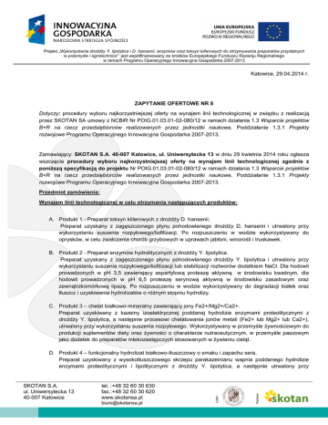 Projekt „Wykorzystanie drożdży Y. lipolytica i D. hansenii, enzymów oraz toksyn killerowych do otrzymywania preparatów przydatnych w przemyśle i agrotechnice" jest współfinansowany ze środków Europejskiego Funduszu Rozwoju Regionalnego w ramach Programu Operacyjnego Innowacyjna Gospodarka 2007-2013 Katowice, 29.04.2014 r. ZAPYTANIE OFERTOWE NR 8 Dotyczy: procedury wyboru najkorzystniejszej oferty na wynajem linii technologicznej w związku z realizacją przez SKOTAN SA umowy z NCBiR Nr POIG.01.03.01-02-080/12 w ramach działania 1.3 Wsparcie projektów B+R na rzecz przedsiębiorców realizowanych przez jednostki naukowe, Poddziałanie 1.3.1 Projekty rozwojowe Programu Operacyjnego Innowacyjna Gospodarka 2007-2013. Zamawiający: SKOTAN S.A. 40-007 Katowice, ul. Uniwersytecka 13 w dniu 29 kwietnia 2014 roku ogłasza wszczęcie procedury wyboru najkorzystniejszej oferty na wynajem linii technologicznej zgodnie z poniższą specyfikacją do projektu Nr POIG.01.03.01-02-080/12 w ramach działania 1.3 Wsparcie projektów B+R na rzecz przedsiębiorców realizowanych przez jednostki naukowe, Poddziałanie 1.3.1 Projekty rozwojowe Programu Operacyjnego Innowacyjna Gospodarka 2007-2013. Przedmiot zamówienia: Wynajem linii technologicznej w celu otrzymania następujących produktów: A. Produkt 1 - Preparat toksyn killerowych z drożdży D. hansenii. Preparat uzyskany z zagęszczonego płynu pohodowlanego drożdży D. hansenii i utrwalony przy wykorzystaniu suszenia rozpyłowego/liofilizacji. Po rozpuszczeniu w wodzie wykorzystywany do oprysków, w celu zwalczania chorób grzybowych w uprawach jabłoni, winorośli i truskawek. B. Produkt 2 - Preparat enzymów hydrolitycznych z drożdży Y. lipolytica. Preparat uzyskany z zagęszczonego płynu pohodowlanego drożdży Y. lipolytica i utrwalony przy wykorzystaniu suszenia rozpyłowego/liofilizacji lub stabilizacji roztworów dodatkiem NaCl. Dla hodowli prowadzonych w pH 3,5 zawierający aspartylową proteazę aktywną w środowisku kwaśnym, dla hodowli prowadzonych w pH 6,5 proteazę serynową aktywną w środowisku zasadowym oraz zewnątrzkomórkową lipazę. Po rozpuszczeniu w wodzie wykorzystywany do degradacji białek oraz tłuszcz i uzyskiwania hydrolizatów o różnym stopniu hydrolizy. C. Produkt 3 – chelat białkowo-mineralny zawierający jony Fe2+/Mg2+/Ca2+. Preparat uzyskiwany z kazeiny izoelektrycznej poddanej hydrolizie enzymami proteolitycznymi z drożdży Y. lipolytica, a następnie procesowi chelatowania jonów metali (Fe2+ lub Mg2+ lub Ca2+), utrwalony przy wykorzystaniu suszenia rozpyłowego. Wykorzystywany w przemyśle żywnościowym do produkcji suplementów diety oraz żywności o charakterze nutraceutycznym, w przemyśle paszowym jako dodatek do preparatów mlekozastępczych stosowanych w żywieniu cieląt. tel. :+48 32 60 30 630 fax.:+48 32 60 30 620 www.skotansa.pl [email protected] Partner: SKOTAN S.A. ul. Uniwersytecka 13 40-007 Katowice Lider: D. Produkt 4 – funkcjonalny hydrolizat białkowo-tłuszczowy o smaku i zapachu sera. Preparat uzyskiwany z wysokotłuszczowego skrzepu parakazeinianu wapnia poddanego hydrolizie enzymami proteolitycznymi i lipolitycznymi z drożdży Y. lipolytica, a następnie utrwalony przy Projekt „Wykorzystanie drożdży Y. lipolytica i D. hansenii, enzymów oraz toksyn killerowych do otrzymywania preparatów przydatnych w przemyśle i agrotechnice" jest współfinansowany ze środków Europejskiego Funduszu Rozwoju Regionalnego w ramach Programu Operacyjnego Innowacyjna Gospodarka 2007-2013 wykorzystaniu suszenia rozpyłowego. Stosowany w przemyśle żywnościowym jako naturalny dodatek funkcjonalny wykorzystywany do wzmacniania lub odtwarzania smaku i zapachu sera w produktach spożywczych. 1. Niezbędne elementy wyposażenia linii technologicznej: L.P. Nazwa Specyfikacja techniczna 3 1. 2. 3. 4. 5. 6. 3 filtracyjna: min. 30 dm - max. 450 dm , wydajność: min. Membranowa prasa filtracyjna Objętość 3 3 50 dm /h - max. 1000 dm /h 3 3 Wydajność: min. 250 dm /h - max. 1000dm /h, prędkość obrotowa: Wirówka 11.800obr/min Separator wibracyjny Separator wibracyjny z granicami rozdziału 25,125,200 µm 3 Moduł membranowy o wydajności: min. 50 dm /h - max. Instalacja ultrafiltracji 3 1000dm /h, granica rozdziału 5kDa 3 3 Wieża rozpyłowa z Wydajność: min. 5 dm /h - max. 35 dm /h, mechanizm rozpyłowy wibrofluidyzatorem do 30 000 rpm Liofilizator z zamrażarką 3 Objętość robocza: max. 24 dm niskotemperaturową 7. Suszarka tacowa 8. Dozownik 9. Elektropasteryzator 10. Młyn Zakres temperaturowy: min. 25 st. C - max. 130 st. C Wydajność: max. 99 g/s 3 3 Wydajność: min. 250 dm /h - max. 600dm /h, objętość robocza: 3 3 min. 30 dm - max. 40 dm Wydajność: max. 50 kg/h 11. Mieszalnik Mieszalnik bębnowy - objętość robocza: max.70 dm 12. Granulator Wydajność: max. 200 kg/h. 3 2. Pozostałe elementy przedmiotu zamówienia: a) Zapewnienie dostępu do co najmniej 3 zbiorników-mieszalników o objętości od 300 do 2.000 dm3, wyposażonych w mieszadła w szczególności śmigłowe i ramowe, z zastrzeżeniem, iż co najmniej 2 z ww. zbiorników posiadają możliwość regulowania temperatury; 3 b) Zapewnienie dostępu do chłodni o kubaturze 2 m celem przechowywania surowca i produktu; c) Zapewnienie dostępu do 2 paletokontenerów o pojemności 1000 l; d) Zapewnienie utrzymania linii zgodnie z standardami GMP i GHP; Okres wynajmu linii: min. 45 dni roboczych do max. 90 dni roboczych z możliwością przedłużenia. Oferty zawierające: 1. oświadczenie o posiadaniu wszystkich wymienionych w pozycjach 1-12 urządzeń wyposażenia linii technologicznej, spełniających warunki określone w specyfikacji technicznej; tel. :+48 32 60 30 630 fax.:+48 32 60 30 620 www.skotansa.pl [email protected] Partner: SKOTAN S.A. ul. Uniwersytecka 13 40-007 Katowice Lider: 2. cenę netto wyrażoną w polskich złotych dla zestawu wyspecjalizowanych w pozycjach od 1-12 urządzeń w dwóch