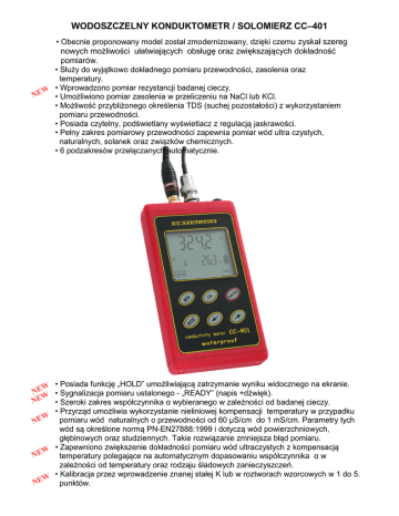 WODOSZCZELNY KONDUKTOMETR / SOLOMIERZ CC–401 • Obecnie proponowany model został zmodernizowany, dzięki czemu zyskał szereg nowych możliwości ułatwiających obsługę oraz zwiększających dokładność pomiarów. • Służy do wyjątkowo dokładnego pomiaru przewodności, zasolenia oraz temperatury. • W Wprowadzono pomiar rezystancji badanej cieczy. NE • Umożliwiono pomiar zasolenia w przeliczeniu na NaCl lub KCl. • Możliwość przybliżonego określenia TDS (suchej pozostałości) z wykorzystaniem pomiaru przewodności. • Posiada czytelny, podświetlany wyświetlacz z regulacją jaskrawości. • Pełny zakres pomiarowy przewodności zapewnia pomiar wód ultra czystych, naturalnych, solanek oraz związków chemicznych. • 6 podzakresów przełączanych automatycznie. W • Posiada funkcję „HOLD” umożliwiającą zatrzymanie wyniku widocznego na ekranie. NE W • Sygnalizacja pomiaru ustalonego - „READY” (napis +dźwięk). NE • Szeroki zakres współczynnika α wybieranego w zależności od badanej cieczy. • Przyrząd umożliwia wykorzystanie nieliniowej kompensacji temperatury w przypadku W pomiaru wód naturalnych o przewodności od 60 µS/cm do 1 mS/cm. Parametry tych E N wód są określone normą PN-EN27888:1999 i dotyczą wód powierzchniowych, głębinowych oraz studziennych. Takie rozwiązanie zmniejsza błąd pomiaru. • W Zapewniono zwiększenie dokładności pomiaru wód ultraczystych z kompensacją NE temperatury polegające na automatycznym dopasowaniu współczynnika α w zależności od temperatury oraz rodzaju śladowych zanieczyszczeń. • Kalibracja przez wprowadzenie znanej stałej K lub w roztworach wzorcowych w 1 do 5. W NE punktów. -2- W • Istnieje możliwość przesłania na komputer raportu z ostatnich dziesięciu kalibracji. NE • Możliwość zmiany wartości temperatury odniesienia. W • W zestawie czujnik konduktometryczny o bardzo dobrej dokładności. Jego zakres NE 0 ¸ 500 mS/cm jest wystarczający do pomiarów przewodności prawie wszystkich cieczy o maksymalnych stężeniach. Metalowe elektrody są łatwe do czyszczenia. Plastykowa obudowa chroni przed mechanicznymi uszkodzeniami. • Do pamięci można wprowadzić stałe K trzech czujników konduktometrycznych. • Zapewniono przeliczanie przewodności na zasolenie wg. rzeczywistej zależności, a nie stałego współczynnika. • Możliwość pomiaru admitancji elektrycznej sadzonek drzew (określenie żywotności sadzonek za pomocą specjalnego czujnika). • Posiada funkcję zegara z kalendarzem. • Pamięć wewnętrzna do 4000 wyników zbieranych pojedynczo lub seryjnie z temperaturą, czasem i datą. • Pamiętanie terminu następnej kalibracji. W • Możliwość połączenia z PC poprzez wyjście mikro USB. NE W • Zasilanie przez akumulatory lub zasilacz przez kabel USB. NE • Wykorzystywany do prac w terenie lub w laboratorium. • Wodoszczelna obudowa (IP-66) ułatwia pracę w trudnych warunkach. • Niewielka masa i wymiary ułatwiają pracę w terenie. • Gwarancja 24 miesiące. • Przyrząd CC-401 otrzymał Złoty Medal na targach EUROLAB. • Do przyrządu dołączana płyta CD z filmem ułatwiającym opanowanie podstaw obsługi. Dane techniczne Funkcja Zakres Dokładność ( 1 cyfra) Kompensacja temp. Zasilanie Zakres współczynnika α Wymiary (mm) / masa (g) Przewodność Rezystancja Zasolenie 0 ¸ 1999.9 mS/cm, 0,500Ωcm ¸ 200MΩcm NaCl 0 ¸ 250 g/l autorange KCl 0 ¸ 200 g/l ±0.1%; > 20 mS/cm: ±2% wartości mierzonej ±2,00% ±0.25%* -5 ¸ 70 ºC -5 ¸ 70 ºC Akumulatory 2 x AA 1,2V, zasilacz USB 5V / 1000mA 0 ¸ 10 %/0C L = 149; W = 82; H = 22 / 220g * Dokładność przyrządu. Całkowita dokładność jest sumą dokładności przyrządu i czujnika temperatury. 41-814 ZABRZE ul. W. Witosa 10 tel. 32 273 81 06, fax 32 273 81 14 [email protected] www.elmetron.pl