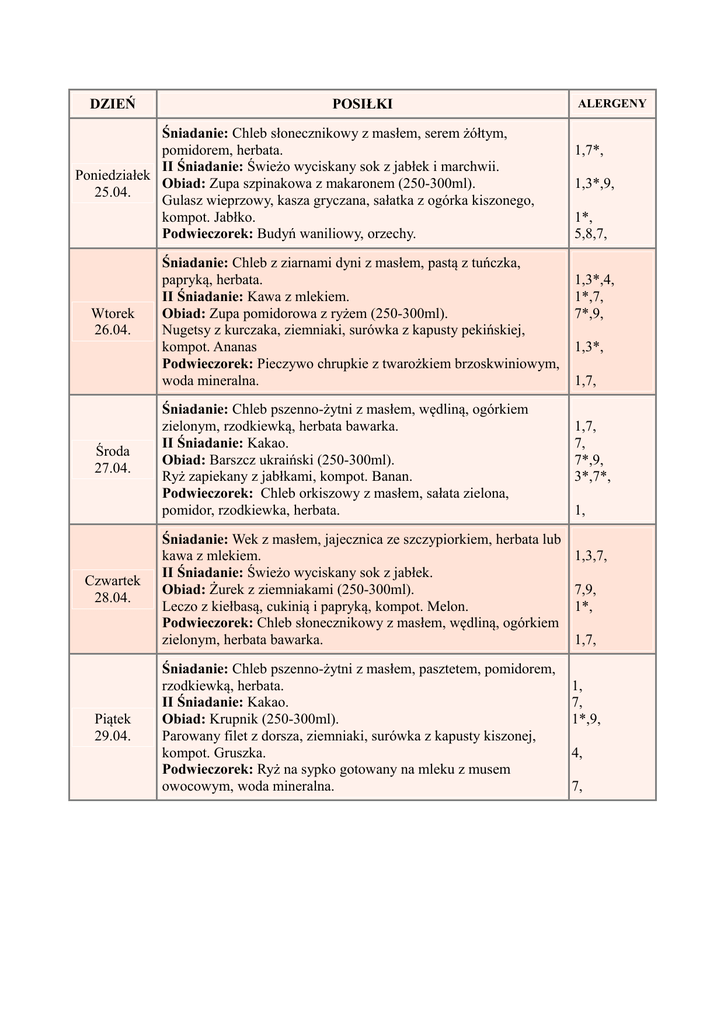DZIEŃ POSIŁKI Śniadanie: Chleb słonecznikowy z masłem, serem żółtym, pomidorem, herbata. II Śniadanie: Świeżo wyciskany sok z jabłek i marchwii. Poniedziałek Obiad: Zupa szpinakowa z makaronem (250-300ml). 25.04. Gulasz wieprzowy, kasza gryczana, sałatka z ogórka kiszonego, kompot. Jabłko. Podwieczorek: Budyń waniliowy, orzechy. Wtorek 26.04. Środa 27.04. Czwartek 28.04. Piątek 29.04. Śniadanie: Chleb z ziarnami dyni z masłem, pastą z tuńczka, papryką, herbata. II Śniadanie: Kawa z mlekiem. Obiad: Zupa pomidorowa z ryżem (250-300ml). Nugetsy z kurczaka, ziemniaki, surówka z kapusty pekińskiej, kompot. Ananas Podwieczorek: Pieczywo chrupkie z twarożkiem brzoskwiniowym, woda mineralna. Śniadanie: Chleb pszenno-żytni z masłem, wędliną, ogórkiem zielonym, rzodkiewką, herbata bawarka. II Śniadanie: Kakao. Obiad: Barszcz ukraiński (250-300ml). Ryż zapiekany z jabłkami, kompot. Banan. Podwieczorek: Chleb orkiszowy z masłem, sałata zielona, pomidor, rzodkiewka, herbata. Śniadanie: Wek z masłem, jajecznica ze szczypiorkiem, herbata lub kawa z mlekiem. II Śniadanie: Świeżo wyciskany sok z jabłek. Obiad: Żurek z ziemniakami (250-300ml). Leczo z kiełbasą, cukinią i papryką, kompot. Melon. Podwieczorek: Chleb słonecznikowy z masłem, wędliną, ogórkiem zielonym, herbata bawarka. Śniadanie: Chleb pszenno-żytni z masłem, pasztetem, pomidorem, rzodkiewką, herbata. II Śniadanie: Kakao. Obiad: Krupnik (250-300ml). Parowany filet z dorsza, ziemniaki, surówka z kapusty kiszonej, kompot. Gruszka. Podwieczorek: Ryż na sypko gotowany na mleku z musem owocowym, woda mineralna. ALERGENY 1,7*, 1,3*,9, 1*, 5,8,7, 1,3*,4, 1*,7, 7*,9, 1,3*, 1,7, 1,7, 7, 7*,9, 3*,7*, 1, 1,3,7, 7,9, 1*, 1,7, 1, 7, 1*,9, 4, 7,