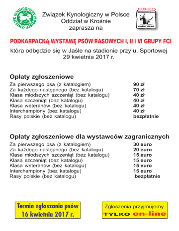 1990-2015 PODKARPACKĄ WYSTAWĘ PSÓW RASOWYCH I, II i VI GRUPY FCI która odbędzie się w Jaśle na stadionie przy u. Sportowej 29 kwietnia 2017 r. Opłaty zgłoszeniowe Za pierwszego psa (z katalogiem) Za każdego następnego (bez katalogu) Klasa młodszych szczeniąt (bez katalogu) Klasa szczeniąt (bez katalogu) Klasa weteranów (bez katalogu) Interchampiony (bez katalogu) Rasy polskie (bez katalogu) 90 zł 70 zł 40 zł 40 zł 40 zł 40 zł bezpłatnie Opłaty zgłoszeniowe dla wystawców zagranicznych Za pierwszego psa (z katalogiem) Za każdego następnego (bez katalogu) Klasa młodszych szczeniąt (bez katalogu) Klasa szczeniąt (bez katalogu) Klasa weteranów (bez katalogu) Interchampiony (bez katalogu) Rasy polskie (bez katalogu) Termin zgłaszania psów 16 kwietnia 2017 r. 30 euro 20 euro 15 euro 15 euro 15 euro 15 euro bezpłatnie Zgłoszenia przyjmujemy TYLKO on−line UWAGA Każdy zgłoszony pies/suka podlega opłacie, bez względu na to, czy zostanie doprowadzony do oceny, czy też nie. Wycofanie zgłoszenia lub zmiana klasy możliwa jest do dnia przyjmowania zgłoszeń. Psy/suki nie ujęte w katalogu nie będą dopuszczone do oceny. Nasze konto l PKO BP O/Krosno 19 1020 2964 0000 6502 0003 4587 na przelewie należy podać rasę, imię psa wraz z przydomkiem oraz nazwisko właściciela Opłata wniesiona po terminie zgłaszania psów oraz w dniu wystawy 150 zł Wystawcy zagraniczni 40 euro Opłata ta obowiązuje bez względu na ilość zgłoszonych psów i dotyczy także szczeniąt, weteranów, interchampionów. Zgłoszenie psa na obie wystawy = 150 zł (40 €) l szczenięta, weterani, interchampiony = 70 zł (20 €) Potwierdzona obsada sędziowska I Grupa FCI Andrzej Kotulski - ON Małgorzata Wieremiejczyk-Wierzchowska, Iwona Giczela - pozostałe rasy I Grupy FCI II Grupa FCI Iwona Giczela - pinczery, sznaucery Andrzej Kot, Monika Kuriata-Okarmus - pozostałe rasy II Grupy FCI VI Grupa FCI Andrzej Kot - Gończy Polski, Ogar Polski Małgorzata Wieremiejczyk-Wierzchowska - pozostałe rasy VI Grupy FCI Obsada sędziowska może ulec zmianie z przyczyn niezależnych od organizatora. REGULAMIN Podkarpackiej Wystawy Psów Rasowych I, II i VI Grupy FCI oraz XXVI Podkarpackiej Wystawy Psów Rasowych Na wystawę można zgłaszać psy i suki wszystkich ras uznanych przez FCI, zarejestrowane w Związku Kynologicznym, a właściciele mają opłaconą składkę członkowską za rok 2017. Psa / sukę można zgłaszać do jednej z następujących klas: Klasa młodszych szczeniąt: w wieku 3-6 m-cy Klasa szczeniąt: w wieku 6-9 m-cy Klasa młodzieży: w wieku 9-18 m-cy Klasa pośrednia: w wieku 15-24 m-cy Klasa otwarta: w wieku powyżej 15 m-cy Klasa użytkowa: wiek powyżej 15 miesięcy z certyfikatem użytkowości (należy dołączyć kserokopię certyfikatu) Klasa championów: tylko dla psów /suk posiadających tytuł championa (należy dołączyć kserokopię dyplomu championa) Klasa weteranów: dla psów / suk, które ukończyły 8 lat. Dla klasy użytkowej, championów i weteranów nie określa się górnej granicy wieku. Datą decydującą o wieku psa jest dzień wystawienia. Do zgłoszeń do klasy championów i użytkowej powinno być dołączone ksero dyplomu (bez tego pies zostanie przyjęty do klasy otwartej).