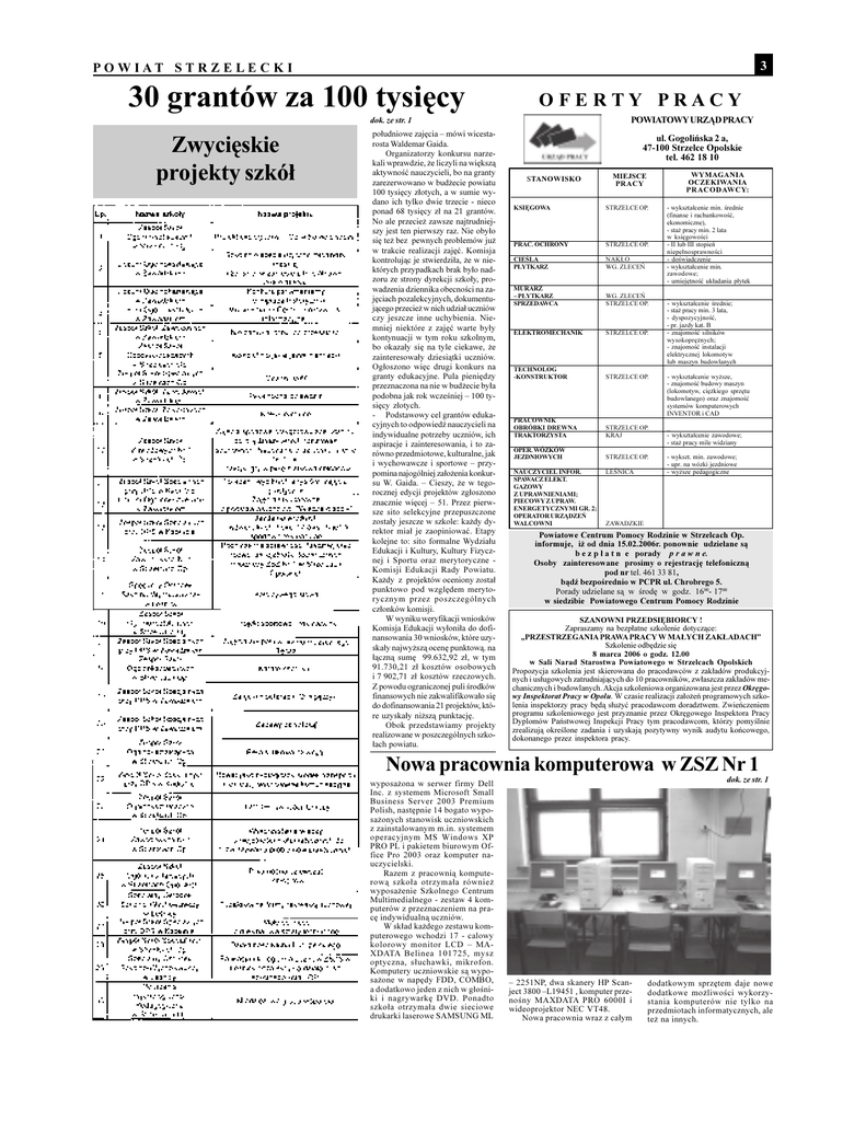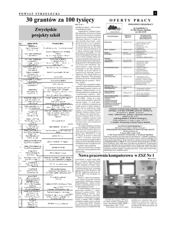 P O W I A T 3 S T R Z E L E C K I 30 grantów za 100 tysiêcy O F E R T Y Zwyciêskie projekty szkó³ P R A C Y POWIATOWY URZ¥D PRACY dok. ze str. 1 po³udniowe zajêcia  mówi wicesta- ul. Gogoliñska 2 a, rosta Waldemar Gaida. 47-100 Strzelce Opolskie Organizatorzy konkursu narze- tel. 462 18 10 kali wprawdzie, ¿e liczyli na wiêksz¹ aktywnoæ nauczycieli, bo na granty zarezerwowano w bud¿ecie powiatu WYMAGANIA MIEJSCE STANOWISKO OCZEKIWANIA PRACY P R A C O D AW C Y: 100 tysiêcy z³otych, a w sumie wydano ich tylko dwie trzecie - nieco ponad 68 tysiêcy z³ na 21 grantów. STRZELCE OP. KSIÊGOWA No ale przecie¿ zawsze najtrudniej- pewnych problemów ju¿ w trakcie realizacji zajêæ. Komisja kontroluj¹c je stwierdzi³a, ¿e w niektórych przypadkach brak by³o nad- PRAC. OCHRONY STRZELCE OP. CIELA NAK£O WG. ZLECEÑ P£YTKARZ jêciach pozalekcyjnych, dokumentuj¹cego przecie¿ w nich udzia³ uczniów mniej niektóre z zajêæ warte by³y zawodowe; - umiejêtnoæ uk³adania p³ytek MURARZ WG. ZLECEÑ  P£YTKARZ STRZELCE OP. SPRZEDAWCA STRZELCE OP. ELEKTROMECHANIK - znajomoæ silników wysokoprê¿nych; - znajomoæ instalacji TECHNOLOG STRZELCE OP. -KONSTRUKTOR - wykszta³cenie wy¿sze, - znajomoæ budowy maszyn (lokomotyw, ciê¿kiego sprzêtu podobna jak rok wczeniej  100 ty- budowlanego) oraz znajomoæ siêcy z³otych. systemów komputerowych Podstawowy cel grantów eduka- cyjnych to odpowied nauczycieli na indywidualne potrzeby uczniów, ich aspiracje i zainteresowania, i to zarówno przedmiotowe, kulturalne, jak i wychowawcze i sportowe  przypomina najogólniej za³o¿enia konkursu W. Gaida.  Cieszy, ¿e w tegorocznej edycji projektów zg³oszono znacznie wiêcej  51. Przez pierwsze sito selekcyjne przepuszczone zosta³y jeszcze w szkole: ka¿dy dyrektor mia³ je zaopiniowaæ. Etapy kolejne to: sito formalne Wydzia³u Edukacji i Kultury, Kultury Fizycznej i Sportu oraz merytoryczne Komisji Edukacji Rady Powiatu. Ka¿dy z projektów oceniony zosta³ punktowo pod wzglêdem merytorycznym - pr. jazdy kat. B lub maszyn budowlanych przeznaczona na nie w bud¿ecie by³a - - wykszta³cenie rednie; - sta¿ pracy min. 3 lata, elektrycznej lokomotyw zainteresowa³y dziesi¹tki uczniów. granty edukacyjne. Pula pieniêdzy _ - dyspozycyjnoæ, bo okaza³y siê na tyle ciekawe, ¿e Og³oszono wiêc drugi konkurs na - II lub III stopieñ niepe³nosprawnoci - wykszta³cenie min. czy jeszcze inne uchybienia. Nie- kontynuacji w tym roku szkolnym, w ksiêgowoci - dowiadczenie zoru ze strony dyrekcji szko³y, prowadzenia dziennika obecnoci na za- (finanse i rachunkowoæ, ekonomiczne), - sta¿ pracy min. 2 lata szy jest ten pierwszy raz. Nie oby³o siê te¿ bez - wykszta³cenie min. rednie przez poszczególnych INVENTOR i CAD PRACOWNIK STRZELCE OP. OBRÓBKI DREWNA _ KRAJ - wykszta³cenie zawodowe; JEZDNIOWYCH STRZELCE OP. - wykszt. min. zawodowe; NAUCZYCIEL INFOR. LENICA - wy¿sze pedagogiczne TRAKTORZYSTA OPER. WÓZKÓW - sta¿ pracy mile widziany - upr. na wózki jezdniowe SPAWACZ ELEKT. GAZOWY Z UPRAWNIENIAMI; PIECOWY Z UPRAW. ENERGETYCZNYMI GR. 2; OPERATOR URZ¥DZEÑ WALCOWNI ZAWADZKIE Powiatowe Centrum Pomocy Rodzinie w Strzelcach Op. informuje, i¿ od dnia 15.02.2006r. ponownie b e z p ³ a t n e Osoby zainteresowane porady udzielane s¹ p r a w n e. prosimy o rejestracjê telefoniczn¹ pod nr tel. 461 33 81, b¹d bezporednio w PCPR ul. Chrobrego 5. Porady udzielane s¹ w siedzibie w rodê w godz. 16 00 00 - 17 Powiatowego Centrum Pomocy Rodzinie cz³onków komisji. W wyniku weryfikacji wniosków SZANOWNI PRZEDSIÊBIORCY ! Komisja Edukacji wy³oni³a do dofi- Zapraszamy na bezp³atne szkolenie dotycz¹ce: nansowania 30 wniosków, które uzy- PRZESTRZEGANIA PRAWA PRACY W MA£YCH ZAK£ADACH ska³y najwy¿sz¹ ocenê punktow¹. na ³¹czn¹ sumê 99.632,92 z³, w tym 91.730,21 z³ kosztów osobowych i 7 902,71 z³ kosztów rzeczowych. Szkolenie odbêdzie siê 8 marca 2006 o godz. 12.00 w Sali Narad Starostwa Powiatowego w Strzelcach Opolskich Propozycja szkolenia jest skierowana do pracodawców z zak³adów produkcyjnych i us³ugowych zatrudniaj¹cych do 10 pracowników, zw³aszcza zak³adów me- Z powodu ograniczonej puli rodków chanicznych i budowlanych. Akcja szkoleniowa organizowana jest przez Okrêgo- finansowych nie zakwalifikowa³o siê wy Inspektorat Pracy w Opolu. W czasie realizacji za³o¿eñ programowych szko- do dofinansowania 21 projektów, któ- lenia inspektorzy pracy bêd¹ s³u¿yæ pracodawcom doradztwem. Zwieñczeniem re uzyska³y ni¿sz¹ punktacjê. Obok przedstawiamy projekty realizowane w poszczególnych szko³ach powiatu. programu szkoleniowego jest przyznanie przez Okrêgowego Inspektora Pracy Dyplomów Pañstwowej Inspekcji Pracy tym pracodawcom, którzy pomylnie zrealizuj¹ okrelone zadania i uzyskaj¹ pozytywny wynik audytu koñcowego, dokonanego przez inspektora pracy. Nowa pracownia komputerowa w ZSZ Nr 1 dok. ze str. 1 wyposa¿ona w serwer firmy Dell Inc. z systemem Microsoft Small Business Server 2003 Premium Polish, nastêpnie 14 bogato wyposa¿onych stanowisk uczniowskich z zainstalowanym m.in. systemem operacyjnym MS Windows XP PRO PL i pakietem biurowym Office Pro 2003 oraz komputer nauczycielski. Razem z pracowni¹ komputerow¹ szko³a otrzyma³a równie¿ wyposa¿enie Szkolnego Centrum Multimedialnego - zestaw 4 komputerów z przeznaczeniem na pracê indywidualn¹ uczniów. W sk³ad ka¿dego zestawu komputerowego wchodzi 17 - calowy kolorowy monitor X D ATA B e l i n e a LCD  101725, MAmysz optyczna, s³uchawki, mikrofon. Komputery uczniowskie s¹ wyposa¿one w napêdy FDD, COMBO, a dodatkowo jeden z nich w g³oniki i nagrywarkê DVD. Ponadto szko³ a ot rzyma³ a dwi e si eci owe drukarki laserowe SAMSUNG ML  2251NP, dwa skanery HP Scan- dodatkowym sprzêtem daje nowe ject 3800 L19451 , komputer prze- dodatkowe mo¿liwoci wykorzy- n o  n y MAXDATA PRO 6 0 0 0 I i stania komputerów nie tylko na wideoprojektor NEC VT48. Nowa pracownia wraz z ca³ym prze
