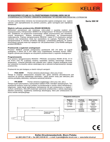 WYSOKOPRECYZYJNE (0,1%) PRZETWORNIKI POZIOMU SERII 36X W Z KOMPENSACJĄ CYFROWĄ / ZMIENNYNI ZAKRESAMI / WYJŚCIAMI ANALOGOWYMI I CYFROWYMI Ta seria przetworników ciśnienia ma konwencjonalne wyjścia analogowe oraz wyjście cyfrowe i jest zaprojektowana do pomiaru poziomu, gdzie wymagana jest największa dokładność. Seria 36X W Wyjście cyfrowe przetwornika (RS485 MODBUS) Elementem pomiarowym jest krzemowy mikro-układ o wysokiej czułości oraz nowoopracowany mikroprocesor XEMICS ze zintegrowanym 16 bitowym konwerterem A/D. Dodatkowo na powierzchni krzemowego układu przymocowany jest niezależny czujnik temperatury. Wpływy temperatury i nieliniowości są kompensowane matematycznie. Poprzez oprogramowanie READ30 i kabel K114 przeliczona wartość ciśnienia oraz temperatury może być wyświetlana na Laptopie, Palmtopie lub PC, oprogramowanie to również umożliwia rejestrację i prezentację graficzną. W system komunikacji cyfrowej może być wpiętych do 128 przetworników. Linia RS485 obsługuje protokół MODBUS. Przetwornik z wyjściem analogowym Procesor XEMICS posiada zintegrowany przetwornik A/D (16 bitów na sygnał analogowy 4..20mA lub 0..10V bądź inny) Częstotliwość konwersji wynosi 100Hz. Wyjście cyfrowe jest dostępne we wszystkich przetwornikach z wyjściem analogowym. Programowanie Przy pomocy oprogramowania READ30 i PROG30, konwertera RS485 (K102, K114 lub K107) oraz PC (Laptopa) możemy wyświetlać wartości mierzonego ciśnienia, temperatury, zmieniać jednostki oraz ustawiać zero i zakres. Wyjście analogowe może być ustawione na dowolny zakres zawierający się w zakresie kompensowanym danego przetwornika. Przetwornik ten jest dostępny w dwóch różnych wersjach: PAA-36XW Pomiar ciśnienia absolutnego ( Zero przy 0 bar) Wersja ta znajduje zastosowanie wszędzie tam, gdzie ciśnienie atmosferyczne jest mierzone za pomocą oddzielnego barometru i gdzie poziom wody jest obliczany jako różnica pomiędzy absolutną i otoczenia wartością ciśnienia. PR-36XW Pomiar ciśnienia względnego ( Zero przy ciśn. atm.) Wersja ta jest wykonywana z wytrzymałym kablem PUR z kanałem wentylacyjnym. Ten przetwornik poziomu może być podatny na kondensację w wyniku różnic temperatury i wilgotności. Jeżeli kanał wentylacyjny (odniesienia) nie jest umieszczony w ciepłym i suchym zamknięciu, KELLER proponuje wykonanie przetwornika z osłoną separującą element pomiarowy, wypełnioną substancją absorbującą, która jest umieszczona na końcu kanału wentylacyjnego. Połączenia elektryczne Wyjście 4...20mA 2 przew. 0...10V 3 przew. Programowanie Pozycja membrany pomiarowej Keller-Druckmesstechnik, Biuro Polska Funkcja OUT/GND +Vcc GND OUT +Vcc RS485A RS485B Kolor przew. Biały Czarny Biały Czerwony Czarny Niebieski Żółty tel. (061) 832-77-28 fax (061) 832-80-32 e-mail: [email protected] www.keller-druck.pl DANE TECHNICZNE Standardowe zakresy ciśnień (FS) w bar (inne na życzenie) PR-36XW (wzgl.) PAA-36XW (abs.) Przeciążenie 0,8..1,2 3 Wyjście Zasilanie (U) (1) (2) Pole błędu (0...50ºC) (1) (2) 1 0,8…2,3 3 RS485 8...28Vcc 0,1%FS 3 0,8…4 5 10 0,8…11 20 4..20mA 8...28Vcc 0,15%FS 30 0,8…31 60 0..10V 13...28Vcc 0,15%FS Liniowość + Histereza + Powtarzalność + Współczynniki temperaturowe + Zero + Tolerancja zakresu Inny zakres kompensacji na życzenie , lepsza dokładność na życzenie np. 0,05% Uwaga: Zakresy 0,1, 0,2 lub 0,5 są realizowane w przetwornikach 1bar. Dokładność dla tych zakresów wynosi ± 1 mbar ( 0...50ºC). Dla zakresów od 30mbar do 1000 mbar polecamy również sondy 46X. Wszystkie pośrednie zakresy dla wyjść analogowych dostępne bez dopłaty przez przeprogramowanie standardowych zakresów Opcja: Kalibracja bezpośrednio zakresów specjalnych - za dopłatą. Kompensacja wielomianowa. Do tego rodzaju kompensacji stosuje się model matematyczny do wyselekcjonowania precyzyjnej wartości pomiaru (P) z sygnału pomiarowego pochodzącego z czujnika ciśnienia (S) i temperatury (T). Mikroprocesor zawarty w przetworniku oblicza P za pomocą następującego wielomianu: 0 1 2 3 P(S,T) = A(T)·S + B(T)·S + C(T)·S + D(T)·S Z następującymi współczynnikami A(T)...D(T) zależnymi do temperatury: A(T) = A 0 ·T 0 + A 1 ·T 1 + A 2 ·T 2 + A 3 ·T 3 B(T) = B 0 ·T 0 + B 1 ·T 1 + B 2 ·T 2 + B 3 ·T 3 C(T) = C 0 ·T 0 + C 1 ·T 1 + C 2 ·T 2 + C 3 ·T 3 D(T) = D 0 ·T 0 + D 1 ·T 1 + D 2 ·T 2 + D 3 ·T 3 Współczynniki są dobierane za pomocą testów dla zmiennych wartości ciśnienia i temperatury. Odpowiednia wartość S, razem z dokładnymi wartościami ciśnienia i temperatury pozwala obliczyć współczynniki A0...D3. Te wartości są zapisywane w pamięci EEPROM mikroprocesora. Kiedy przetwornik ciśnienia pracuje, mikroprocesorowy pomiar sygnałów (S) i (T) pozwala na obliczanie współczynników zależnych od temperatury i wytwarzać dokładną wartość ciśnienia poprzez rozwiązanie równania P(S,T). Obliczenia i konwersje są wykonywane przynajmniej 400 razy na sekundę zależnie od rodzaju sygnałów. Teoretyczna rozdzielczość wynosi 0,01 do 0,005%. W praktyce, dokładność wynosi 0,05% ze względu na wyposażenie kalibrujące. Liniowość (Best Stright Line) Pomiar temperatury (RS485) Częstotliwość pomiaru Rozdzielczość Stabilność długoterminowa typ. 0,025% FS dokł. 0,5°C typ.(lepsza opcjonalnie) 100 Hz ≤ 0,002%FS Zakres ≤ 1 bar: 1mbar Zakres ≥ 1bar: 0,1%FS Rezystancja wejścia (Ω) Magazynowanie / Temperatura pracy Kabel Interfejs Izolacja Odporność na wibracje Odporność na obciążenia Ochrona Wytrzymałość ciśnieniowa Atest CE Materiał Waga Uwaga: (U-7V)/0,02A (2-przew.) > 5000 (3-przew.) -20...80ºC Polietylen (PE), wentylowane RS485 (MODBUS, 2 przew.) 100 MΩ/ 50V 20g, (5 do 2000 Hz amplituda ±3 mm) 20g sinus 11msec IP68 odporna na zamarzanie 10 milionów cykli zmian ciśn. 0...100%FS w 25ºC EN 61000-6-1 do 6-4, Stal nierdzewna 316L (1.4435) / Viton / PE 200g In