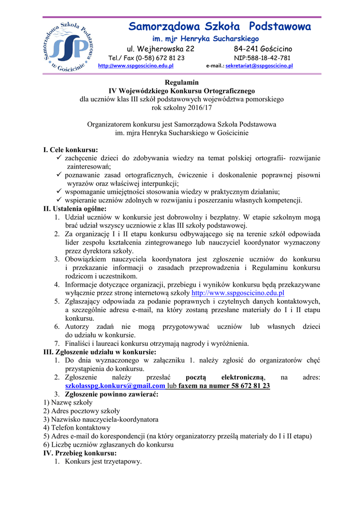 Samorządowa Szkoła Podstawowa im. mjr Henryka Sucharskiego ul. Wejherowska 22 84-241 GoŚcicino Tel./ Fax (0-58) 672 81 23 http://www.sspgoscicino.edu.pl NIP:588-18-42-781 e-mail.: [email protected] Regulamin IV Wojewódzkiego Konkursu Ortograficznego dla uczniów klas III szkół podstawowych województwa pomorskiego rok szkolny 2016/17 Organizatorem konkursu jest Samorządowa Szkoła Podstawowa im. mjra Henryka Sucharskiego w Gościcinie I. Cele konkursu: zachęcenie dzieci do zdobywania wiedzy na temat polskiej ortografii- rozwijanie zainteresowań; poznawanie zasad ortograficznych, ćwiczenie i doskonalenie poprawnej pisowni wyrazów oraz właściwej interpunkcji; wspomaganie umiejętności stosowania wiedzy w praktycznym działaniu; wspieranie uczniów zdolnych w rozwijaniu i poszerzaniu własnych kompetencji. II. Ustalenia ogólne: 1. Udział uczniów w konkursie jest dobrowolny i bezpłatny. W etapie szkolnym mogą brać udział wszyscy uczniowie z klas III szkoły podstawowej. 2. Za organizację I i II etapu konkursu odbywającego się na terenie szkół odpowiada lider zespołu kształcenia zintegrowanego lub nauczyciel koordynator wyznaczony przez dyrektora szkoły. 3. Obowiązkiem nauczyciela koordynatora jest zgłoszenie uczniów do konkursu i przekazanie informacji o zasadach przeprowadzenia i Regulaminu konkursu rodzicom i uczestnikom. 4. Informacje dotyczące organizacji, przebiegu i wyników konkursu będą przekazywane wyłącznie przez stronę internetową szkoły http://www.sspgoscicino.edu.pl 5. Zgłaszający odpowiada za podanie poprawnych i czytelnych danych kontaktowych, a szczególnie adresu e-mail, na który zostaną przesłane materiały do I i II etapu konkursu. 6. Autorzy zadań nie mogą przygotowywać uczniów lub własnych dzieci do udziału w konkursie. 7. Finaliści i laureaci konkursu otrzymają nagrody i wyróżnienia. III. Zgłoszenie udziału w konkursie: 1. Do dnia wyznaczonego w załączniku 1. należy zgłosić do organizatorów chęć przystąpienia do konkursu. 2. Zgłoszenie należy przesłać pocztą elektroniczną, na adres: [email protected] lub faxem na numer 58 672 81 23 3. Zgłoszenie powinno zawierać: 1) Nazwę szkoły 2) Adres pocztowy szkoły 3) Nazwisko nauczyciela-koordynatora 4) Telefon kontaktowy 5) Adres e-mail do korespondencji (na który organizatorzy prześlą materiały do I i II etapu) 6) Liczbę uczniów zgłaszanych do konkursu IV. Przebieg konkursu: 1. Konkurs jest trzyetapowy. 2. Terminarz konkursu umieszczony jest na stronie internetowej oraz w załączniku nr 1 do niniejszego Regulaminu. 3. Konkurs na wszystkich etapach ma formę pisemną i zawiera dyktando. Uczniowie powinni wykazać się zarówno znajomością podstawowych zasad ortograficznych jak i praktycznym ich stosowaniem. 4. Dyktando uczniowie powinni zapisywać piórem lub długopisem. 5. Podczas konkursu nie wolno używać korektorów, a wszelkie poprawki powinny być wykonywane w określony sposób: przekreślenie błędu jedną linią poziomą, estetyczne i wyraźne, poprawne napisanie całego wyrazu nad lub obok skreślenia, poprawki nieczytelne i niejednoznaczne uznane zostaną za błąd. 6. Etap pierwszy i drugi (eliminacje) uczniowie będą pisali na terenie swoich szkół. Składa się on z dyktanda. Za organizację pierwszego i drugiego etapu konkursu odpowiada nauczyciel zgłaszający uczniów (koordynator). 7. Dyktanda eliminacyjne muszą być przeprowadzone w wyznaczonym w terminarzu dniu, o godzinie tej samej dla wszystkich uczniów w szkole przystępujących do konkursu. 8. Testy eliminacyjne sprawdza komisja szkolna pod przewodnictwem nauczyciela koordynatora. 9. Zadaniem komisji jest wyłonienie uczniów, którzy w eliminacjach osiągnęli 95 lub więcej procent. Nazwiska tych uczniów wraz z wynikami należy wpisać do protokołu (wg załącznika nr 3) i przesłać do organizatorów. 10. Nauczyciel koordynator jest zobowiązany do uzyskania od Rodziców tych uczniów zgody na przetwarzanie danych osobowych na potrzeby Konkursu (wg wzoru w załączniku nr 2).Wypełnione druki przechowuje nauczyciel koordynator. Uwaga: Osiągnięcie wyniku powyżej 95% nie jest równoznaczne z zakwalifikowaniem się do kolejnego etapu. 11. Protokół komisji (wg załącznika nr 3), należy jak najszybciej, nie później niż w dniu podanym w terminarzu, przesłać do organizatorów faksem, na numer 586728123 12. Organizatorzy, po zapoznaniu się z wynikami z I i II etapu, wyłonią 15. uczniów, którzy wezmą udział w kolejnym etapie. 13. Lista uczniów zakwalifikowanych do III etapu opublikowana zostanie na stronie internetowej konkursu. 14. Dyktanda etapu I i II uczniów, którzy zakwalifikowani zostali do kolejnego etapu, należy dostarczyć organizatorom w dniu przeprowadzania etapu III. 15. Podczas etapu III uczniowie wykażą się umiejętnością pisania ze słuchu. 16. Trzeci etap odbędzie się w miejscu wyznaczonym przez Organizatorów. 17. Uczniowie powinni przynieść własne przybory do pisania i legitymację szkolną. 18. W III etapie konkursu weźmie udział 15. uczniów, którzy uzyskają najwyższą liczbę punktów w etapie I i II, a także ci uczestnicy, którzy zdobyli identyczną liczbę punktów, jaką uzyskał 15. uczestnik. 19. Tytuł laureata konkursu otrzymuje 8 uczniów, którzy uzyskali najwyższą liczbę punktów w etapie III, a także ci uczestnicy, którzy zdobyli identyczną liczbę punktów, jaką uzyskał ósmy finalista. 20. Prace konkursowe pod względem poprawności ortograficznej i interpunkcyjnej sprawdzi komisja składająca się z organizatorów konkursu oraz nauczycieli SSP w Gościcinie. 21. Dyktanda III etapu - finału konkursu, po napisaniu ich przez uczniów, pozostają do dyspozycji jury i organizatorów. 22. Decyzja jurorów dotycząca wyników konkursu jest ostateczna i nie podlega zmianie. 23. Organizatorzy zapewniają uczestnikom słodki poczęstunek. V. Zasady oceniania prac konkursowych 1. Komisje konkurs