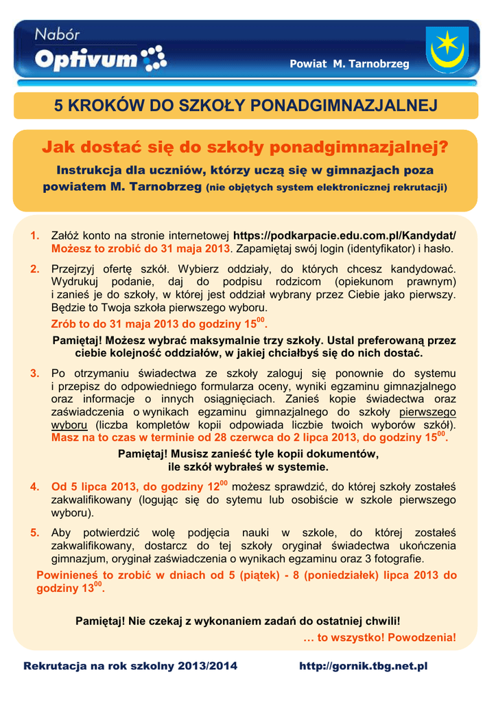 Powiat M. Tarnobrzeg 5 KROKÓW DO SZKOŁY PONADGIMNAZJALNEJ Jak dostać się do szkoły ponadgimnazjalnej? Instrukcja dla uczniów, którzy uczą się w gimnazjach poza powiatem M. Tarnobrzeg (nie objętych system elektronicznej rekrutacji) 1. Załóż konto na stronie internetowej https://podkarpacie.edu.com.pl/Kandydat/ Możesz to zrobić do 31 maja 2013. Zapamiętaj swój login (identyfikator) i hasło. 2. Przejrzyj ofertę szkół. Wybierz oddziały, do których chcesz kandydować. Wydrukuj podanie, daj do podpisu rodzicom (opiekunom prawnym) i zanieś je do szkoły, w której jest oddział wybrany przez Ciebie jako pierwszy. Będzie to Twoja szkoła pierwszego wyboru. Zrób to do 31 maja 2013 do godziny 1500. Pamiętaj! Możesz wybrać maksymalnie trzy szkoły. Ustal preferowaną przez ciebie kolejność oddziałów, w jakiej chciałbyś się do nich dostać. 3. Po otrzymaniu świadectwa ze szkoły zaloguj się ponownie do systemu i przepisz do odpowiedniego formularza oceny, wyniki egzaminu gimnazjalnego oraz informacje o innych osiągnięciach. Zanieś kopie świadectwa oraz zaświadczenia o wynikach egzaminu gimnazjalnego do szkoły pierwszego wyboru (liczba kompletów kopii odpowiada liczbie twoich wyborów szkół). Masz na to czas w terminie od 28 czerwca do 2 lipca 2013, do godziny 1500. Pamiętaj! Musisz zanieść tyle kopii dokumentów, ile szkół wybrałeś w systemie. 4. Od 5 lipca 2013, do godziny 1200 możesz sprawdzić, do której szkoły zostałeś zakwalifikowany (logując się do sytemu lub osobiście w szkole pierwszego wyboru). 5. Aby potwierdzić wolę podjęcia nauki w szkole, do której zostałeś zakwalifikowany, dostarcz do tej szkoły oryginał świadectwa ukończenia gimnazjum, oryginał zaświadczenia o wynikach egzaminu oraz 3 fotografie. Powinieneś to zrobić w dniach od 5 (piątek) - 8 (poniedziałek) lipca 2013 do godziny 1300. Pamiętaj! Nie czekaj z wykonaniem zadań do ostatniej chwili! … to wszystko! Powodzenia! Rekrutacja na rok szkolny 2013/2014 http://gornik.tbg.net.pl