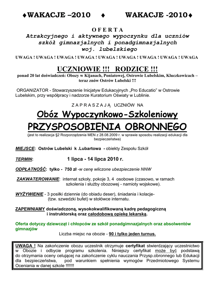 WAKACJE –2010 WAKACJE -2010 OFERTA Atrakcyjnego i aktywnego wypoczynku dla uczniów szkół gimnazjalnych i ponadgimnazjalnych woj. lubelskiego UWAGA ! UWAGA ! UWAGA ! UWAGA ! UWAGA ! UWAGA ! UWAGA ! UWAGA ! UWAGA UCZNIOWIE !!! RODZICE !!! ponad 20 lat doświadczeń: Obozy w Kijanach, Poniatowej, Ostrowie Lubelskim, Kluczkowicach – teraz znów Ostrów Lubelski !!! ORGANIZATOR - Stowarzyszenie Inicjatyw Edukacyjnych „Pro Educatio” w Ostrowie Lubelskim, przy współpracy i nadzorze Kuratorium Oświaty w Lublinie. Z A P R A S Z A J Ą UCZNIÓW NA Obóz Wypoczynkowo-Szkoleniowy PRZYSPOSOBIENIA OBRONNEGO (jest to realizacja §2 Rozporządzenia MEN z 28.08.2009 r. w sprawie sposobu realizacji edukacji dla bezpieczeństwa) MIEJSCE: Ostrów Lubelski k .Lubartowa - obiekty Zespołu Szkół TERMIN: 1 lipca - 14 lipca 2010 r. ODPŁATNOŚĆ: tylko - 750 zł -w cenę wliczone ubezpieczenie NNW ZAKWATEROWANIE: internat szkoły, pokoje 3, 4 osobowe (czasowo, w ramach szkolenia i służby obozowej - namioty wojskowe). WYŻYWIENIE - 3 posiłki dziennie (do obiadu deser), śniadania i kolacje(tzw. szwedzki bufet) w stołówce internatu. ZAPEWNIAMY doświadczoną, wysokokwalifikowaną kadrę pedagogiczną i instruktorską oraz całodobową opiekę lekarską. Oferta dotyczy dziewcząt i chłopców ze szkół ponadgimnazjalnych oraz absolwentów gimnazjów Liczba miejsc na obozie - 90 i tylko jeden turnus. UWAGA ! Na zakończenie obozu uczestnik otrzymuje certyfikat stwierdzający uczestnictwo w Obozie i odbycie programu szkolenia. Niniejszy certyfikat może być podstawą do otrzymania oceny celującej na zakończenie cyklu nauczania Przysp.obronnego lub Edukacji dla bezpieczeństwa, pod warunkiem spełnienia wymogów Przedmiotowego Systemu Oceniania w danej szkole !!!!!!! -2- Głównymi celami realizowanymi na obozie będą m.in: czynny wypoczynek, poprawienie ogólnej sprawności fizycznej, kształtowanie umiejętności organizatorskich i działania w zespole, nabycie umiejętności przydatnych w życiu codziennym, zdobycie wiadomości i umiejętności zgodnych z programem szkolenia wychowanie patriotyczno-obronne Organizacja i funkcjonowanie Obozu oparta jest na zasadach wojskowych . Uczestników podczas pobytu na obozie obowiązują stroje obozowe tj. koszulka T-short z logo obozu lub bluza i spodnie (zapewnia organizator). Na obozie będą prowadzone dla wszystkich uczestników następujące zajęcia: STRZELECTWO SPORTOWE (nabycie umiejętności strzeleckich – broń pneumatyczna krótka i długa oraz broń kulowa –kbks), SZKOLENIE OGÓLNOOBRONNE (terenoznawstwo-posługiwanie się kompasem, czytanie mapy; I pomoc przedlekarska; obrona cywilna; ochrona przeciwpożarowa.) Oddzielnie tworzy się sekcję szkoleniową - SURWIWAL (szkoła przetrwania w różnych warunkach; sztuka kamuflażu, rozpalanie ognia, budowa szałasu oraz marsze z ekwipunkiem w różnych warunkach pogodowych i terenowych, pokonywanie przeszkód terenowych, biwaki „pod gołym niebem”, itp.– poziom podstawowy i zaawansowany). Będą też realizowane elementy programu podstawowego, np.strzelectwo (Zajęcia programowe - 2 godz. dziennie przed południem) W Karcie Zgłoszenia należy wskazać wybór ogólnego programu szkolenia lub sekcji surwiwalu. Uczestnicy obozu będą mogli korzystać z........ sprzętu i obiektów sportowych – 2 sale gimnastyczne, boisko trawiaste, boisko do piłki plażowej, kort tenisowy, siłownia, sala tenisa stołowego, kąpieli w bezpiecznym jeziorze (własny ratownik), sprzętu wodnego – jacht, żaglówki, kajaki, rowery wodne, „banan” strzelnicy kulowej terenowej i strzelnicy pneumatycznej- (dla najlepszych strzelanie z kbkAK i innych...) dla chętnych – paintball(gry taktyczne w strojach i maskach ochronnych z pistoletami barwiącymi dla chętnych – broń ASG strzelanie z łuku pracowni informatycznej z dostępem do internetu, dyskoteki (często) - weź ulubioną płytę CD, MP3 mapa i trasa do biegów na orientację jazdy szkoleniowe i rekreacyjne na guadach INNYCH mocnych atrakcji – niespodzianek.....? W programie także: biwaki, wesołe „ogniska”, gry i zabawy, zawody sportowo-obronne, itp. -3Z uwagi na małą liczbę miejsc o zakwalifikowaniu na obóz będzie decydowała kolejność i data zgłoszeń. Z A P I S Y Zapisy na obóz przyjmują nauczyciele przysposobienia obronnego lub wychowawcy klas w poszczególnych szkołach. Zainteresowani uczniowie lub rodzice mogą zgłosić się także do przedstawiciela organizatora w Lublinie - Jerzy Surma ul. 3 Maja 6 (pok.308, III p.) telefon: (0-81) 53 85 238 lub tel.GSM 668 925 490 Zapisy przyjmowane są do dnia 25 czerwca 2010 r. lub do wyczerpania miejsc. Krok I – Wypełnić załączoną „Kartę Zgłoszenia na Obóz PO” ważny jest podpis rodziców, Krok II – Wpłacić na poczcie lub w banku kwotę 100 zł na konto obozu (nr konta podany poniżej) jako I ratę, Krok III – Przekazać (bezpośrednio lub drogą pocztową) poprzez nauczyciela swojej szkoły lub samemu osobiście do przedstawiciela organizatora – patrz wyżej * Kartę Zgłoszenia na Obóz PO * kserokopię dowodu wpłaty I raty Krok IV – Tą samą drogą zwrotną otrzymasz „Kartę Kwalifikacyjną Uczestnika Obozu” którą należy dokładnie wypełnić i przywieźć ze sobą na obóz. WPŁATY (tylko na niżej podane konto bankowe obozu) - I (pierwsza) rata - 100 zł (sto złotych) - kwotę tę należy wpłacić zaraz po otrzymaniu od organizatora- „Karty zgłoszenia na Obóz PO” - II (druga) rata - 650 zł (pięćset sześćdziesiąt złotych ) - kwotę tę należy wpłacić po otrzymaniu „Karty Kwalifikacyjnej Uczestnika Wypoczynku” lecz nie później niż do dnia 1 lipca 2010 r. W indywidualnych uzasadnionych przypadkach istnieje możliwość rozłożenia płatności na większą liczbę rat lub inne terminy ich płatności. UWAGA! W wyżej wymienionej kwocie - 50 zł stanowi tzw. kwota gwarancyjna tzn. nie podlega ona zwrotowi w przypad