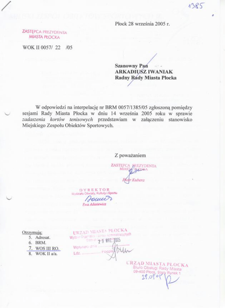 MZOS/4124/583/2005 Płock, dnia 23.09.2005 r. Szanowny Pan Roland Bury Kierownik Oddziału Kultury, Sportu, Turystyki i Rekreacji Urzędu Miasta Płocka Dotyczy : interpelacji BRM.0057/1385/05 W odpowiedzi na interpelację Pana Arkadiusza Iwaniaka złożoną w dniu 7 września 2005 roku uprzejmie wyjaśniamy: MZOS miał w planach inwestycyjnych zadaszenie trzech kortów tenisowych, jednakże z braku środków finansowych w budżecie zadaniowym przyznanym w latach poprzednich, inwestycja nie została zrealizowana . MZOS planuje budowę stałej hali dla przykrycia 2 kortów aktualnie zadaszonych balonem nadciśnieniowym na okres zimy. Inwestycja ta stanie się konieczna po fizycznym zużyciu powłoki balonu. Konstrukcja hali umożliwi zdjęcie ścian bocznych w okresie letnim, natomiast w okresie zimowym jej eksploatacja byłaby tańsza (mniejsze straty ciepła) – wstępna analiza kosztów eksploatacji w załączeniu. Koszt takiej hali wynosi ok. 350 tysięcy zł netto. MZOS nie planuje przykrycia pozostałych 3 kortów na okres letni, natomiast doświetlenie umożliwi korzystanie do godziny 2100 w całym okresie sezonu letniego przy sprzyjającej aurze. Natomiast wykorzystanie tego samego zadaszenia dla kortów i lodowiska jest nielogiczne, ponieważ i korty i lodowisko potrzebują zadaszenia właśnie w zimie. Poza tym wymiary zadaszenia lodowiska są niewystarczające do przykrycia trzech kortów ziemnych. Z poważaniem Dyrektor Miejskiego Zarządu Obiektów Sportowych Krzysztof M. Ganc Załącznik 1/ Analiza kosztów eksploatacji kortów tenisowych w sezonie zimowym. Analiza kosztów eksploatacji kortów tenisowych w sezonie zimowym Koszty oleju opałowego I.2003 15 857 II.2003 14 566 III.2003 12 370 IV. 2003 5 192 X.2003 XI.2003 XII.2003 Razem 2003 bez X I.2004 II.2004 III.2004 IV.2004 sezon 2003/2004-X 2 567 7 715 7 300 63 000 21 732 7 304 5 323 2 890 52 264 Średnio opał: energia elektr. Razem: 57 632 18 000 75 632 na sezon ( 6 mies. bez paźdz.) Koszty ogrzewania hali INTERHALL olej opałowy Energia elektr. razem 12 605 miesięcznie 180 dni 26 000 litrów 32 220 kWh 2 zł/litr 0,5 zł/kWh 52 000 16 110 68 110 zł /6 mies. 11 352 miesięcznie Różnica kosztów sezonu: Koszt hali: Okres zwrotu: 7 522 zł 350 000 zł 46,53 lat