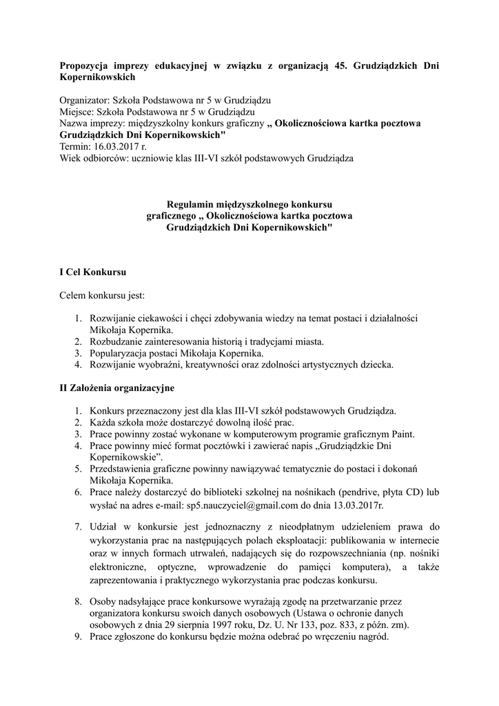 Propozycja imprezy edukacyjnej w związku z organizacją 45. Grudziądzkich Dni Kopernikowskich Organizator: Szkoła Podstawowa nr 5 w Grudziądzu Miejsce: Szkoła Podstawowa nr 5 w Grudziądzu Nazwa imprezy: międzyszkolny konkurs graficzny ,, Okolicznościowa kartka pocztowa Grudziądzkich Dni Kopernikowskich" Termin: 16.03.2017 r. Wiek odbiorców: uczniowie klas III-VI szkół podstawowych Grudziądza Regulamin międzyszkolnego konkursu graficznego ,, Okolicznościowa kartka pocztowa Grudziądzkich Dni Kopernikowskich" I Cel Konkursu Celem konkursu jest: 1. Rozwijanie ciekawości i chęci zdobywania wiedzy na temat postaci i działalności Mikołaja Kopernika. 2. Rozbudzanie zainteresowania historią i tradycjami miasta. 3. Popularyzacja postaci Mikołaja Kopernika. 4. Rozwijanie wyobraźni, kreatywności oraz zdolności artystycznych dziecka. II Założenia organizacyjne 1. 2. 3. 4. Konkurs przeznaczony jest dla klas III-VI szkół podstawowych Grudziądza. Każda szkoła może dostarczyć dowolną ilość prac. Prace powinny zostać wykonane w komputerowym programie graficznym Paint. Prace powinny mieć format pocztówki i zawierać napis „Grudziądzkie Dni Kopernikowskie”. 5. Przedstawienia graficzne powinny nawiązywać tematycznie do postaci i dokonań Mikołaja Kopernika. 6. Prace należy dostarczyć do biblioteki szkolnej na nośnikach (pendrive, płyta CD) lub wysłać na adres e-mail: [email protected] do dnia 13.03.2017r. 7. Udział w konkursie jest jednoznaczny z nieodpłatnym udzieleniem prawa do wykorzystania prac na następujących polach eksploatacji: publikowania w internecie oraz w innych formach utrwaleń, nadających się do rozpowszechniania (np. nośniki elektroniczne, optyczne, wprowadzenie do pamięci komputera), a także zaprezentowania i praktycznego wykorzystania prac podczas konkursu. 8. Osoby nadsyłające prace konkursowe wyrażają zgodę na przetwarzanie przez organizatora konkursu swoich danych osobowych (Ustawa o ochronie danych osobowych z dnia 29 sierpnia 1997 roku, Dz. U. Nr 133, poz. 833, z późn. zm). 9. Prace zgłoszone do konkursu będzie można odebrać po wręczeniu nagród. III Ocena prac konkursowych 1. Prace będą oceniane przez komisję konkursową, w skład której wejdą nauczyciele, reprezentujący organizatora – Szkołę Podstawową nr 5 w Grudziądzu. 2. Decyzje komisji są ostateczne. 3. Kryteria oceny prac: pomysłowość i oryginalność w przedstawieniu tematu estetyka pracy wkład pracy (samodzielność wykonania) 5. Komisja konkursowa przydziela w każdym kryterium punkty, w zakresie od 1 (minimum) do 5 (maksimum). 6. Zwycięzcy otrzymują nagrody rzeczowe.