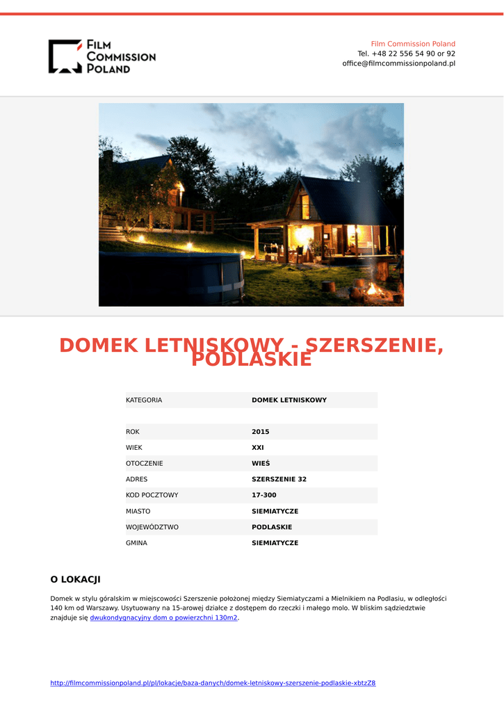 Film Commission Poland Tel. +48 22 556 54 90 or 92 office@filmcommissionpoland.pl DOMEK LETNISKOWY - SZERSZENIE, PODLASKIE KATEGORIA DOMEK LETNISKOWY ROK 2015 WIEK XXI OTOCZENIE WIEŚ ADRES SZERSZENIE 32 KOD POCZTOWY 17-300 MIASTO SIEMIATYCZE WOJEWÓDZTWO PODLASKIE GMINA SIEMIATYCZE O LOKACJI Domek w stylu góralskim w miejscowości Szerszenie położonej między Siemiatyczami a Mielnikiem na Podlasiu, w odległości 140 km od Warszawy. Usytuowany na 15-arowej działce z dostępem do rzeczki i małego molo. W bliskim sądziedztwie znajduje się dwukondygnacyjny dom o powierzchni 130m2. http://filmcommissionpoland.pl/pl/lokacje/baza-danych/domek-letniskowy-szerszenie-podlaskie-xbtzZ8