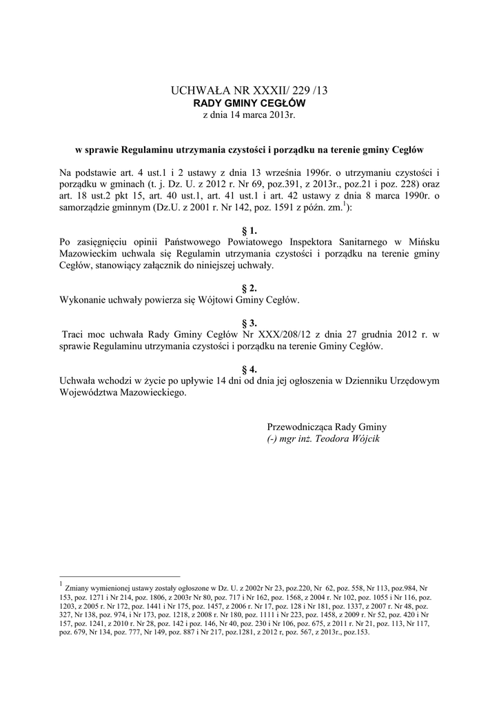UCHWAŁA NR XXXII/ 229 /13 RADY GMINY CEGŁÓW z dnia 14 marca 2013r. w sprawie Regulaminu utrzymania czystości i porządku na terenie gminy Cegłów Na podstawie art. 4 ust.1 i 2 ustawy z dnia 13 września 1996r. o utrzymaniu czystości i porządku w gminach (t. j. Dz. U. z 2012 r. Nr 69, poz.391, z 2013r., poz.21 i poz. 228) oraz art. 18 ust.2 pkt 15, art. 40 ust.1, art. 41 ust.1 i art. 42 ustawy z dnia 8 marca 1990r. o samorządzie gminnym (Dz.U. z 2001 r. Nr 142, poz. 1591 z późn. zm.1): § 1. Po zasięgnięciu opinii Państwowego Powiatowego Inspektora Sanitarnego w Mińsku Mazowieckim uchwala się Regulamin utrzymania czystości i porządku na terenie gminy Cegłów, stanowiący załącznik do niniejszej uchwały. § 2. Wykonanie uchwały powierza się Wójtowi Gminy Cegłów. § 3. Traci moc uchwała Rady Gminy Cegłów Nr XXX/208/12 z dnia 27 grudnia 2012 r. w sprawie Regulaminu utrzymania czystości i porządku na terenie Gminy Cegłów. § 4. Uchwała wchodzi w życie po upływie 14 dni od dnia jej ogłoszenia w Dzienniku Urzędowym Województwa Mazowieckiego. Przewodnicząca Rady Gminy (-) mgr inż. Teodora Wójcik 1 Zmiany wymienionej ustawy zostały ogłoszone w Dz. U. z 2002r Nr 23, poz.220, Nr 62, poz. 558, Nr 113, poz.984, Nr 153, poz. 1271 i Nr 214, poz. 1806, z 2003r Nr 80, poz. 717 i Nr 162, poz. 1568, z 2004 r. Nr 102, poz. 1055 i Nr 116, poz. 1203, z 2005 r. Nr 172, poz. 1441 i Nr 175, poz. 1457, z 2006 r. Nr 17, poz. 128 i Nr 181, poz. 1337, z 2007 r. Nr 48, poz. 327, Nr 138, poz. 974, i Nr 173, poz. 1218, z 2008 r. Nr 180, poz. 1111 i Nr 223, poz. 1458, z 2009 r. Nr 52, poz. 420 i Nr 157, poz. 1241, z 2010 r. Nr 28, poz. 142 i poz. 146, Nr 40, poz. 230 i Nr 106, poz. 675, z 2011 r. Nr 21, poz. 113, Nr 117, poz. 679, Nr 134, poz. 777, Nr 149, poz. 887 i Nr 217, poz.1281, z 2012 r, poz. 567, z 2013r., poz.153. Załącznik do Uchwały Nr XXXII/ 229 /13 Rady Gminy w Cegłowie z dnia 14 marca 2013 Regulamin utrzymania czystości i porządku na terenie gminy Cegłów 2 Rozdział 1 Postanowienia ogólne §1 Regulamin utrzymania czystości i porządku na terenie Gminy Cegłów, zwany dalej „Regulaminem”, określa szczegółowe zasady utrzymania czystości i porządku na terenie Gminy Cegłów. §2 Zgodnie z art. 4 ust. 2 ustawy z dnia 13 września 1996r. o utrzymaniu czystości i porządku w gminach (Dz. U. z 2012 r. poz. 391) niniejszy regulamin określa: 1) wymagania w zakresie utrzymania czystości i porządku na terenie nieruchomości obejmujących: a) prowadzenie we wskazanym zakresie selektywnego zbierania i odbierania odpadów komunalnych, w tym powstających w gospodarstwach domowych przeterminowanych leków i chemikaliów, zużytych baterii i akumulatorów, zużytego sprzętu elektrycznego i elektronicznego, mebli innych odpadów wielkogabarytowych, odpadów budowlanych i rozbiórkowych oraz zużytych opon, a także odpadów zielonych, b) uprzątanie błota, śniegu, lodu i innych zanieczyszczeń z części nieruchomości służących do użytku publicznego, c) mycie i naprawy pojazdów samochodowych poza myjniami i warsztatami naprawczymi; 2) rodzaj i minimalną pojemność pojemników przeznaczonych do zbierania odpadów komunalnych na terenie nieruchomości oraz na drogach publicznych, warunki rozmieszczania tych pojemników i ich utrzymania w odpowiednim stanie sanitarnym, porządkowym i technicznym, przy uwzględnieniu: a) średniej ilości odpadów komunalnych wytwarzanych w gospodarstwach domowych bądź w innych źródłach, b) liczby osób korzystających z pojemników; 3) częstotliwości i sposobu pozbywania się odpadów komunalnych i nieczystości ciekłych z terenu nieruchomości oraz z terenów przeznaczonych do użytku publicznego; 4) inne wymagania wynikające z wojewódzkiego planu gospodarki odpadami; 5) obowiązki osób utrzymujących zwierzęta domowe, mających na celu ochronę przed zagrożeniem lub uciążliwością dla ludzi oraz przed zanieczyszczeniem terenów przeznaczonych do wspólnego użytku; 6) wymagania utrzymywania zwierząt gospodarskich na terenach wyłączonych z produkcji rolniczej, w tym także zakazu ich utrzymywania na określonych obszarach lub w poszczególnych nieruchomościach; 7) wyznaczanie obszarów podlegających obowiązkowej deratyzacji i terminów jej przeprowadzania. Rozdział 2 Wymagania w zakresie utrzymania czystości i porządku na terenie nieruchomości §3 1. Ustala się następujące zasady w zakresie prowadzenia selektywnego zbierania i odbierania odpadów komunalnych: 1) Właściciel nieruchomości ma obowiązek wyposażyć nieruchomość w pojemniki lub inne urządzenia do prowadzenia selektywnej zbiórki odpadów komunalnych. 2) Selektywne zbieranie odpadów komunalnych obejmuje następujące frakcje odpadów: a) papier, tektura (makulatura, karton); b) szkło; c) metale; d) tworzywa sztuczne; e) odpady ulegające biodegradacji, w tym odpady zielone; f) opakowania wielomateriałowe; g) przeterminowane leki i chemikalia; h) zużyte baterie i akumulatory; 3 i) zużyty sprzęt elektryczny i elektroniczny; j) meble i inne odpady wielkogabarytowe; k) odpady budowlane i rozbiórkowe (nie dotyczy odpadów zawierających azbest); l) zużyte opony. 2. W przypadku zadeklarowania przez właściciela nieruchomości segregowania odpadów komunalnych, pozostałe odpady zmieszane niedające się wyselekcjonować gromadzone w pojemniku przez właściciela nieruchomości nie powinny zawierać rodzajów odpadów wymienionych w § 3 ust. 1 pkt. 2). §4 1. Właściciele nieruchomości zobowiązani są do niezwłocznego uprzątnięcia śniegu, błota, lodu, liści oraz innych zanieczyszczeń z części nieruchomości służących do użytku publicznego, w tym z chodników położonych wzdłuż nieruchomości przy jej granicy. 2. Uprzątnięte błoto, śnieg, lód oraz inne zanieczyszczenia mogą być gromadzone w miejscach niepowodujących zakłóceń w ruchu pieszym i pojazdów, a w przypadku braku możliwości t
