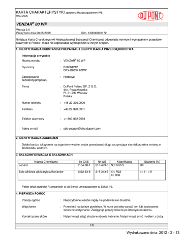 KARTA CHARAKTERYSTYKI zgodnie z Rozporządzeniem WE 1907/2006 VENZAR® 80 WP Wersja 2.0 Przejrzano dnia 20.05.2009 Odn. 130000000172 Niniejsza Karta Charakterystyki Niebezpiecznej Substancji Chemicznej odpowiada normom i wymaganiom przepisów prawnych w Polsce i może nie odpowiadać wymaganiom w innych krajach. 1. IDENTYFIKACJA SUBSTANCJI/PREPARATU I IDENTYFIKACJA PRZEDSIĘBIORSTWA Informacja o wyrobie ® Nazwa wyrobu : VENZAR 80 WP Synonimy : : B10064212 DPX-B0634 80WP Zastosowanie substancji/preparatu : Herbicyd Firma : DuPont Poland SP. Z O.O. 44c, Powazkowska PL 01-797 Warsaw Polska Numer telefonu : +48-22-320.0900 Telefaks : +48-22-320.0901 Telefon alarmowy : +1-860-892-7693 Adres e-mail : [email protected] 2. IDENTYFIKACJA ZAGROŻEŃ Działa bardzo toksycznie na organizmy wodne; może powodować długo utrzymujące się niekorzystne zmiany w środowisku wodnym. 3. SKŁAD/INFORMACJA O SKŁADNIKACH Lenacil Nr CAS 2164-08-1 Nr WE Klasyfikacja 218-499-0 N; R50/53 Sole alkilowe alkiloarylosulfonianów 1322-93-6 215-343-3 Xn; R22 Xi; R36 Nazwa Chemiczna Stężenie [%] 80 >= 1 - < 5 Pełen tekst zwrotów R zawartych w tej Sekcji umieszczonow w Sekcji 16. 4. PIERWSZA POMOC Porady ogólne : Nieprzytomnej osobie nigdy nie podawać nic doustnie. Wdychanie : Przenieść na świeże powietrze. W razie potrzeby podać tlen lub zastosować sztuczne oddychanie. Zasięgnąć porady lekarza po istotnym narażeniu. Kontakt przez skórę : Natychmiast zdjąć skażone obuwie i ubranie. Natychmiast zmyć mydłem z dużą 1/8 Wydrukowano dnia: 2012 - 2 - 13 KARTA CHARAKTERYSTYKI zgodnie z Rozporządzeniem WE 1907/2006 VENZAR® 80 WP Wersja 2.0 Przejrzano dnia 20.05.2009 Odn. 130000000172 ilością wody. W przypadku podrażnienia skóry lub reakcji alergicznych udać się do lekarza. Uprać skażone ubranie przed ponownym użyciem. Kontakt z oczami : Trzymać oczy otwarte i przemywać wolno i delikatnie wodą przez 15 - 20 minut. Jeśli podrażnienie oczu utrzymuje się, skonsultować się ze specjalistą. Połknięcie : Uzyskać pomoc lekarską. Nie wywoływać wymiotów bez konsultacji z lekarzem. Jeśli ofiara jest przytomna: Wypłukać usta wodą. Wypić 1 lub 2 szklanki wody. 5. POSTĘPOWANIE W PRZYPADKU POŻARU Stosownych środków gaśniczych : Stosować zraszanie wodą, piany alkoholoodporne, suche chemikalia lub dwutlenek węgla., Srodków gaśniczych, które nie są używane ze względów bezpieczeństwa : Silny strumień wody, Specyficzne zagrożenia w czasie zwalczania pożaru : W przypadku pożaru tworzą się niebezpieczne produkty rozkładu. Dwutlenek węgla (CO2) tlenki azotu Specjalnego sprzętu ochronnego dla strażaków : Założyć sprzęt do oddychania z obiegiem zamkniętym i odzież ochronną. Dalsze informacje : Zapobiegać przedostawaniu się wody pogaśniczej do wód powierzchniowych lub gruntowych. Zebrać oddzielnie zanieczyszczoną wodę gaśniczą. Nie można jej usuwać do kanalizacji. Pozostałości po pożarze i zanieczyszcona woda gaśnicza muszą być usunięte zgodnie z lokalnymi przepisami. (mały pożar) Jeżeli obszar jest wystawiony na działanie ognia należy doprowadzić, jeśli warunki na to pozwalają, do samowypalenia się pożaru, gdyż woda może zwiększyć ryzyko skażenia terenu. Chłodzić pojemniki/zbiorniki rozproszonym strumieniem wody. 6. POSTĘPOWANIE W PRZYPADKU NIEZAMIERZONEGO UWOLNIENIA DO ŚRODOWISKA Indywidualnych środków ostrożności : Unikać wdychania pyłu. Użyć środków ochrony osobistej. Sprawdź środki ochronne w sekcjach 7 i 8. Środków ostrożności w odniesieniu do środowiska : Zapobiegać dalszemu wyciekowi lub rozlaniu jeżeli to bezpieczne. Używać odpowiednich pojemników zapobiegających skażeniu środowiska. Nie wylewać do wód powierzchniowych i kanalizacji. Nie dopuścić aby materiał skaził wody gruntowe. Należy powiadomić władze lokalne w przypadku niemożności ograniczenia poważnego wyzwolenia. W przypadku skażenia produktem rzek, jezior lub ścieków powiadomić odpowiednie władze. Metody oczyszczania : Metody oczyszczania - małe wylania Zebrać próżniowo rozsypany materiał i zebrać w odpowiednim pojemniku do usunięcia. Metody oczyszczania - duże wylania Ograniczyć miejsce uwolnienia, zebrać zabezpieczonym elektrycznie odkurzaczem lub zamieść na mokro i przenieść do pojemnka celem usunięcia zgodnie z lokalnymi/krajowymi przepisami (patrz w sekcji 13). 2/8 Wydrukowano dnia: 2012 - 2 - 13 KARTA CHARAKTERYSTYKI zgodnie z Rozporządzeniem WE 1907/2006 VENZAR® 80 WP Wersja 2.0 Przejrzano dnia 20.05.2009 Porady dodatkowe Odn. 130000000172 : Zebranych wycieków nigdy nie przechowywać w oryginalnych pojemnikach do ponownego użycia. Usunąć zgodnie z przepisami lokalnymi. 7. POSTĘPOWANIE Z SUBSTANCJĄ/PREPARATEM I JEJ/JEGO MAGAZYNOWANIE Postępowanie z substancją/preparatem Wskazówki dotyczące bezpiecznego posługiwania się : Używaj tylko czystych narzędzi. Zapewnić odpowiedni wyciąg wentylacyjny w miejscu tworzenia się pyłu. Nie wdychać pyłu lub rozpylonej mgły. Stosować środki ochrony osobistej. Środki ochrony osobistej: patrz w sekcji 8. Wytyczne ochrony przeciwpożarowej : Podczas procesu pyły mogą tworzyć z powietrzem mieszaninę wybuchową. Przechowywać z dala od ciepła i źródeł zapłonu. Wymagania względem pomiesczeń i pojemników magazynowych : Przechowywać w oryginalnym opakowaniu. Przechowywać pojemniki szczelnie zamknięte w suchym, chłodnym i dobrze wentylowanym miejscu. Przechowywać w miejscu dostępnym tylko dla upoważnionych osób. Chronić przed dziećmi. Nie przechowywać razem z żywnością, napojami i paszami dla zwierząt. Wytyczne składowania : Brak specjalnych ograniczeń dla przechowywania z innymi produktami. Nie przechowywać razem z: Zasady Inne informacje : Trwały podczas przechowywania w zalecanych warunkach. Magazynowanie 8. KONTROLA NARAŻENIA I ŚRODKI OCHRONY INDYWIDUALNEJ Elementy urządzeń kontrolnych w miejscu pracy Skład