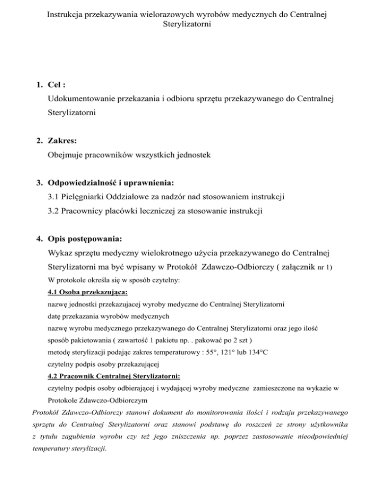 Instrukcja przekazywania wielorazowych wyrobów medycznych do Centralnej Sterylizatorni 1. Cel : Udokumentowanie przekazania i odbioru sprzętu przekazywanego do Centralnej Sterylizatorni 2. Zakres: Obejmuje pracowników wszystkich jednostek 3. Odpowiedzialność i uprawnienia: 3.1 Pielęgniarki Oddziałowe za nadzór nad stosowaniem instrukcji 3.2 Pracownicy placówki leczniczej za stosowanie instrukcji 4. Opis postępowania: Wykaz sprzętu medyczny wielokrotnego użycia przekazywanego do Centralnej Sterylizatorni ma być wpisany w Protokół Zdawczo-Odbiorczy ( załącznik nr 1) W protokole określa się w sposób czytelny: 4.1 Osoba przekazująca: nazwę jednostki przekazujacej wyroby medyczne do Centralnej Sterylizatorni datę przekazania wyrobów medycznych nazwę wyrobu medycznego przekazywanego do Centralnej Sterylizatorni oraz jego ilość sposób pakietowania ( zawartość 1 pakietu np. . pakować po 2 szt ) metodę sterylizacji podając zakres temperaturowy : 55°, 121° lub 134°C czytelny podpis osoby przekazującej 4.2 Pracownik Centralnej Sterylizatorni: czytelny podpis osoby odbierającej i wydającej wyroby medyczne zamieszczone na wykazie w Protokole Zdawczo-Odbiorczym Protokół Zdawczo-Odbiorczy stanowi dokument do monitorowania ilości i rodzaju przekazywanego sprzętu do Centralnej Sterylizatorni oraz stanowi podstawę do roszczeń ze strony użytkownika z tytułu zagubienia wyrobu czy też jego zniszczenia np. poprzez zastosowanie nieodpowiedniej temperatury sterylizacji. 5. Załączniki: 5.1 Załącznik nr 1 - Protokół Zdawczo-Odbiorczy sporządził …............................. sprawdził ….................................... zatwierdził …............................. Załacznik nr 1. Protokół zdawczo-odbiorczy Nazwa jednostki Lp Nazwa i skład pakietu Data: Ilość Temp pakietów sterylizacji Lp 1 10 2 11 3 12 4 13 5 14 6 15 7 16 8 17 9 18 Podpis osoby przekazującej Nazwa i skład pakietu Ilość Temp pakietów sterylizacji Podpis osoby odbierającej ; wydającej …............................................................. ........................ …............................... …..............................................................