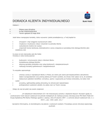 DORADCA KLIENTA INDYWIDUALNEGO Oddział 1 • • • Miejsce pracy:Września Nr Ref.:POD/070/05/2016 Termin zgłoszeń:25 maja 2016 JeŜeli łatwo nawiązujesz kontakty, lubisz wyzwania i jesteś przedsiębiorczy, a Twój kapitał to: • • • • entuzjazm i chęć osiągania wyznaczonych celów inicjatywa w budowaniu relacji i otwartość na potrzeby klienta wykształcenie średnie lub wyŜsze znajomość branŜy bankowej, doświadczenie w pracy związanej ze sprzedaŜą i/lub obsługą klientów jako dodatkowy atut to praca na tym stanowisku jest dla Ciebie Inwestuj w swój rozwój poprzez: • • • • budowanie i utrzymywanie relacji z klientami Banku kompleksową obsługę klientów aktywną sprzedaŜ produktów oraz usług bankowych i ubezpieczeniowych realizację transakcji gotówkowych i bezgotówkowych To wszystko zaprocentuje: • • • • • umową o pracę w największym Banku w Polsce, bo wiemy jak waŜne jest bezpieczeństwo zatrudnienia stałym wynagrodzeniem oraz premią zaleŜną od Twoich wyników, bo chcesz mieć wpływ na to, ile zarabiasz elastycznym pakietem benefitów: od kultury, sportu i wypoczynku po fundusz emerytalny, bo lubisz mieć wybór prywatną, ogólnopolską opieką zdrowotną, bo zdrowie jest najwaŜniejsze profesjonalnym systemem szkoleń, bo zaleŜy nam na Twoim rozwoju Dołącz do nas lub poleć nas swoim znajomym • „W nadsyłanych dokumentach (CV i list motywacyjny) prosimy o dopisanie klauzuli: WyraŜam zgodę na przetwarzanie moich danych osobowych do potrzeb niezbędnych do realizacji procesu rekrutacji przez PKO Bank Polski SA i Grupę Kapitałową PKO Banku Polskiego zgodnie z ustawą z dnia 29 sierpnia 1997 r. o ochronie danych osobowych (Dz. U. z 2014 r., poz. 1182 z późn. zm.).” Uprzejmie informujemy, Ŝe skontaktujemy się jedynie z wybranymi osobami. Prowadzący proces rekrutacji zapewniają poufność.