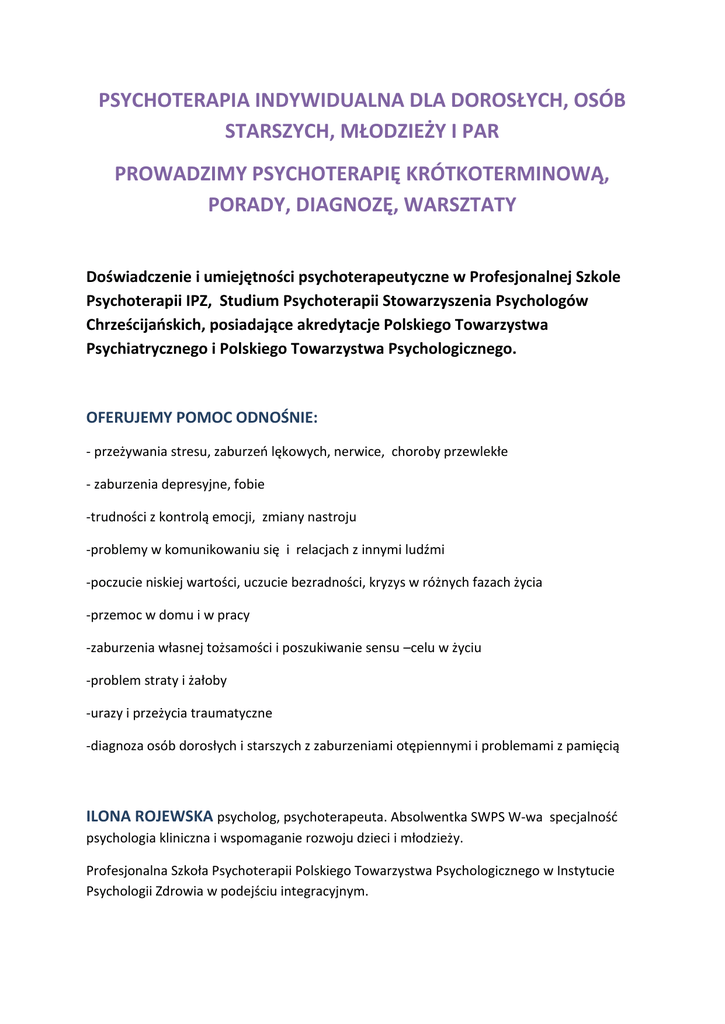 PSYCHOTERAPIA INDYWIDUALNA DLA DOROSŁYCH, OSÓB STARSZYCH, MŁODZIEŻY I PAR PROWADZIMY PSYCHOTERAPIĘ KRÓTKOTERMINOWĄ, PORADY, DIAGNOZĘ, WARSZTATY Doświadczenie i umiejętności psychoterapeutyczne w Profesjonalnej Szkole Psychoterapii IPZ, Studium Psychoterapii Stowarzyszenia Psychologów Chrześcijańskich, posiadające akredytacje Polskiego Towarzystwa Psychiatrycznego i Polskiego Towarzystwa Psychologicznego. OFERUJEMY POMOC ODNOŚNIE: - przeżywania stresu, zaburzeń lękowych, nerwice, choroby przewlekłe - zaburzenia depresyjne, fobie -trudności z kontrolą emocji, zmiany nastroju -problemy w komunikowaniu się i relacjach z innymi ludźmi -poczucie niskiej wartości, uczucie bezradności, kryzys w różnych fazach życia -przemoc w domu i w pracy -zaburzenia własnej tożsamości i poszukiwanie sensu –celu w życiu -problem straty i żałoby -urazy i przeżycia traumatyczne -diagnoza osób dorosłych i starszych z zaburzeniami otępiennymi i problemami z pamięcią ILONA ROJEWSKA psycholog, psychoterapeuta. Absolwentka SWPS W-wa specjalność psychologia kliniczna i wspomaganie rozwoju dzieci i młodzieży. Profesjonalna Szkoła Psychoterapii Polskiego Towarzystwa Psychologicznego w Instytucie Psychologii Zdrowia w podejściu integracyjnym. Doświadczenia i praktyka zawodowa zdobywana min. W Klinice Chorób Psychicznych i Zaburzeń Nerwicowych Akademii Medycznej w Gdańsku na oddziale chorób psychicznych i nerwic oraz na oddziale kardiochirurgii. W ośrodkach zajmujących się pomocą osobom z problemami otępiennymi, zaburzeniami pamięci (po udarach, zawałach, wypadkach). Ponadto realizuje się w pracy w wyższej uczelni PWSNS w Gdyni jako nauczyciel akademicki oraz indywidualna praktyka psychoterapeutyczna. ALEKSANDRA MATYSIAK pedagog, psychoterapeuta integratywny w ujęciu chrześcijańskim. Członek Stowarzyszenia Psychologów Chrześcijańskich. Pracuję jako psychoterapeuta w Osrodku Pomocy Psychologicznej SPCh w Gdyni. Mam doświadczenie pracy z młodzieżą, dziećmi i dorosłymi zdobywane w trakcie pełnienia funkcji pedagoga szkolnego w III Liceum Ogólnokształcącym w Gdyni oraz Gimnazjum nr 24. Jestem realizatorem „ Szkoły dla Rodziców”, zajmuję się też problemem syllogomanii- nadmiernego zbieractwa i jego skutków. http://psychoterapiagd.ucoz.pl/
