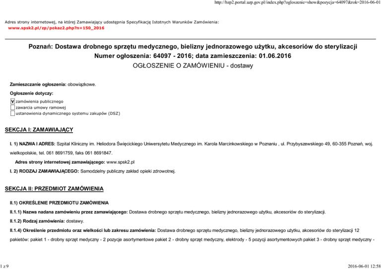 http://bzp2.portal.uzp.gov.pl/index.php?ogloszenie=show&pozycja=64097&rok=2016-06-01 Adres strony internetowej, na której Zamawiający udostępnia Specyfikację Istotnych Warunków Zamówienia: www.spsk2.pl/zp/pokaz2.php?n=150_2016 Poznań: Dostawa drobnego sprzętu medycznego, bielizny jednorazowego użytku, akcesoriów do sterylizacji Numer ogłoszenia: 64097 - 2016; data zamieszczenia: 01.06.2016 OGŁOSZENIE O ZAMÓWIENIU - dostawy Zamieszczanie ogłoszenia: obowiązkowe. Ogłoszenie dotyczy: V zamówienia publicznego zawarcia umowy ramowej ustanowienia dynamicznego systemu zakupów (DSZ) SEKCJA I: ZAMAWIAJĄCY I. 1) NAZWA I ADRES: Szpital Kliniczny im. Heliodora Święcickiego Uniwersytetu Medycznego im. Karola Marcinkowskiego w Poznaniu , ul. Przybyszewskiego 49, 60-355 Poznań, woj. wielkopolskie, tel. 061 8691759, faks 061 8691847. Adres strony internetowej zamawiającego: www.spsk2.pl I. 2) RODZAJ ZAMAWIAJĄCEGO: Samodzielny publiczny zakład opieki zdrowotnej. SEKCJA II: PRZEDMIOT ZAMÓWIENIA 1z9 II.1) OKREŚLENIE PRZEDMIOTU ZAMÓWIENIA II.1.1) Nazwa nadana zamówieniu przez zamawiającego: Dostawa drobnego sprzętu medycznego, bielizny jednorazowego użytku, akcesoriów do sterylizacji. II.1.2) Rodzaj zamówienia: dostawy. II.1.4) Określenie przedmiotu oraz wielkości lub zakresu zamówienia: Dostawa drobnego sprzętu medycznego, bielizny jednorazowego użytku, akcesoriów do sterylizacji 12 pakietów: pakiet 1 - drobny sprzęt medyczny - 2 pozycje asortymentowe pakiet 2 - drobny sprzęt medyczny, elektrody - 5 pozycji asortymentowych pakiet 3 - drobny sprzęt medyczny - 2016-06-01 12:58 http://bzp2.portal.uzp.gov.pl/index.php?ogloszenie=show&pozycja=64097&rok=2016-06-01 naczynia z masy papierowej do utylizacji w maceratorze - 5 pozycji asortymentowych pakiet 4 - drobny sprzęt medyczny - naczynia z masy papierowej do utylizacji w maceratorze pakiet 5 - bielizna jednorazowego użytku - fartuchy jednorazowego użytku - 3 pozycje asortymentowe pakiet 6 - drobny sprzęt medyczny - elektrody neutralne - 2 pozycje asortymentowe pakiet 7 - bielizna jednorazowego użytku - ubrania operacyjne jednorazowe pakiet 8 - bielizna - chusty trójkątne pakiet 9 - bielizna jednorazowego użytku - zestawy operacyjne - 2 pozycje asortymentowe pakiet 10 - akcesoria do sterylizacji plazmowej pakiet 11 - drobny sprzęt medyczny pakiet 12 - materiały eksploatacyjne do sterylizatora plazmowego Sterrad 100S - 2 pozycje asortymentowe. II.1.5) przewiduje się udzielenie zamówień uzupełniających Określenie przedmiotu oraz wielkości lub zakresu zamówień uzupełniających II.1.6) Wspólny Słownik Zamówień (CPV): 33.14.11.23-8, 33.12.32.10-0, 33.77.20.00-0, 33.19.00.00-8, 33.14.10.00-0, 39.51.82.00-0, 33.12.32.10-0, 30.10.00.00-0. II.1.7) Czy dopuszcza się złożenie oferty częściowej: tak, liczba części: 12. II.1.8) Czy dopuszcza się złożenie oferty wariantowej: nie. II.2) CZAS TRWANIA ZAMÓWIENIA LUB TERMIN WYKONANIA: Okres w miesiącach: 12. SEKCJA III: INFORMACJE O CHARAKTERZE PRAWNYM, EKONOMICZNYM, FINANSOWYM I TECHNICZNYM 2z9 III.1) WADIUM Informacja na temat wadium: nie dotyczy III.2) ZALICZKI III.3) WARUNKI UDZIAŁU W POSTĘPOWANIU ORAZ OPIS SPOSOBU DOKONYWANIA OCENY SPEŁNIANIA TYCH WARUNKÓW III. 3.1) Uprawnienia do wykonywania określonej działalności lub czynności, jeżeli przepisy prawa nakładają obowiązek ich posiadania Opis sposobu dokonywania oceny spełniania tego warunku nie dotyczy III.3.2) Wiedza i doświadczenie Opis sposobu dokonywania oceny spełniania tego warunku nie dotyczy 2016-06-01 12:58 3z9 http://bzp2.portal.uzp.gov.pl/index.php?ogloszenie=show&pozycja=64097&rok=2016-06-01 III.3.3) Potencjał techniczny Opis sposobu dokonywania oceny spełniania tego warunku nie dotyczy III.3.4) Osoby zdolne do wykonania zamówienia Opis sposobu dokonywania oceny spełniania tego warunku nie dotyczy III.3.5) Sytuacja ekonomiczna i finansowa Opis sposobu dokonywania oceny spełniania tego warunku nie dotyczy III.4) INFORMACJA O OŚWIADCZENIACH LUB DOKUMENTACH, JAKIE MAJĄ DOSTARCZYĆ WYKONAWCY W CELU POTWIERDZENIA SPEŁNIANIA WARUNKÓW UDZIAŁU W POSTĘPOWANIU ORAZ NIEPODLEGANIA WYKLUCZENIU NA PODSTAWIE ART. 24 UST. 1 USTAWY III.4.1) W zakresie wykazania spełniania przez wykonawcę warunków, o których mowa w art. 22 ust. 1 ustawy, oprócz oświadczenia o spełnianiu warunków udziału w postępowaniu należy przedłożyć: III.4.2) W zakresie potwierdzenia niepodlegania wykluczeniu na podstawie art. 24 ust. 1 ustawy, należy przedłożyć: oświadczenie o braku podstaw do wykluczenia; aktualny odpis z właściwego rejestru lub z centralnej ewidencji i informacji o działalności gospodarczej, jeżeli odrębne przepisy wymagają wpisu do rejestru lub ewidencji, w celu wykazania braku podstaw do wykluczenia w oparciu o art. 24 ust. 1 pkt 2 ustawy, wystawiony nie wcześniej niż 6 miesięcy przed upływem terminu składania wniosków o dopuszczenie do udziału w postępowaniu o udzielenie zamówienia albo składania ofert; III.4.3) Dokumenty podmiotów zagranicznych Jeżeli wykonawca ma siedzibę lub miejsce zamieszkania poza terytorium Rzeczypospolitej Polskiej, przedkłada: III.4.3.1) dokument wystawiony w kraju, w którym ma siedzibę lub miejsce zamieszkania potwierdzający, że: nie otwarto jego likwidacji ani nie ogłoszono upadłości - wystawiony nie wcześniej niż 6 miesięcy przed upływem terminu składania wniosków o dopuszczenie do udziału w postępowaniu o udzielenie zamówienia albo składania ofert; 2016-06-01 12:58 http://bzp2.portal.uzp.gov.pl/index.php?ogloszenie=show&pozycja=64097&rok=2016-06-01 III.4.4) Dokumenty dotyczące przynależności do tej samej grupy kapitałowej lista podmiotów należących do tej samej grupy kapitałowej w rozumieniu ustawy z dnia 16 lutego 2007 r. o ochronie konkurencji i konsumentów albo informacji o tym, że nie należy do grupy kapitałowej; III.5) INFORMACJA O DOKUMENTACH POTWIERDZAJĄCYCH, ŻE OFEROWANE DOSTA