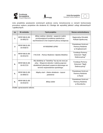 Lista projektów pozytywnie ocenionych podczas oceny merytorycznej w ramach konkursowej procedury wyboru projektów dla działania 8.1 Dostęp do wysokiej jakości usług zdrowotnych i społecznych. Lp Nr wniosku Tytuł projektu Nazwa wnioskodawcy 1 RPOP.08.01.0016-005/15 Bliżej rodziny i dziecka - wsparcie rodzin przeżywających problemy opiekuńczo wychowawcze oraz wsparcie pieczy zastępczej Regionalny Ośrodek Polityki Społecznej 2 RPOP.08.01.0016-018/15 W RODZINIE LEPIEJ Powiatowe Centrum Pomocy Rodzinie w Krapkowicach 3 RPOP.08.01.0016-015/15 P.R.O.M. - Pomoc Rodzinie i Opieka Mobilna Fundacja Pomocy Dzieciom "Bądź Dobroczyńcą" 4. RPOP.08.01.0016-017/15 My działamy w "świetlicy" by się nie snuć po ulicy - Wsparcie dziecka i rodziny poprzez działalność placówek wsparcia dziennego na terenie województwa opolskiego. Fundacja Pomocy Dzieciom "Bądź Dobroczyńcą" 5. RPOP.08.01.0016-009/15 Mądry start - Dobre działania - Lepsze pokolenie Powiatowe Centrum Pomocy Rodzinie w Nysie 6. RPOP.08.01.0016-014/15 Bliżej siebie Powiatowe Centrum Pomocy Rodzinie w Kluczborku Źródło: opracowanie własne.