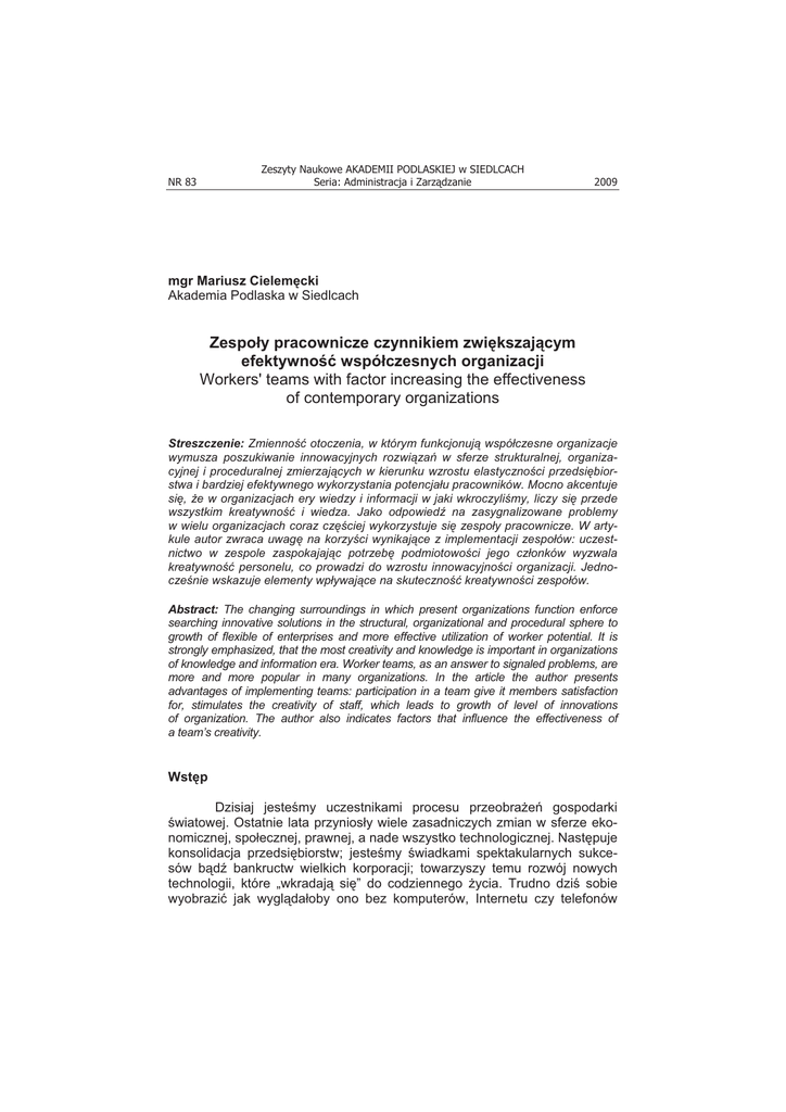 Zeszyty Naukowe AKADEMII PODLASKIEJ w SIEDLCACH Seria: Administracja i Zarz dzanie NR 83 2009 mgr Mariusz Cielem cki Akademia Podlaska w Siedlcach Zespo!y pracownicze czynnikiem zwi kszaj"cym efektywno#$ wspó!czesnych organizacji Workers' teams with factor increasing the effectiveness of contemporary organizations Streszczenie: Zmienno ! otoczenia, w którym funkcjonuj" wspó#czesne organizacje wymusza poszukiwanie innowacyjnych rozwi"za$ w sferze strukturalnej, organizacyjnej i proceduralnej zmierzaj"cych w kierunku wzrostu elastyczno ci przedsi%biorstwa i bardziej efektywnego wykorzystania potencja#u pracowników. Mocno akcentuje si%, &e w organizacjach ery wiedzy i informacji w jaki wkroczyli my, liczy si% przede wszystkim kreatywno ! i wiedza. Jako odpowied' na zasygnalizowane problemy w wielu organizacjach coraz cz% ciej wykorzystuje si% zespo#y pracownicze. W artykule autor zwraca uwag% na korzy ci wynikaj"ce z implementacji zespo#ów: uczestnictwo w zespole zaspokajaj"c potrzeb% podmiotowo ci jego cz#onków wyzwala kreatywno ! personelu, co prowadzi do wzrostu innowacyjno ci organizacji. Jednocze nie wskazuje elementy wp#ywaj"ce na skuteczno ! kreatywno ci zespo#ów. Abstract: The changing surroundings in which present organizations function enforce searching innovative solutions in the structural, organizational and procedural sphere to growth of flexible of enterprises and more effective utilization of worker potential. It is strongly emphasized, that the most creativity and knowledge is important in organizations of knowledge and information era. Worker teams, as an answer to signaled problems, are more and more popular in many organizations. In the article the author presents advantages of implementing teams: participation in a team give it members satisfaction for, stimulates the creativity of staff, which leads to growth of level of innovations of organization. The author also indicates factors that influence the effectiveness of a team’s creativity. Wst p Dzisiaj jeste my uczestnikami procesu przeobra!e" gospodarki wiatowej. Ostatnie lata przynios#y wiele zasadniczych zmian w sferze ekonomicznej, spo#ecznej, prawnej, a nade wszystko technologicznej. Nast$puje konsolidacja przedsi$biorstw; jeste my wiadkami spektakularnych sukcesów b%d& bankructw wielkich korporacji; towarzyszy temu rozwój nowych technologii, które „wkradaj% si$” do codziennego !ycia. Trudno dzi sobie wyobrazi' jak wygl%da#oby ono bez komputerów, Internetu czy telefonów 200 M. Cielem!cki komórkowych. Wp#yw tych wynalazków na wspó#czesne spo#ecze"stwa jest widoczny „go#ym okiem”. Post$p naukowo-techniczny oddzia#uje równie! na funkcjonuj%ce dzisiaj przedsi$biorstwa – organizmy !ywe (to przecie! ludzie stanowi% o ich sile). Aby przetrwa' na rynku, dostosowa' si$ do maj%cych miejsce przeobra!e" w otoczeniu, wzgl$dnie aktywnie te zmiany stymulowa', firmy aktywnie poszukuj% nowych mo!liwo ci badawczych, idei, koncepcji zarz%dzania. Zmienno ' otoczenia, a przede wszystkim nastawienie na coraz bardziej wymagaj%cego klienta, wymusza na organizacjach poszukiwanie innowacyjnych rozwi%za" w sferze strukturalnej, organizacyjnej i proceduralnej zmierzaj%cych w kierunku wzrostu elastyczno ci przedsi$biorstwa dla zniwelowania dysonansu pomi$dzy nim a turbulentnym otoczeniem. W tej sytuacji, aby sprosta' coraz wy!szym wymaganiom, podmioty funkcjonuj%ce na rynku powinny cechowa' szybko ' i inteligencja. Przemiany zachodz%ce wokó# organizacji gospodarczych nasuwaj% pytanie: czy sposób ich organizacji i funkcjonowania sprzyja osi%ganiu zamierzonych celów a jednocze nie zaspokajane s% potrzeby zatrudnionych w nich pracowników? Prowadzone od kilkudziesi$ciu lat badania na temat talentów najbardziej wybijaj%cych si$ pracowników pokazuj%, i! w ostatnim czasie kluczowego znaczenia nabra#y dwie cechy, które wcze niej by#y marginalizowane: umiej$tno ' tworzenia zespo#u i przystosowanie si$ do zmian. Wyra!ane s% powszechnie opinie, !e zakorzeniony w organizacjach, zw#aszcza w Polsce, system hierarchicznych zale!no ci na linii prze#o!onypodw#adny, tworzy barier$ uniemo!liwiaj%c% pe#ne wykorzystanie potencja#u spo#ecznego. Ten sposób ujmowania relacji mi$dzyludzkich, pozostaj%c w sprzeczno ci z zasad% podmiotowo ci pracowników i uniemo!liwiaj%c ich partycypacj$ w zachodz%cych wewn%trz procesach, pozbawia organizacj$ stymulowania innowacyjno ci „od wewn%trz” b$d%cej nast$pstwem rozwijanej przez personel kreatywno ci. Nie jest to cudowne remedium na wszystkie napotykane problemy, ale dzi$ki ich implementacji osi%gana jest wi$ksza efektywno ' dzia#a", mierzona m.in. ilo ci% generowanych do realizacji pomys#ów, co jak dowodz% badania jest podstaw% do rozwoju innowacyjno ci w przedsi$biorstwie. Jak powie M.A. West zespo#y maj% wi$ksz% szans$ na dopracowanie i urealnienie pomys#ów oraz uzyskanie przez nie wsparcia i akceptacji spo#ecznej1. Z drugiej strony, w kontek cie sygna#ów o zg#aszanych aspiracjach pracowników w zakresie partycypacji, daj%cej poczucie realnego indywidualnego wp#ywu na organizacyjn% rzeczywisto ', dzi$ki zastosowaniu zespo#ów mo!liwe staje si$ zsynchronizowanie celów organizacji z celami jednostki. Zatem ten dualny charakter korzy ci z zastosowania zespo#ów pracowniczych zach$ca do przyjrzenia si$ im bli!ej, zw#aszcza !e w praktyce to rozwi%zanie strukturalne nie znalaz#o w oczach zarz%dzaj%cych jak do tej pory nale!ytego zainteresowania. 1 M.A. West, Creative Value and Creative Visio In Teams At Work [w:] Creative Action in Organizations (red.) C.M. Ford, D.A. Gioia, SAGE Publications, Oaks-London-New Delphi 1995, s. 71-77. Seria: Administracja i Zarz dzanie (10)2009 ZN nr 83 Zespo"y pracownicze czynnikiem zwi!kszaj cym efektywno#$… 201 Celem niniejszego artyku#u jest przedstawienie korzy ci z implementacji w organizacji zespo#ów pracowniczych. Gwarantuj% one bowiem, z jednej strony mo!liwo ' szybkiej reakcji na bod&ce z zewn%trz, z drugiej za s% dobrym sposobem na zaspokojen