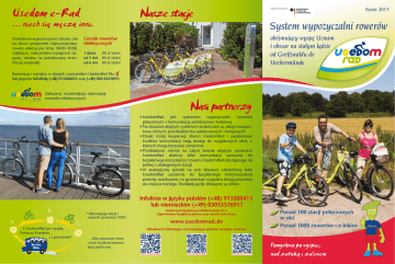 Usedom e-Rad Pomysłowa wyprawa przez Uznam. Lekko, łatwo i przyjemnie. Najwyższej klasy rowery elektryczne firmy SWISS FLYER, najlżejsze, maksymalna wydajność napędu, idealne na pofałdowany teren. Poczuj swobodę! Nasze stacje Dofinansowane przez: System wypozyczalni rowerów obejmujacy wyspe Uznam i obszar na stałym ladzie od Greifswaldu do Ueckermünde Cennik rowerów elektrycznych 1 dzień: od 3 dni: od 6 dni: 90 zł / dzień 85 zł / dzień 80 zł / dzień Rezerwacja i wynajmy w stacjach z personelem UsedomRad Plus + lub poprzez infolinię (+48) 913500413 oraz (+49) 030 55576911. Zalecamy wcześniejszą rezerwację rowerów elektrycznych. Nasi partnerzy • UsedomRad jest systemem wypożyczalni rowerów połączonym z komunikacją autobusową i kolejową • Na obszarze objętym systemem świadczone są usługi transportowe różnych przedsiębiorstw autobusowych i kolejowych • Dzięki ścisłej kooperacji klienci UsedomRad i pasażerowie środków komunikacji mają dostęp do wyjątkowych ofert, z których mogą korzystać zamiennie • Przykładowo niemal na całym terenie objętym systemem UsedomRad dzienny bilet komunikacji uprawnia do bezpłatnego korzystania z roweru UsedomRad (dostępnego na jednej z obsługowych stacji) • W analogiczny sposób na tym obszarze całodzienny bilet UsedomRad uprawnia do bezpłatnego kontynuowania podróży autobusem, co gwarantuje wygodną drogę powrotną do miejsca noclegu. Rozkłady jazdy dostępne są online. Infolinia w języku polskim (+48) 913500413 lub niemieckim (+49) 03055576911 B A Z UsedomRad po wyspie, Pomorzu Przednim... i z powrotem! und zurück * Obowiązują taryfy i warunki przewozu VMO. C Jesteśmy do dyspozycji codziennie przez 24 h. Zapewniamy bezpłatną pomoc oraz serwis techniczny. www.usedomrad.de Aktualności i informacje o innowacyjnym systemie wynajmu rowerów: … albo pozostaw rower i wróć środkami komunikacji publicznej www.usedomrad.de UsedomRad-App Sezon 2013 UsedomRad-Film Ponad 100 stacji połaczonych w sieć Ponad 1000 rowerów i e-bików Pomyslowo po wyspie, nad zatoka i zalewem