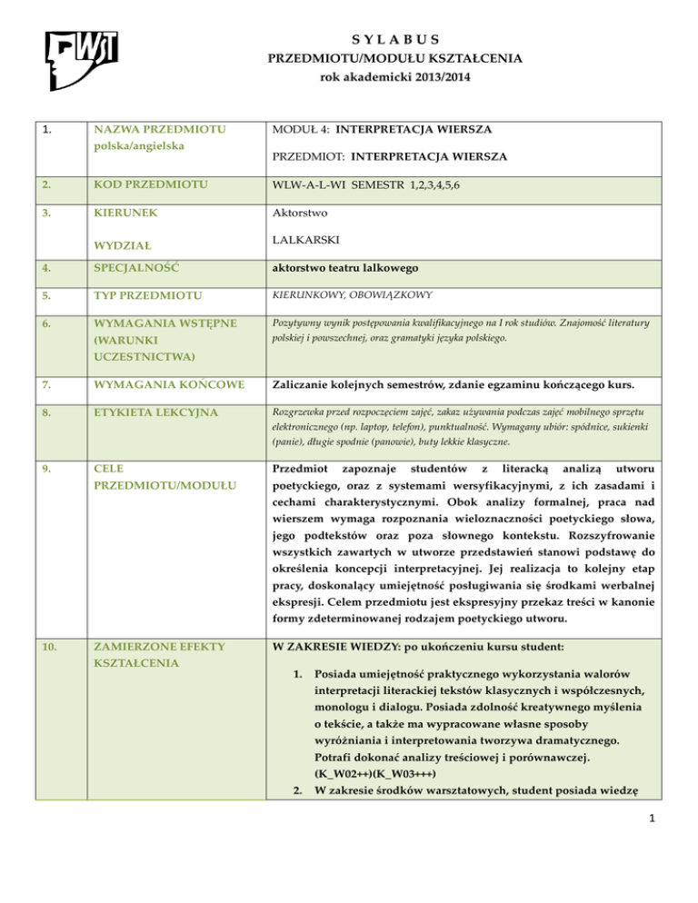 SYLABUS PRZEDMIOTU/MODUŁU KSZTAŁCENIA rok akademicki 2013/2014 1. NAZWA PRZEDMIOTU polska/angielska MODUŁ 4: INTERPRETACJA WIERSZA PRZEDMIOT: INTERPRETACJA WIERSZA 2. KOD PRZEDMIOTU WLW-A-L-WI SEMESTR 1,2,3,4,5,6 3. KIERUNEK Aktorstwo WYDZIAŁ LALKARSKI 4. SPECJALNOŚĆ aktorstwo teatru lalkowego 5. TYP PRZEDMIOTU KIERUNKOWY, OBOWIĄZKOWY 6. WYMAGANIA WSTĘPNE Pozytywny wynik postępowania kwalifikacyjnego na I rok studiów. Znajomość literatury (WARUNKI polskiej i powszechnej, oraz gramatyki języka polskiego. UCZESTNICTWA) 7. WYMAGANIA KOŃCOWE Zaliczanie kolejnych semestrów, zdanie egzaminu kończącego kurs. 8. ETYKIETA LEKCYJNA Rozgrzewka przed rozpoczęciem zajęć, zakaz używania podczas zajęć mobilnego sprzętu elektronicznego (np. laptop, telefon), punktualność. Wymagany ubiór: spódnice, sukienki (panie), długie spodnie (panowie), buty lekkie klasyczne. 9. CELE Przedmiot zapoznaje studentów z literacką analizą utworu PRZEDMIOTU/MODUŁU poetyckiego, oraz z systemami wersyfikacyjnymi, z ich zasadami i cechami charakterystycznymi. Obok analizy formalnej, praca nad wierszem wymaga rozpoznania wieloznaczności poetyckiego słowa, jego podtekstów oraz poza słownego kontekstu. Rozszyfrowanie wszystkich zawartych w utworze przedstawień stanowi podstawę do określenia koncepcji interpretacyjnej. Jej realizacja to kolejny etap pracy, doskonalący umiejętność posługiwania się środkami werbalnej ekspresji. Celem przedmiotu jest ekspresyjny przekaz treści w kanonie formy zdeterminowanej rodzajem poetyckiego utworu. 10. ZAMIERZONE EFEKTY KSZTAŁCENIA W ZAKRESIE WIEDZY: po ukończeniu kursu student: 1. Posiada umiejętność praktycznego wykorzystania walorów interpretacji literackiej tekstów klasycznych i współczesnych, monologu i dialogu. Posiada zdolność kreatywnego myślenia o tekście, a także ma wypracowane własne sposoby wyróżniania i interpretowania tworzywa dramatycznego. Potrafi dokonać analizy treściowej i porównawczej. (K_W02++)(K_W03+++) 2. W zakresie środków warsztatowych, student posiada wiedzę 1 z zakresu środków warsztatowych w stopniu niezbędnym do realizacji własnych projektów artystycznych. (K_W04+++) W ZAKRESIE UMIEJĘTNOŚCI: Student posiada: 1. Umiejętność świadomego posługiwania się aparatem mowy w każdej przestrzeni przeznaczonej do realizacji dzieła artystycznego, świadomego posługiwania się oddechem w budowie frazy, wrażliwość na rozszerzenie przestrzeni dźwiękowej dla wzbogacenia intonacji, elastyczności w posługiwaniu się środkami ekspresji, barwy, tempa, rytmu i dynamiki (harmonijne łączenie mowy z innymi środkami ekspresji aktorskiej). (K_U06+++) 2. Posiada umiejętność mówienia wierszem, opartą na znajomości wszystkich elementów formalnych konstruujących wiersz (wiersz sylabiczny, numeryczny, sylabotonika: tonika wiersza, wiersz wolny, nieregularny, wiersz współczesny); emocjonalne elementy interpretacji powinny być oparte na znajomości i wykorzystaniu cech konstrukcji słownego zapisu; dyscyplina techniczna wiersza (frazy, średniówki, przerzutnie). (K_U08+++) 3. Student opanował techniki ćwiczenia umiejętności warsztatowych, umożliwiające mu ciągły rozwój poprzez samodzielną pracę w realizowaniu i wyrażaniu własnych koncepcji artystycznych. (K_U13++) W ZAKRESIE KOMPETENCJI SPOŁECZNYCH: 1. Po zakończeniu kursu student ma świadomość że jest w pełni kompetentnym i samodzielnym artystą, zdolnym do świadomego integrowania zdobytej wiedzy w obrębie specjalizacji, oraz w ramach innych szeroko pojętych działań kulturotwórczych. (K_K01++) 2. Posiada umiejętność krytycznej oceny własnych działań twórczych i artystycznych. (K_K04++) 3. Posiada wiedzę i umiejętności umożliwiające ciągły rozwój poprzez samodzielną pracę. (K_K10+++) 11. FORMY KSZTAŁCENIA 1. Wykład w formie prelekcji o charakterze autorskim. 2. Ćwiczenia (warsztatowe) – zajęcia grupowe i indywidualne oparte na ćwiczeniu umiejętności świadomego posługiwania się narzędziami warsztatu aktorskiego. 3. Konsultacje. 12. PUNKTY ECTS (nakład pracy rok I studenta niezbędny do osiągnięcia 2 II III zamierzonych efektów kształcenia) semestr Ilość 1 2 3 4 5 6 2 2 2 2 2 2 punktów 13. METODY I KRYTERIA Zal notą Zal Zal Zal Zal Zal Zal OCENY /zal EG z EG z EG z EG notą 14. 15. SPOSÓB ZALICZENIA JĘZYK WYKŁADOWY notą notą Prezentacja dwóch tekstów warsztatowych w semestrze; ocena kształtująca 30% aktywność i kreatywność na zajęciach 10% prezentacja tekstów 60% polski (ewentualna możliwość prowadzenia zajęć w innych językach- jakich) 16. 17. PROWADZĄCY Prof. Mirosława Lombardo, dr Ewelina Ciszewska, dr hab. Jolanta Góralczyk, (stopień/tytuł naukowy) dr hab. Anna Kramarczyk LITERATURA podstawowa i uzupełniająca: „Wersyfikacja polska” pod red. Marii Woźniakiewicz-Dziadosz, Mirosława Ryszkiewicza „Zarys poetyki”, pod red. E. Miodońskiej-Brooks, A. Kulawiaka, M.Tatara. „Słownik języka polskiego”, „Gramatyka języka polskiego”, „Antologie poezji polskiej i światowej” 18. UWAGI sala dydaktyczna do zajęć teatralnych, zaciemniona, 1 reflektor, 1 stolik, 10 krzeseł 3