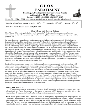 GŁOS PARAFIALNY Parafia p.w. Świętego Krzyża w Jaworznie-Jeleniu ul. Zwycięstwa 33 43-608 Jaworzno konto: 95 1020 2528 0000 0502 0157 8137 Numer 78 27 luty 2011 http://www.parafiajelen.pl e-mail:[email protected] Kancelaria Parafialna czynna: wtorek: 1600 – 1730 czwartek: 1600 – 1730 sobota: 830 - 1000 Biblioteka Parafialna : w każdą środę 1600 - 1800 Zamyślenia nad Słowem Bożym Mówił Syjon: "Pan mnie opuścił, Pan o mnie zapomniał". Czyż może niewiasta zapomnieć o swym niemowlęciu, ta, która kocha syna swego łona? A nawet, gdyby ona zapomniała, Ja nie zapomnę o tobie. (Iz49,14-15) Od czasu do czasu wstrząsają nami podawane przez media informacje o porzuconych dzieciach, czy o dzieciach, którymi rodzice niewiele się interesują. Wychowuje je ulica i przypadkowe środowisko, często patologiczne. Podobne uczucie do porzuconego czy zapomnianego dziecka targały sercem będącego w niewoli babilońskiej Izraela, Narodu Wybranego. Wielu Izraelitom wydawało się, że ich los jest efektem tego, że Pan, który ich wybrał, o nich zapomniał, porzucił ich. W odpowiedzi Bóg uświadamia Izraelitom, że tak naprawdę, to oni często o Nim w życiu zapominali, porzucając Go dla kultu innych, wydawałoby się po ludzku lepszych bogów. W ten sposób sami załatwili sobie ten los, trafili do niewoli. On przypomina o Swej wierności wobec Izraela, o dobrej pamięci o Swych dzieciach, o ogromnej trosce o ich los. W życiu mogą zawieść tak bliscy człowiekowi ludzie jak matka czy ojciec, ale nie On, Bóg. On nigdy o nich nie zapomni, bo On nie może przestać kochać. On z Nimi powędrował na wygnanie, do niewoli, aby pomóc im uznać swój grzech, swą niewierność, nawrócić się, czyli jakby narodzić się na nowo i być gotowymi do powrotu na ojczyzny łono, aby rozpocząć jakościowo nowe życie. Czy jeżeli jestem matką czy ojcem żywo się interesuję losem swoich dzieci, aktywnie uczestniczę w ich wychowaniu, staram się skutecznie chronić je przed patologiami tego świata? Czy kocham swoje dzieci teoretycznie i praktycznie? Czy jako przełożona, przełożony dbam o swoich podwładnych czy podwładne, jako szef, szefowa o swych pracowników, pracownice? Być może w życiu przeżyłem już chwile, kiedy wydawało się mi, że Bóg o mnie zapomniał. Czy potrafię sobie uświadomić ogromne połacie czasu, może nawet całe dnie, tygodnie, miesiące, lata, w których ja zapomniałem o Panu Bogu, porzuciłem Go dla tzw. bożków tego świata? Czy systematycznie ćwiczę "pamięć" swego serca, pamięć o Bogu Jedynym? Jakie czynię starania, aby nie ulec propagandzie tego świata i nie porzucić Boga dla po ludzku atrakcyjniejszych kultów? Czy pamiętam, mocno pamiętam, że zapominać o Panu Bogu, to powoli zacierać w sobie Boże podobieństwo, tracić swoją tożsamość, odcinać się od swych korzeni co prowadzi do niewoli zdecydowanie gorszej od egipskiej czy babilońskiej, do niewoli grzechu? JAN PAWEŁ II WIELKI W dzisiejszym numerze zamieszczamy fragmenty homilii papieskiej wygłoszonej w czasie Mszy Św. odprawionej na Placu Zwycięstwa - Warszawa, 2 czerwca 1979. Pamiętnej homilii, która była przyczynkiem do zmian ustrojowych, jakie niedługo po tym wydarzeniu nastąpiły. Niech będzie pochwalony Jezus Chrystus! Razem z wami pragnę wyśpiewać pieśń dziękczynienia dla Opatrzności, która pozwala mi dziś jako pielgrzymowi stanąć na tym miejscu. Pragnął - wiemy, że bardzo gorąco pragnął - stanąć na ziemi polskiej, przede wszystkim na Jasnej Górze, zmarły niedawno papież Paweł VI. Pierwszy po wielu stuleciach papież-pielgrzym. Do końca życia nosił to pragnienie w swoim sercu i z nim zszedł do grobu. I oto czujemy, że pragnienie to było tak potężne i tak głęboko uzasadnione, że przerosło ramy jednego pontyfikatu i - w sposób po ludzku trudny do przewidzenia - realizuje się dzisiaj. Czyż moja pielgrzymka do Ojczyzny w roku, w którym Kościół w Polsce obchodzi dziewięćsetną rocznicę śmierci św. Stanisława, nie jest zarazem jakimś szczególnym znakiem naszego polskiego pielgrzymowania poprzez dzieje Kościoła - nie tylko po szlakach naszej Ojczyzny, ale zarazem Europy i świata? Odsuwam tutaj na bok moją własną osobę - niemniej muszę wraz z wami wszystkimi stawiać sobie pytanie o motyw, dla którego właśnie w roku 1978 (po tylu stuleciach ustalonej w tej dziedzinie tradycji) został na rzymską stolicę św. Piotra wezwany syn polskiego narodu, polskiej ziemi. Od Piotra, jak i od wszystkich apostołów Chrystus żądał, aby byli Jego "świadkami w Jerozolimie i w całej Judei, i w Samarii, i aż po krańce ziemi" (Dz 1,8). Czyż przeto nawiązując do tych Chrystusowych słów, nie wolno nam wnosić zarazem, że Polska stała się w naszych czasach ziemią szczególnie odpowiedzialnego świadectwa? Że właśnie stąd - z Warszawy, a także z Gniezna, z Jasnej Góry, z Krakowa, z całego tego historycznego szlaku, który tyle razy nawiedzałem w swoim życiu i który w tych dniach znów będę miał szczęście nawiedzić, że właśnie stąd ze szczególną pokorą, ale i ze szczególnym przekonaniem trzeba głosić Chrystusa? Że właśnie tu, na tej ziemi, na tym szlaku, trzeba stanąć, aby odczytać świadectwo Jego Krzyża i Jego Zmartwychwstania? Ale, umiłowani rodacy - jeśli przyjąć to wszystko, co w tej chwili ośmieliłem się wypowiedzieć - jakżeż ogromne z tego rodzą się zadania i zobowiązania! Czy do nich naprawdę dorastamy? Dobrze się stało, że moja pielgrzymka do Polski, związana z dziewięćsetną rocznicą męczeńskiej śmierci św. Stanisława, wypadła w okresie Zesłania Ducha Świętego oraz uroczystości Trójcy Przenajświętszej. W taki bowiem sposób mogę, dopełniając jakby pośmiertnie pragnienia Pawła VI, przeżyć raz jeszcze tysiąclecie chrztu na ziemi polskiej i wpisać tegoroczny Stanisławowy jubileusz w to tysiąclecie, z którego wz