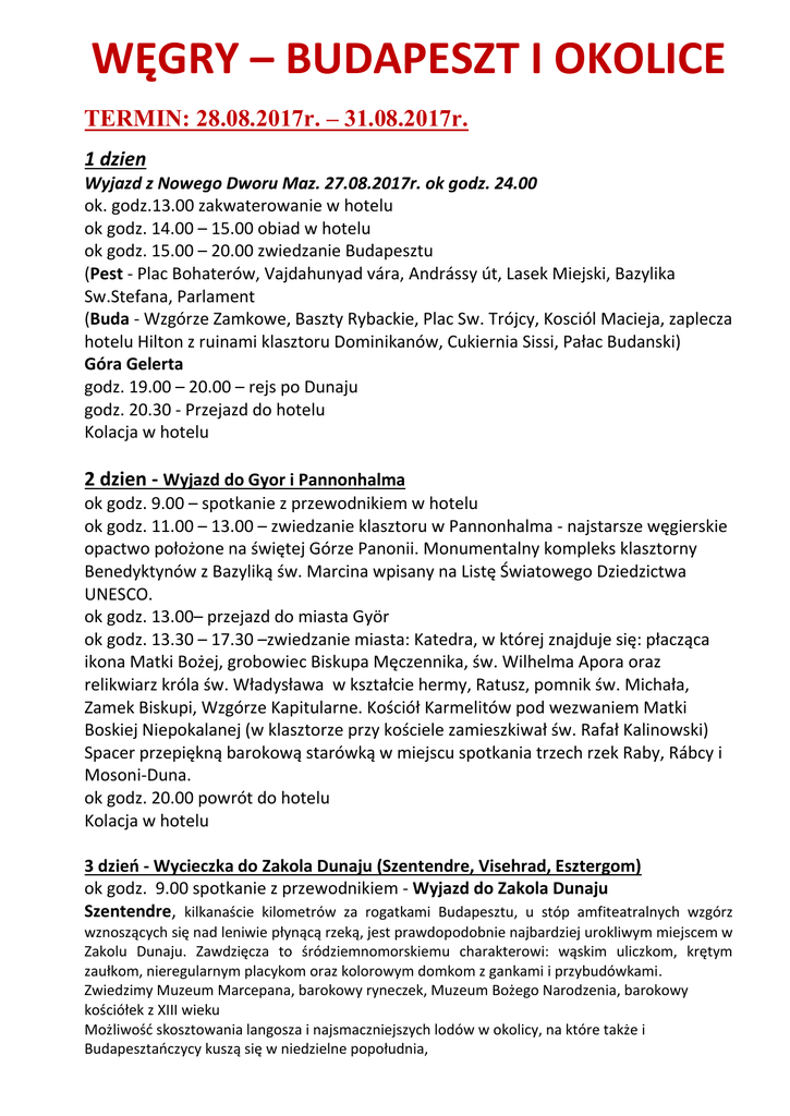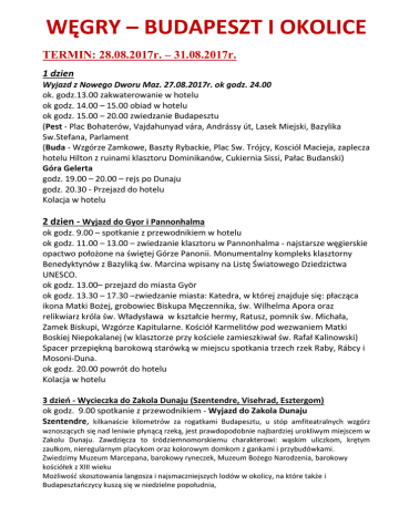 WĘGRY – BUDAPESZT I OKOLICE TERMIN: 28.08.2017r. – 31.08.2017r. 1 dzien Wyjazd z Nowego Dworu Maz. 27.08.2017r. ok godz. 24.00 ok. godz.13.00 zakwaterowanie w hotelu ok godz. 14.00 – 15.00 obiad w hotelu ok godz. 15.00 – 20.00 zwiedzanie Budapesztu (Pest - Plac Bohaterów, Vajdahunyad vára, Andrássy út, Lasek Miejski, Bazylika Sw.Stefana, Parlament (Buda - Wzgórze Zamkowe, Baszty Rybackie, Plac Sw. Trójcy, Kosciól Macieja, zaplecza hotelu Hilton z ruinami klasztoru Dominikanów, Cukiernia Sissi, Pałac Budanski) Góra Gelerta godz. 19.00 – 20.00 – rejs po Dunaju godz. 20.30 - Przejazd do hotelu Kolacja w hotelu 2 dzien - Wyjazd do Gyor i Pannonhalma ok godz. 9.00 – spotkanie z przewodnikiem w hotelu ok godz. 11.00 – 13.00 – zwiedzanie klasztoru w Pannonhalma - najstarsze węgierskie opactwo położone na świętej Górze Panonii. Monumentalny kompleks klasztorny Benedyktynów z Bazyliką św. Marcina wpisany na Listę Światowego Dziedzictwa UNESCO. ok godz. 13.00– przejazd do miasta Györ ok godz. 13.30 – 17.30 –zwiedzanie miasta: Katedra, w której znajduje się: płacząca ikona Matki Bożej, grobowiec Biskupa Męczennika, św. Wilhelma Apora oraz relikwiarz króla św. Władysława w kształcie hermy, Ratusz, pomnik św. Michała, Zamek Biskupi, Wzgórze Kapitularne. Kościół Karmelitów pod wezwaniem Matki Boskiej Niepokalanej (w klasztorze przy kościele zamieszkiwał św. Rafał Kalinowski) Spacer przepiękną barokową starówką w miejscu spotkania trzech rzek Raby, Rábcy i Mosoni-Duna. ok godz. 20.00 powrót do hotelu Kolacja w hotelu 3 dzień - Wycieczka do Zakola Dunaju (Szentendre, Visehrad, Esztergom) ok godz. 9.00 spotkanie z przewodnikiem - Wyjazd do Zakola Dunaju Szentendre, kilkanaście kilometrów za rogatkami Budapesztu, u stóp amfiteatralnych wzgórz wznoszących się nad leniwie płynącą rzeką, jest prawdopodobnie najbardziej urokliwym miejscem w Zakolu Dunaju. Zawdzięcza to śródziemnomorskiemu charakterowi: wąskim uliczkom, krętym zaułkom, nieregularnym placykom oraz kolorowym domkom z gankami i przybudówkami. Zwiedzimy Muzeum Marcepana, barokowy ryneczek, Muzeum Bożego Narodzenia, barokowy kościółek z XIII wieku Możliwość skosztowania langosza i najsmaczniejszych lodów w okolicy, na które także i Budapesztańczycy kuszą się w niedzielne popołudnia, Wyszegrad - Wycieczka nad zakole Dunaju do Wyszegradu będzie z pewnością jedną z bardziej malowniczych wypraw, jakie moglibyśmy odbyć w okolicach Budapesztu. Prowadzi bowiem przez niezwykle piękne okolice wzgórz Wyszegradzkich, z których to rozpościerają się zapierające dech w piersiach widoki na królową europejskich rzek, snującą się leniwie środkiem szerokiej doliny. Uroki zakola Dunaju, jak również strategicznie korzystne usytuowanie Wyszegradu docenili już starożytni Rzymianie, wznosząc na jego terenie twierdzę Ponte Navata. Zamieszkujące okolicę ludy słowiańskie nazywały ją w swoim języku "Vise Grad", czyli Wysoki Zamek, która to nazwa zakorzeniła się i przetrwała do dziś. O dawnej potędze i znaczeniu Wyszegradu świadczą dziś tylko fragmenty oryginalnych i zrekonstruowanych fortyfikacji, ponieważ osada sama w sobie jest naprawdę niewielka i trudno uwierzyć, że przez pewien okres była stolicą Węgier. Na szczęście rząd nie szczędził funduszy na odbudowę zniszczonego pałacu królewskiego i cytadeli i z roku na rok odwiedzający to miejsce turyści mogą lepiej poznać jego historię. Esztergom jest jednym z najczęściej odwiedzanych przez polskich turystów miasteczek leżących w pobliżu Budapesztu. Znany jest pod nazwą Ostrzyhom i leży w przepięknym krajobrazowo zakolu Dunaju. Oddalony od stolicy Węgier o zaledwie 50 km, kusi swą niezwykłą historią i zachęca do wizyty w największej pod względem wielkości na Węgrzech (i piątej na świecie) bazylice oraz do oglądnięcia ruin zamku królewskiego z okresu panowania dynastii Árpádów. Powrót do Budapesztu Po drodze Wyspa Sw. Malgorzaty -przejazd kolejka po wyspie i obejrzenie ruin klasztoru św. Małgorzaty Powrót do hotelu ok. 18.30 ok godz. 19.30 – kolacja z folklorem 4 dzien Wyjazd do Marianostra ok godz. 9.00 – spotkanie z przewodnikiem w hotelu Zwiedzanie Marianostra - klasztor ojców Paulinów, którzy założyli sanktuarium na Jasnej Górze w Częstochowie. Znajduje się tu Obraz Matki Bożej – Wielkiej Pani Węgier – XVIII-wieczna kopia cudownego obrazu Matki Bożej Częstochowskiej. ok godz. – 13.00 – powrót do Budapesztu ok godz. 13.30 – 15.00 – Hala Targowa, „mekka dla turystów”, możliwość zakupów i indywidualnego posilku Wyjazd do Polski KOSZT NA JEDNEGO UCZESTNIKA – 960,00 zł I rata II rata III rata IV rata V rata – 100 zł przy zapisie – 200 zł do 31.03.2017r. – 200 zł do 31.05.2017r. – 200 zł do 30.06.2017r. – 260 zł do 15.08.2017r. ZAPISY DO 31.01.2017r. W cenie: bilety wstępu, transport, przewodnik, nocleg, wyżywienie