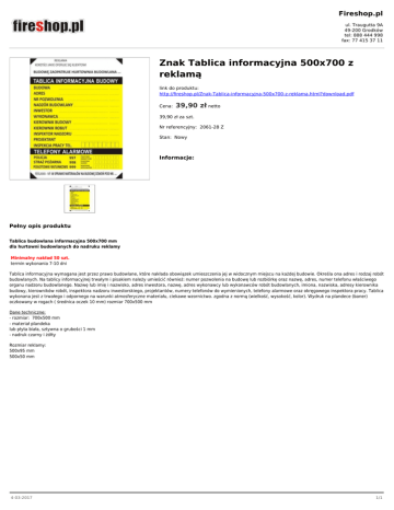 Fireshop.pl ul. Traugutta 9A 49-200 Grodków tel: 888 444 998 fax: 77 415 37 11 Znak Tablica informacyjna 500x700 z reklamą link do produktu: http://fireshop.pl/Znak-Tablica-informacyjna-500x700-z-reklama.html?download.pdf Cena: 39,90 zł netto 39,90 zł za szt. Nr referencyjny: 2061-28 Z Stan: Nowy Informacje: Pełny opis produktu Tablica budowlana informacyjna 500x700 mm dla hurtowni budowlanych do nadruku reklamy Minimalny nakład 50 szt. termin wykonania 7-10 dni Tablica informacyjna wymagana jest przez prawo budowlane, które nakłada obowiązek umieszczenia jej w widocznym miejscu na każdej budowie. Określa ona adres i rodzaj robót budowlanych. Na tablicy informacyjnej trwałym i pisakiem należy umieścić również: numer pozwolenia na budowę lub rozbiórkę oraz nazwę, adres, numer telefonu właściwego organu nadzoru budowlanego. Nazwę lub imię i nazwisko, adres inwestora, nazwę, adres wykonawcy lub wykonawców robót budowlanych, imiona, nazwiska, adresy kierownika budowy, kierowników robót, inspektora nadzoru inwestorskiego, projektantów, numery telefonów do wymienionych, telefony alarmowe oraz okręgowego inspektora pracy. Tablica wykonana jest z trwałego i odpornego na warunki atmosferyczne materiału, ciekawe wzornictwo. zgodna z normą (wielkość, wysokość, kolor). Wydruk na plandece (baner) oczkowany w rogach ( średnica oczek 10 mm) rozmiar 700x500 mm Dane techniczne: - rozmiar: 700x500 mm - materiał plandeka lub płyta biała, sztywna o grubości 1 mm - nadruk czarny i żółty Rozmiar reklamy: 500x95 mm 500x50 mm 4-03-2017 1/1