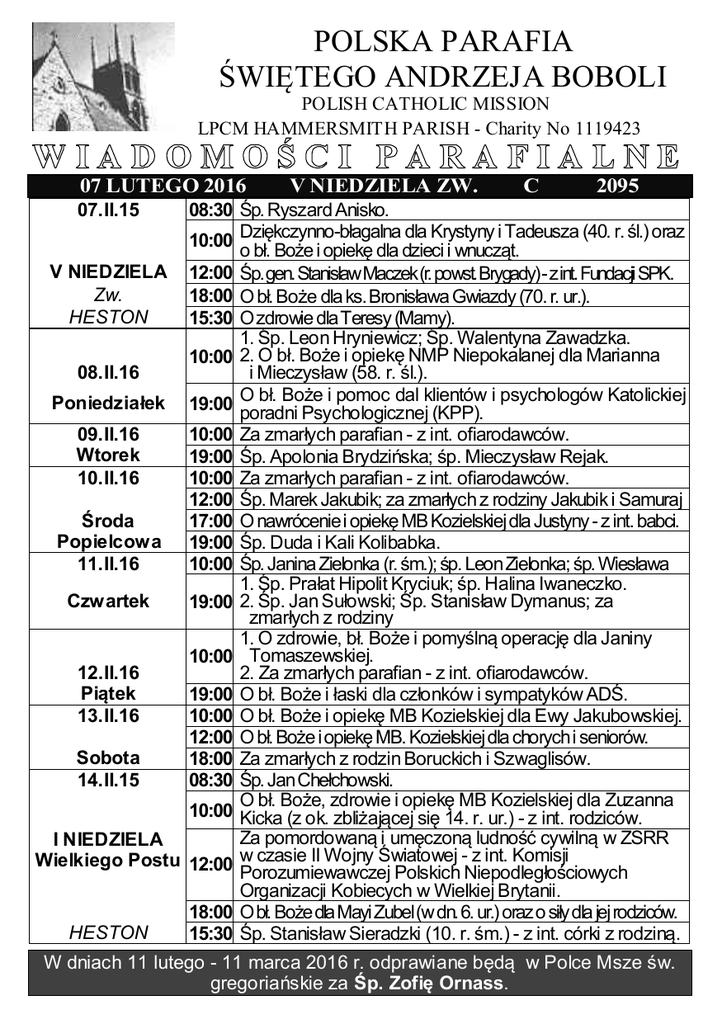 POLSKA PARAFIA ŚWIĘTEGO ANDRZEJA BOBOLI POLISH CATHOLIC MISSION LPCM HAMMERSMITH PARISH - Charity No 1119423 07 LUTEGO 2016 V NIEDZIELA ZW. C 2095 08:30 Śp. Ryszard Anisko. dla Krystyny i Tadeusza (40. r. śl.) oraz 10:00 Dziękczynno-błagalna o bł. Boże i opiekę dla dzieci i wnucząt. V NIEDZIELA 12:00 Śp. gen. Stanisław Maczek (r. powst. Brygady) - z int. Fundacji SPK. Zw. 18:00 O bł. Boże dla ks. Bronisława Gwiazdy (70. r. ur.). HESTON 15:30 O zdrowie dla Teresy (Mamy). 1. Śp. Leon Hryniewicz; Śp. Walentyna Zawadzka. 10:00 2. O bł. Boże i opiekę NMP Niepokalanej dla Marianna 08.II.16 i Mieczysław (58. r. śl.). O Poniedziałek 19:00 bł. Boże i pomoc dal klientów i psychologów Katolickiej poradni Psychologicznej (KPP). 09.II.16 10:00 Za zmarłych parafian - z int. ofiarodawców. Wtorek 19:00 Śp. Apolonia Brydzińska; śp. Mieczysław Rejak. 10.II.16 10:00 Za zmarłych parafian - z int. ofiarodawców. 12:00 Śp. Marek Jakubik; za zmarłych z rodziny Jakubik i Samuraj Środa 17:00 O nawrócenie i opiekę MB Kozielskiej dla Justyny - z int. babci. Popielcowa 19:00 Śp. Duda i Kali Kolibabka. 11.II.16 10:00 Śp. Janina Zielonka (r. śm.); śp. Leon Zielonka; śp. Wiesława 1. Śp. Prałat Hipolit Kryciuk; śp. Halina Iwaneczko. Czwartek 19:00 2. Śp. Jan Sułowski; Śp. Stanisław Dymanus; za zmarłych z rodziny 1. O zdrowie, bł. Boże i pomyślną operację dla Janiny 10:00 Tomaszewskiej. 12.II.16 2. Za zmarłych parafian - z int. ofiarodawców. Piątek 19:00 O bł. Boże i łaski dla członków i sympatyków ADŚ. 13.II.16 10:00 O bł. Boże i opiekę MB Kozielskiej dla Ewy Jakubowskiej. 12:00 O bł. Boże i opiekę MB. Kozielskiej dla chorych i seniorów. Sobota 18:00 Za zmarłych z rodzin Boruckich i Szwaglisów. 14.II.15 08:30 Śp. Jan Chełchowski. O bł. Boże, zdrowie i opiekę MB Kozielskiej dla Zuzanna 10:00 Kicka (z ok. zbliżającej się 14. r. ur.) - z int. rodziców. Za pomordowaną i umęczoną ludność cywilną w ZSRR I NIEDZIELA Wielkiego Postu 12:00 w czasie II Wojny Światowej - z int. Komisji Porozumiewawczej Polskich Niepodległościowych Organizacji Kobiecych w Wielkiej Brytanii. 18:00 O bł. Boże dla Mayi Zubel (w dn. 6. ur.) oraz o siły dla jej rodziców. HESTON 15:30 Śp. Stanisław Sieradzki (10. r. śm.) - z int. córki z rodziną. 07.II.15 W dniach 11 lutego - 11 marca 2016 r. odprawiane będą w Polce Msze św. gregoriańskie za Śp. Zofię Ornass. Dziś ks. Bronisław kończy 70 lat życia! HAPPY BIRTHDAY TO YOU!!! NIEDZIELA 07 LUTEGO 2016 – I NIEDZIELA MIESIĄCA 09:00-13:30: zapraszamy do Kawiarni i sklepiku. 11.00 i 13:00, kaplica MB: zmiana tajemnic różańcowych. 15.15, HESTON: Koronka do B. Miłosierdzia. 16.30, HESTON: Zmiana tajemnic różańcowych. 16:00, kawiarnia: Warsztaty Odnowy Wiary – spotkanie 4. 17.30, kościół: Nieszpory eucharystyczne. 19:00, sala św. Józefa: film „Odważni” i spotkanie organizacyjne „Mężczyźni św. Józefa”. PONIEDZIALEK 08 LUTEGO 2016 19:00, kawiarnia: Spotkanie Lektorów. WTOREK 09 LUTEGO 2016 12:00, sala św. Józefa: „Złote Rybki” czyli spotkanie mam/opiekunów i małych dzieci. 20:00, salka: Spotkanie polskiej grupy AA (Basement, 18 Greenside Road, W12). ŚRODA 10 LUTEGO 2016 - ŚRODA POPIELCOWA 10:00, 12:00, 17:00 i 19:00, kościół: Msze z obrzędem posypania głów popiołem 18:30, sala św. Józefa i kawiarnia: próba Scholi. 19:30, kaplica MB: Nabożeństwo do MB Kozielskiej. CZWARTEK 11 LUTEGO 2016 12:00, sala św. Józefa: „Złote Rybki” czyli spotkanie mam/opiekunów i małych dzieci. 19:30-21:00, kaplica MB: adoracja Najśw. Sakramentu. 20:00, salka: Spotkania WŻCh. PIĄTEK 12 LUTEGO 2016 10:30, kościół: Droga Krzyżowa dla „2. zmiany” i Koronka do M. Bożego. 19:30, kościół: nabożeństwo Drogi Krzyżowej (prowadzi: Jezu ufam Tobie). 20:00, kawiarnia: Grupa Wielbienia. SOBOTA 13 LUTEGO 2016 11.45, kolumbarium: pochowanie prochów śp. Szymon Zaręba. 12:00, kościół i kawiarnia: Parafialny dzień Chorych (Sekcja Charytatywna). 17:00, kaplica MB: katecheza chrzcielna na kwiecień 2016. NIEDZIELA 14 LUTEGO 2016 I Niedziela Wielkiego Postu 09:00-13:30: zapraszamy do Kawiarni i sklepiku. 15.15, HESTON: Koronka do B. Miłosierdzia. 16.00, HESTON: Droga Krzyżowa. 16:00, kawiarnia: Warsztaty Odnowy Wiary – spotkanie 5. 17.30, kościół: Gorzkie Żale (cz. I). 19:00, kawiarnia: spotkanie walentynkowe dla Singli (zob. WALENTYNKI 2016) 13-21.02.2016: ks. Marek nieobecny (ferie zimowe). 16, 18, 23 i 25.02.16, 10:00 – 12:00, sala św. Józefa: „Złote Rybki” czyli spotkanie mam/opiekunów i małych dzieci. 16 i 23.02.16, 20:00, salka (Basement,18GreensideRoad,W12): Spotkanie polskiej grupy AA. 17 i 24.02.16, 11:00, kawiarnia: Spotkanie Klubu Brydżowego. 19 i 26.02.16, 20:00, salka: Spotkania WŻCh. 18 i 25.02.16, 19:30-21:00, kaplica MB: adoracja Najśw. Sakramentu. 19 i 26.02.16, 20:30, kawiarnia: Grupa Wielbienia. 19 i 26.02.16, 10:30, kościół: Droga Krzyżowa dla „2. zmiany” i Koronka do M. Bożego. 19 i 26.02.16, 19:30, kościół: Nabożeństwo Drogi Krzyżowej (WŻCh). 20.02.16, kościół: Parafialny Dzień Skupienia (zaprasza WŻCh). 21 i 28.02.16, 16:00, kawiarnia: Warsztaty Odnowy Wiary (zaprasza GALILEA). 21, 28.02.16, 17:30, kościół: Gorzkie Żale. 22-26.02.16: Parafialna Pielgrzymka do o. Pio (organizator: ks. Wiesław). 24.02.16, 18:30, sala św. Józefa i kawiarnia: próba Scholi. 26.02.16, 20:00, salka: spotkanie dla członków Spotkań Małżeńskich. 27.02.16, Coventry: Kurs Wiedzy Religijnej (poprowadzi: ks. prof. Dariusz Kowalczyk). 28.02.16, kościół: II miesięczna taca na fundusz remontowy kościoła. 28.02.16, 19:00, kościół: Wieczór Wielbieniowy. 29.02.16, 20.00, kawiarnia: Spotkanie Rady Administracyjnej. WALENTYNKI 2016 – organizatorzy Warsztatów dla Singli serdecznie zapraszają chętnych i uczestników warsztatów na wspólne spotkanie, które odbędzie się w niedziele 14/02/2016, w kawiarnia, 